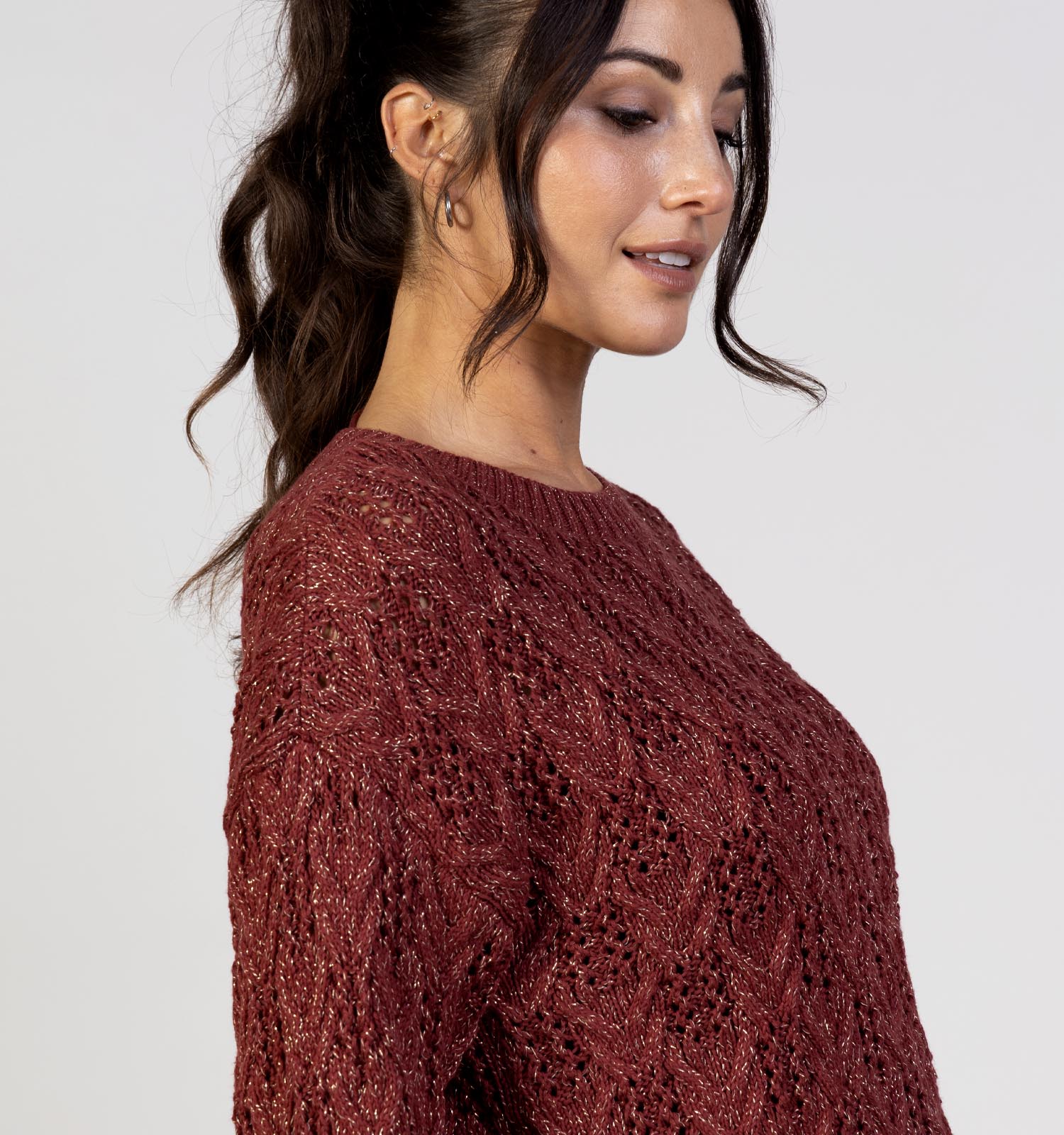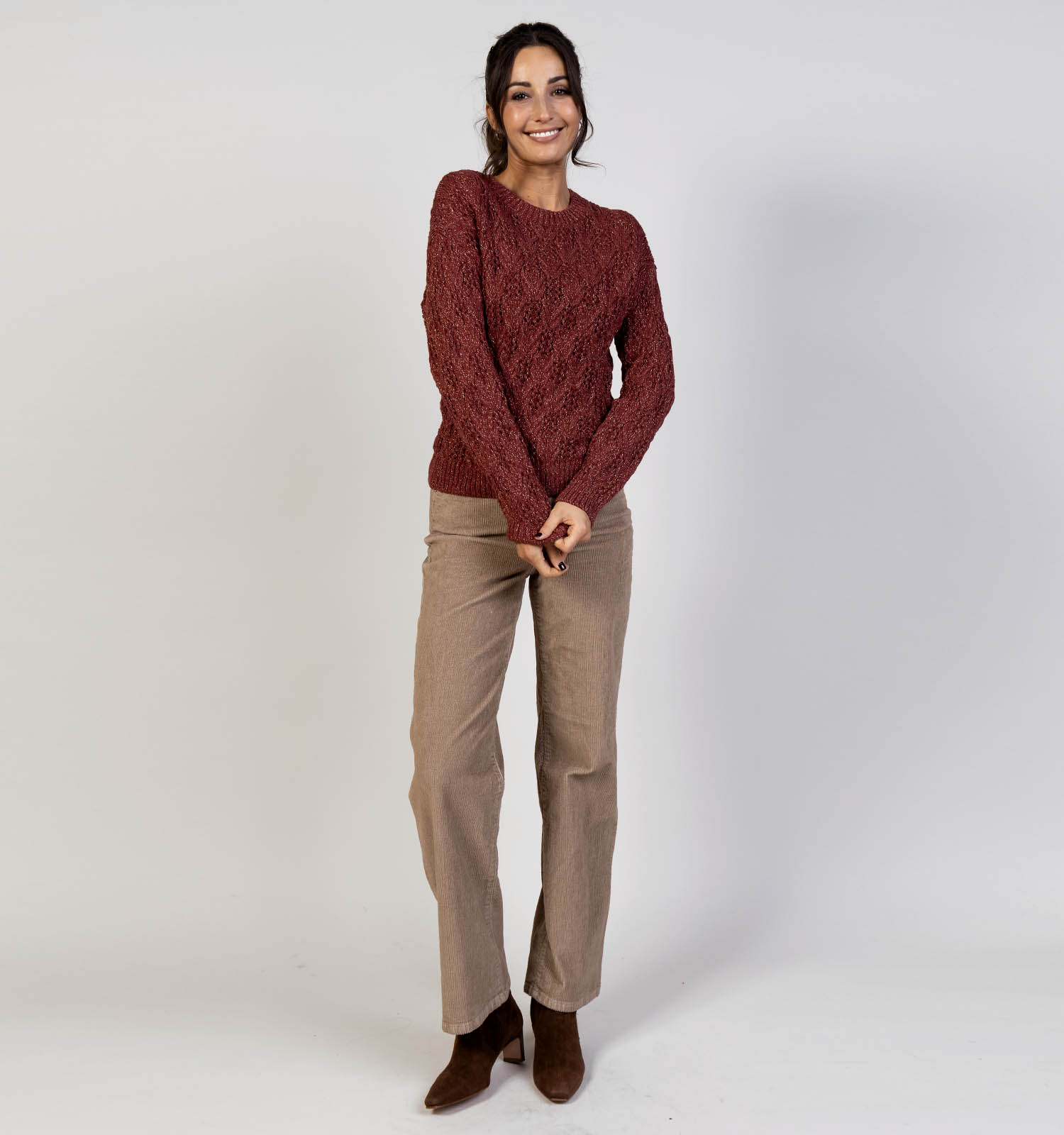 Deze damestrui in de kleur bordeaux heeft een ronde hals en lange mouwen.