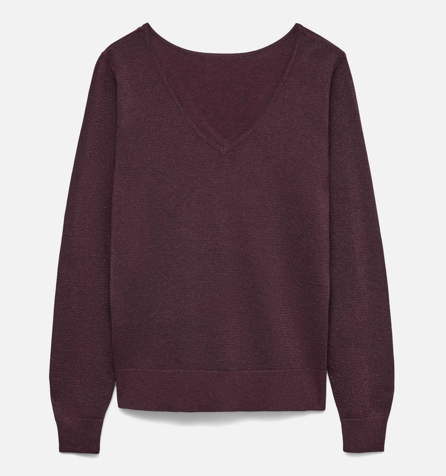 Deze damestrui in de kleur bordeaux heeft een v-hals en lange mouwen.
