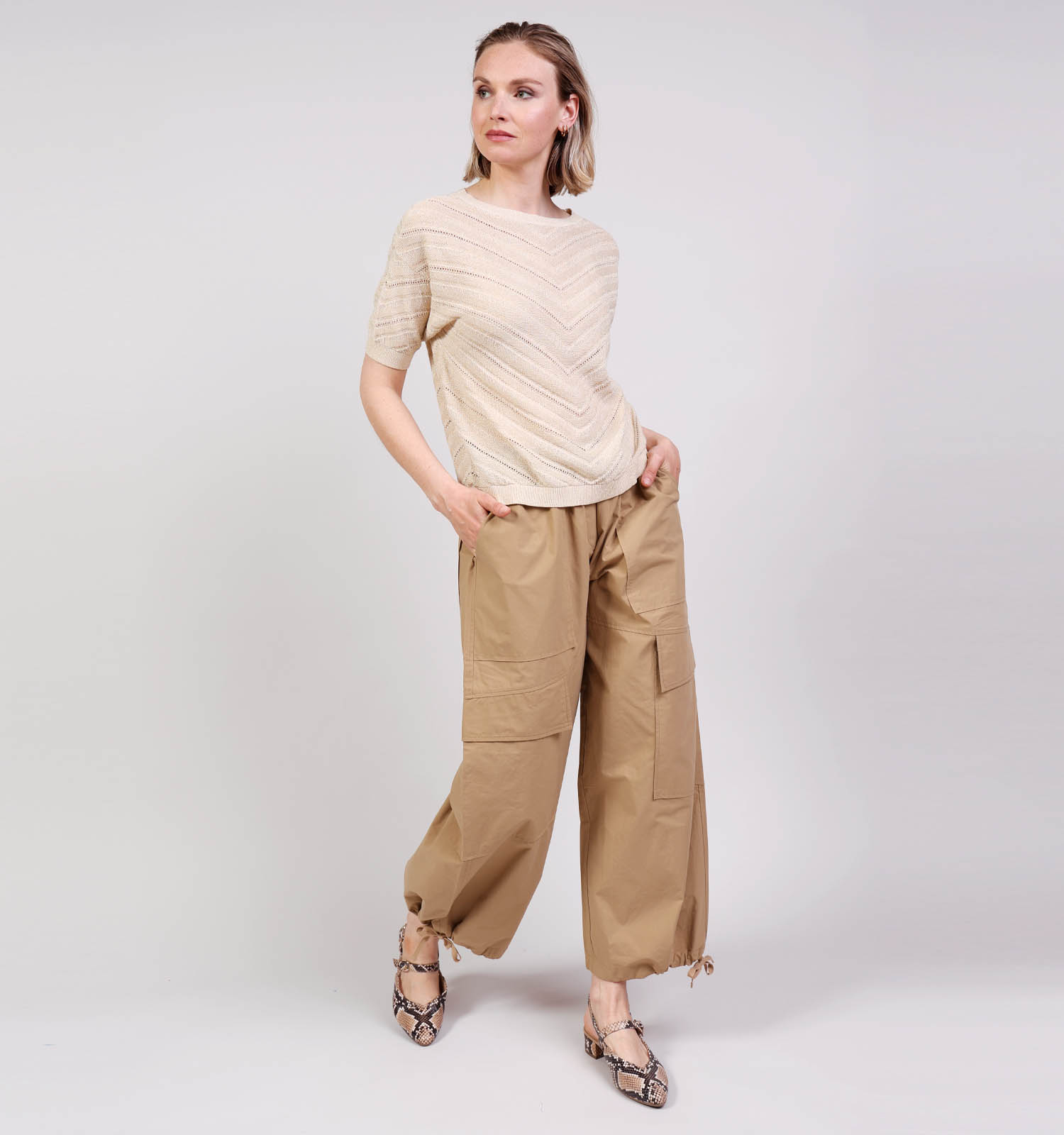 Deze damestrui in de kleur goud heeft een ronde hals en halflange mouwen.