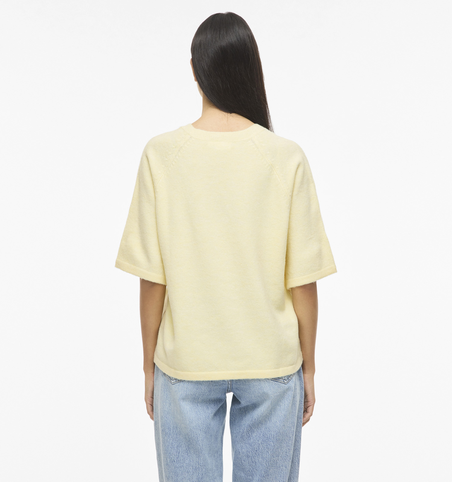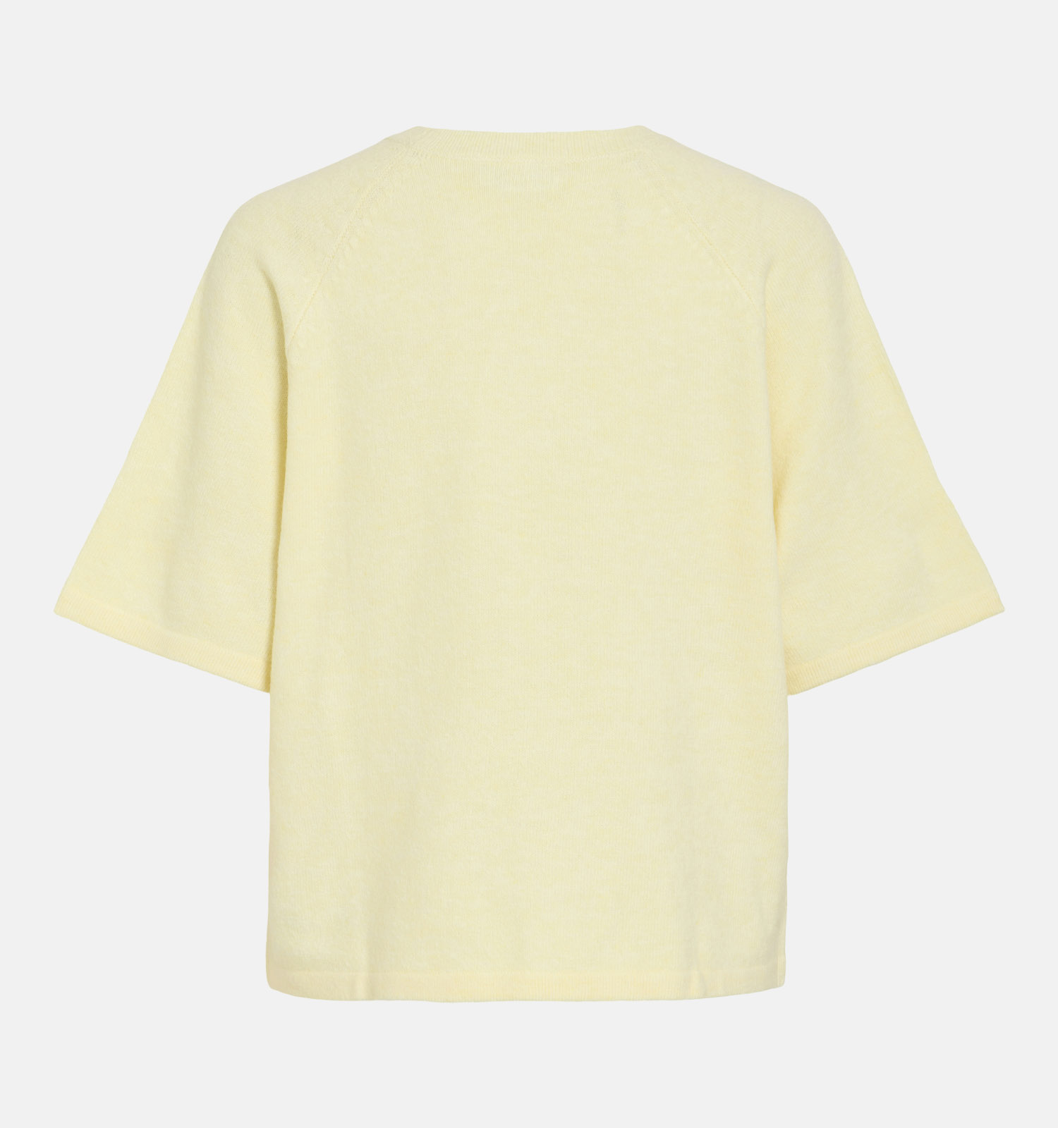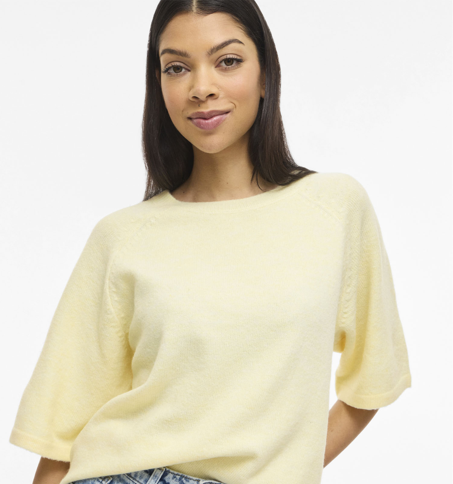 Deze damestrui in de kleur geel heeft een ronde hals en halflange mouwen.