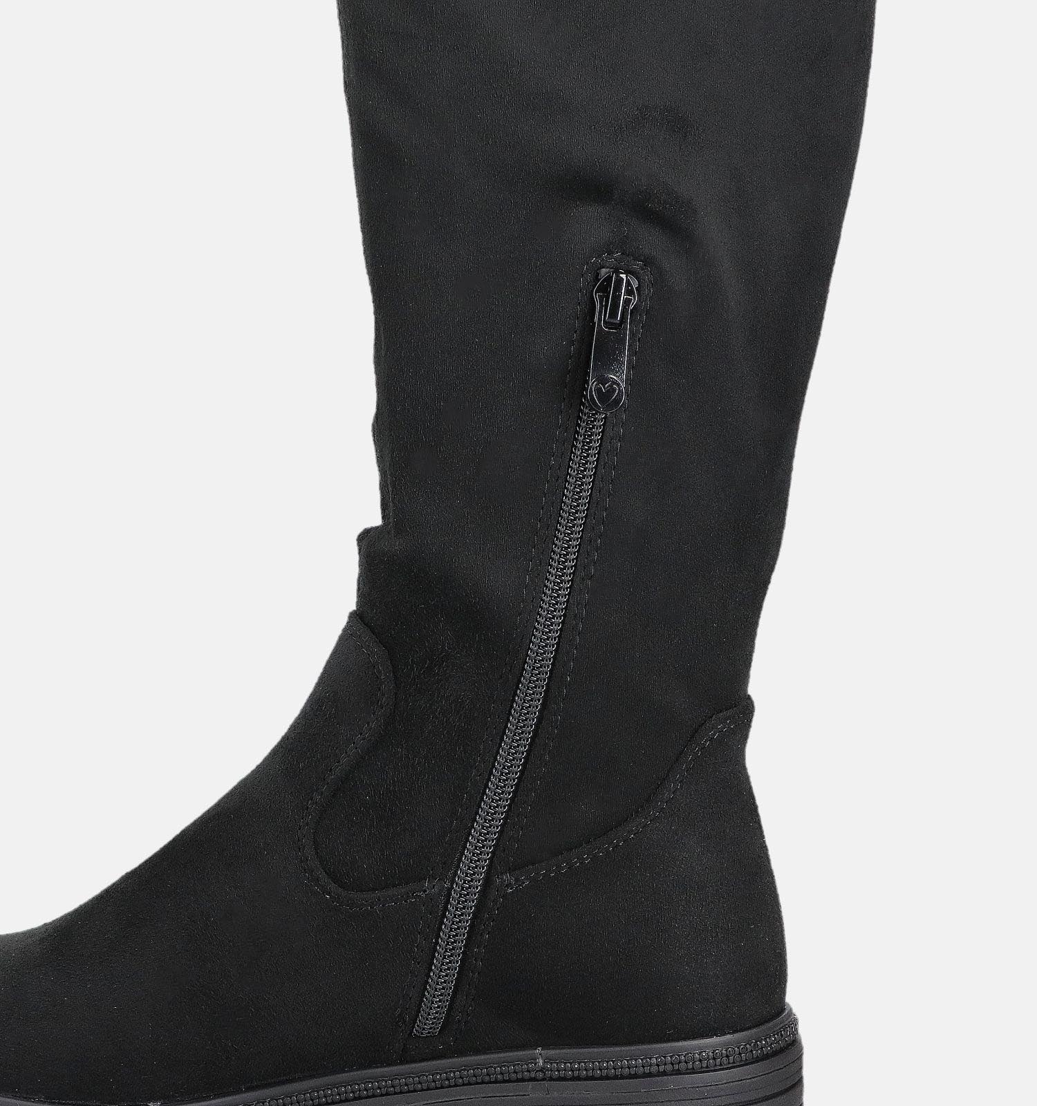 Overkneelaarzen zoals deze zwarte Marco Tozzi laarzen komen, zoals de naam al zegt, tot over de knieën. De schachthoogte van dit leuke model is ongeveer 48 cm. Deze laarzen zitten goed als ze mooi aansluiten op je bovenbenen. Het mag zelfs licht strak aanvoelen, zolang het maar niet spant. Over-the-knee laarzen die te los zitten, zakken namelijk af. Dankzij de instap, ritssluiting trek je deze dameslaarzen makkelijk aan.