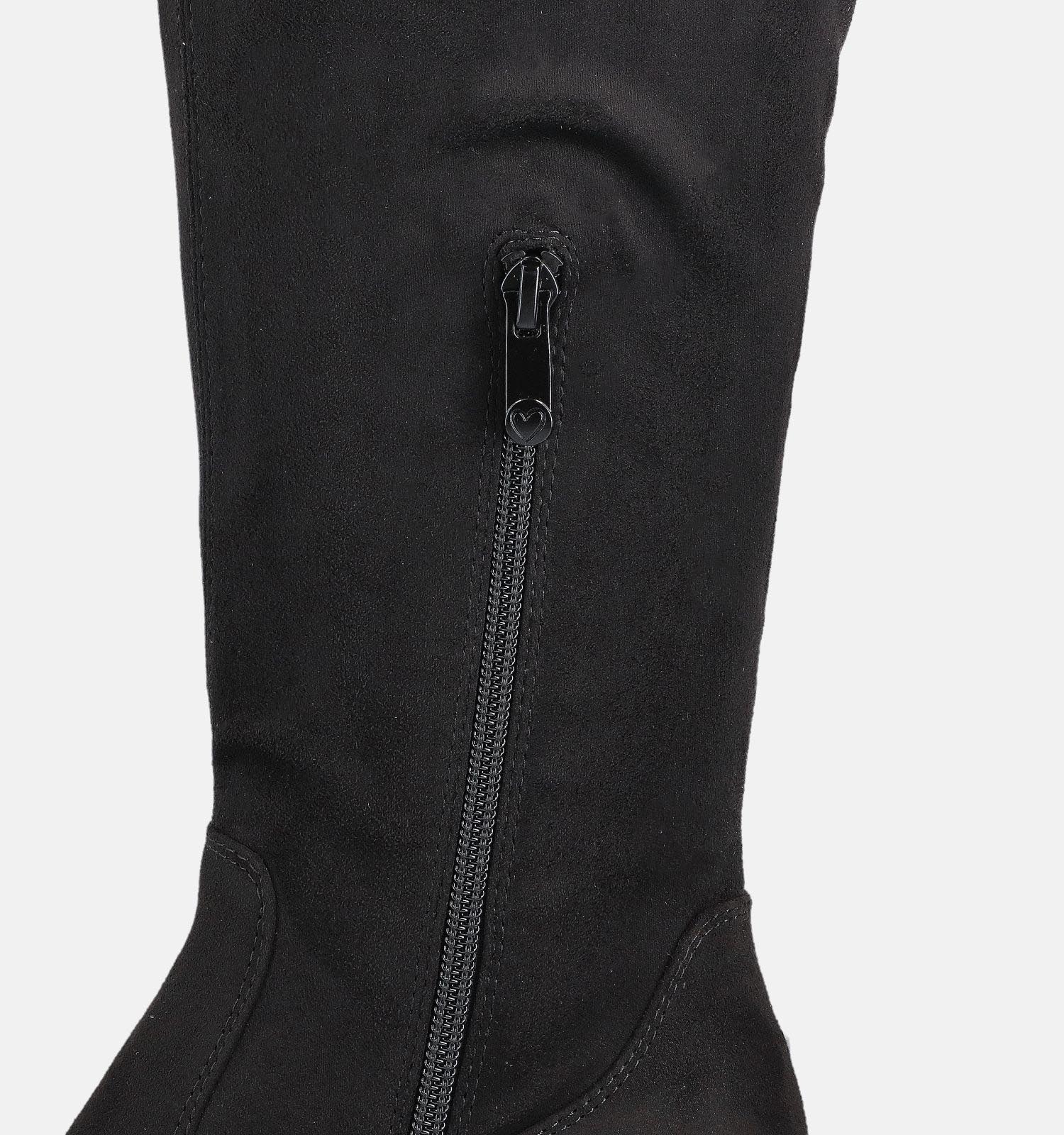 Overkneelaarzen zoals deze zwarte Marco Tozzi laarzen komen, zoals de naam al zegt, tot over de knieën. De schachthoogte van dit leuke model is ongeveer 50 cm. Deze laarzen zitten goed als ze mooi aansluiten op je bovenbenen. Het mag zelfs licht strak aanvoelen, zolang het maar niet spant. Over-the-knee laarzen die te los zitten, zakken namelijk af. Dankzij de instap, ritssluiting trek je deze dameslaarzen makkelijk aan.
