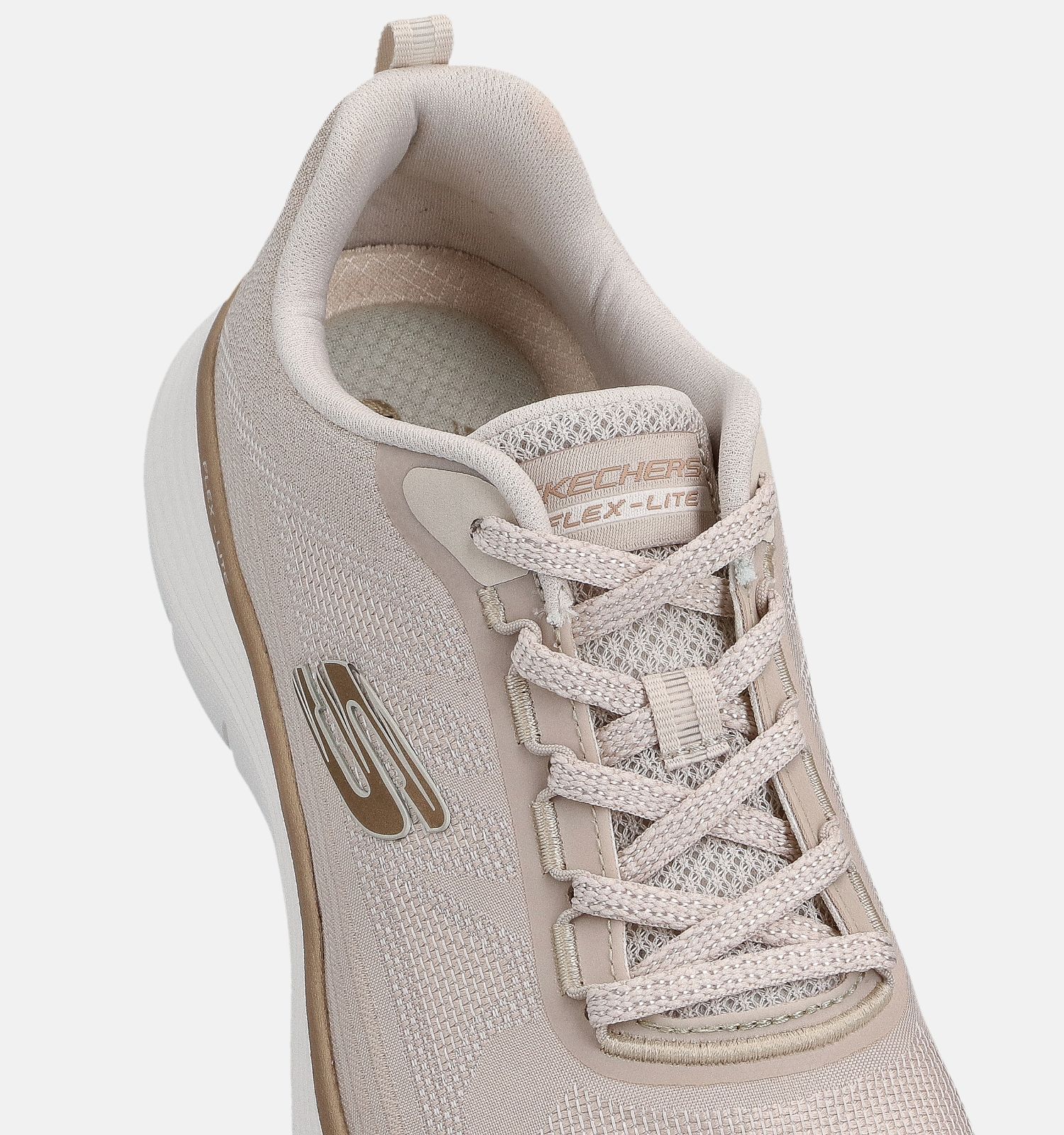 Belangrijk om te weten naar onderhoud toe: deze Skechers sneakers voor dames zijn vervaardigd uit stof binnenin, met versterkt stof aan de buitenkant. Dit witte exemplaar heeft een vetersluiting.