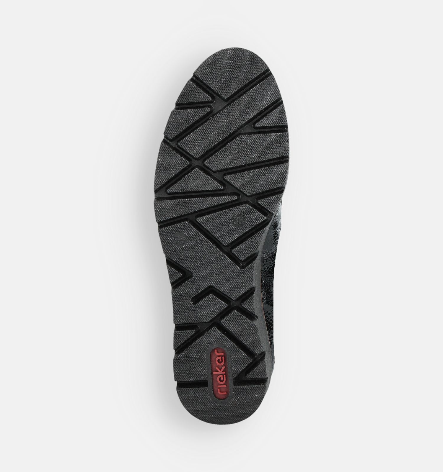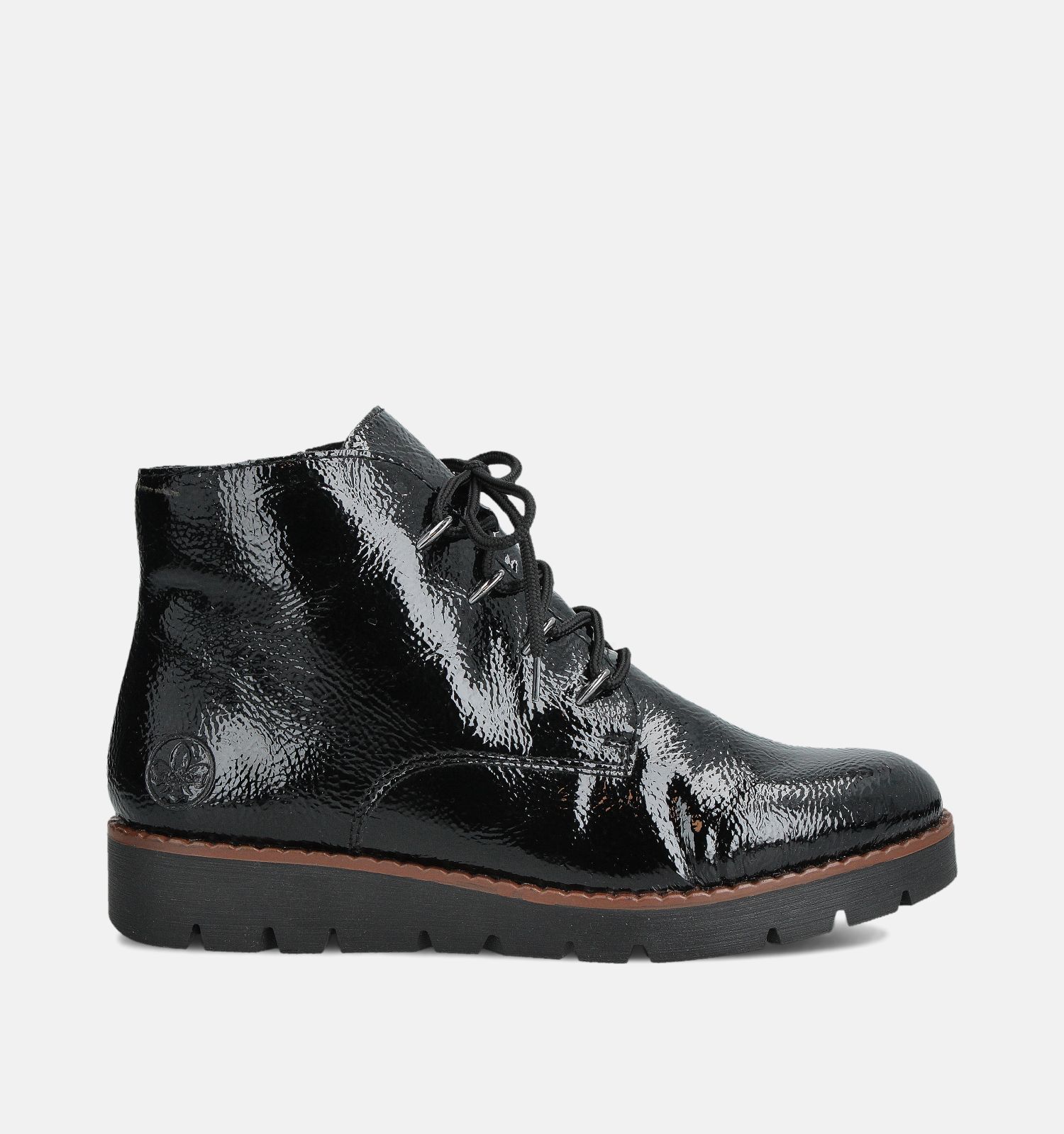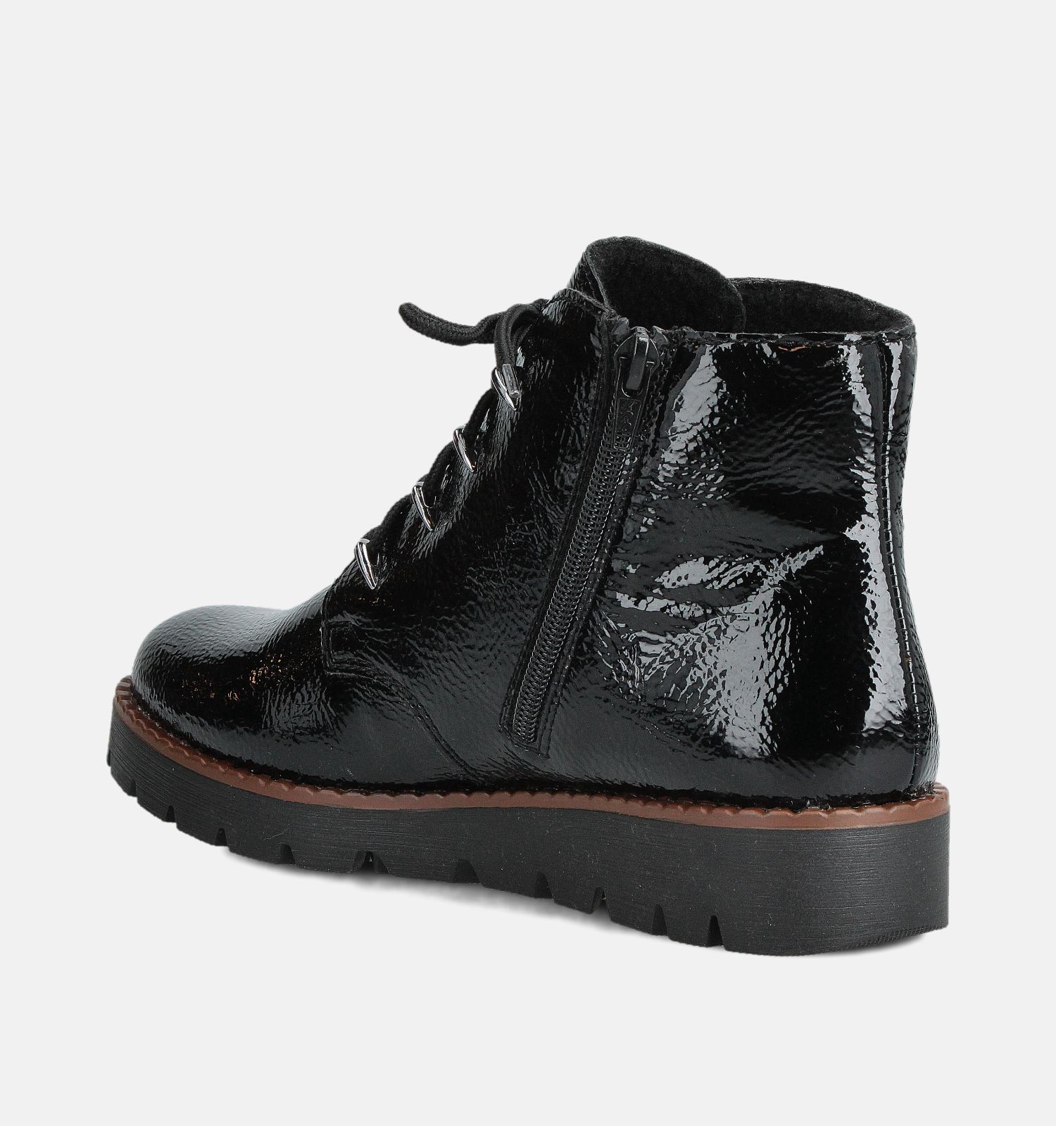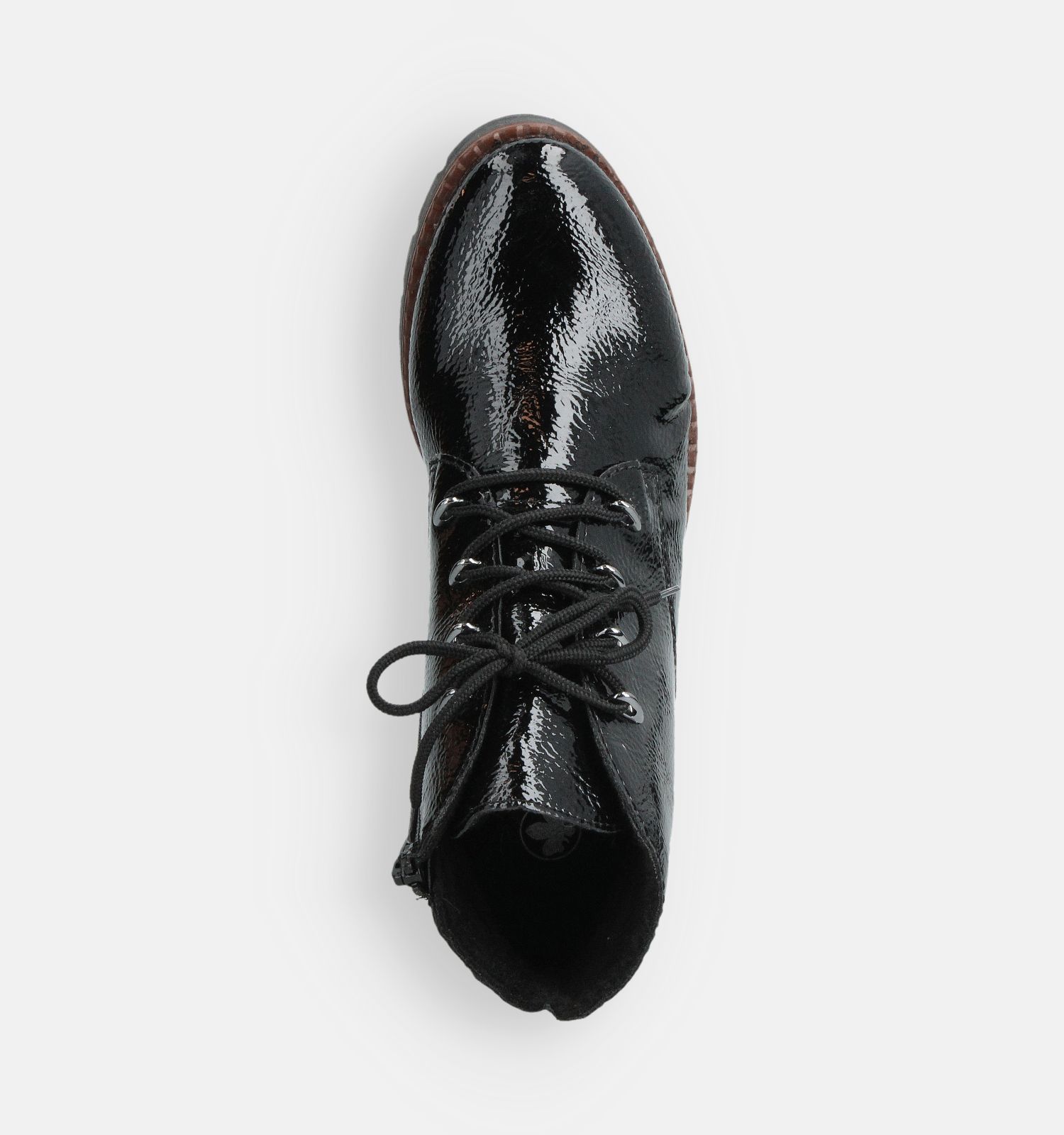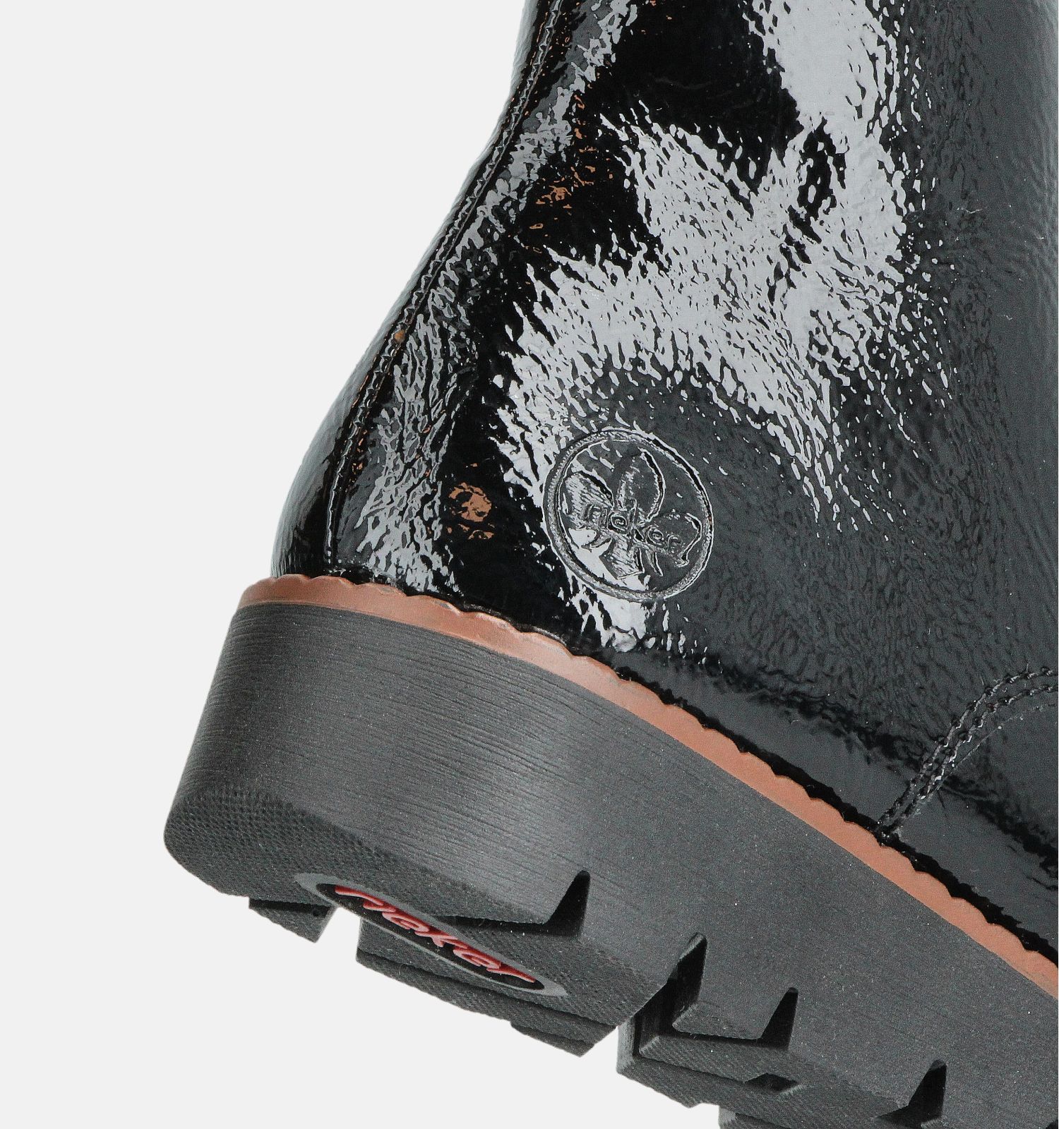 Deze boots in de kleur zwart zijn vervaardigd uit sterk lak, met zacht stof aan de binnenkant. Deze materialen hebben een extra licht gewicht, een antidotum tegen dat herkenbare gevoel dat jouw voeten na een tijd zwaar beginnen aan te voelen. De ergonomische pasvorm van deze Rieker damesboots houdt ook rekening met het feit dat alle voeten licht opzwellen tegen het einde van de dag. Zo ervaar je de hele dag door optimaal comfort! Deze Rieker boots voor dames hebben een rits & vetersluiting.