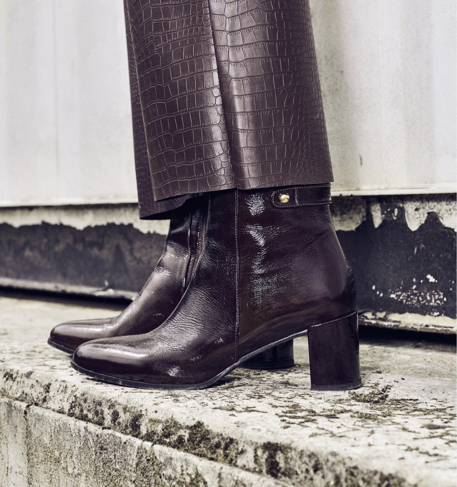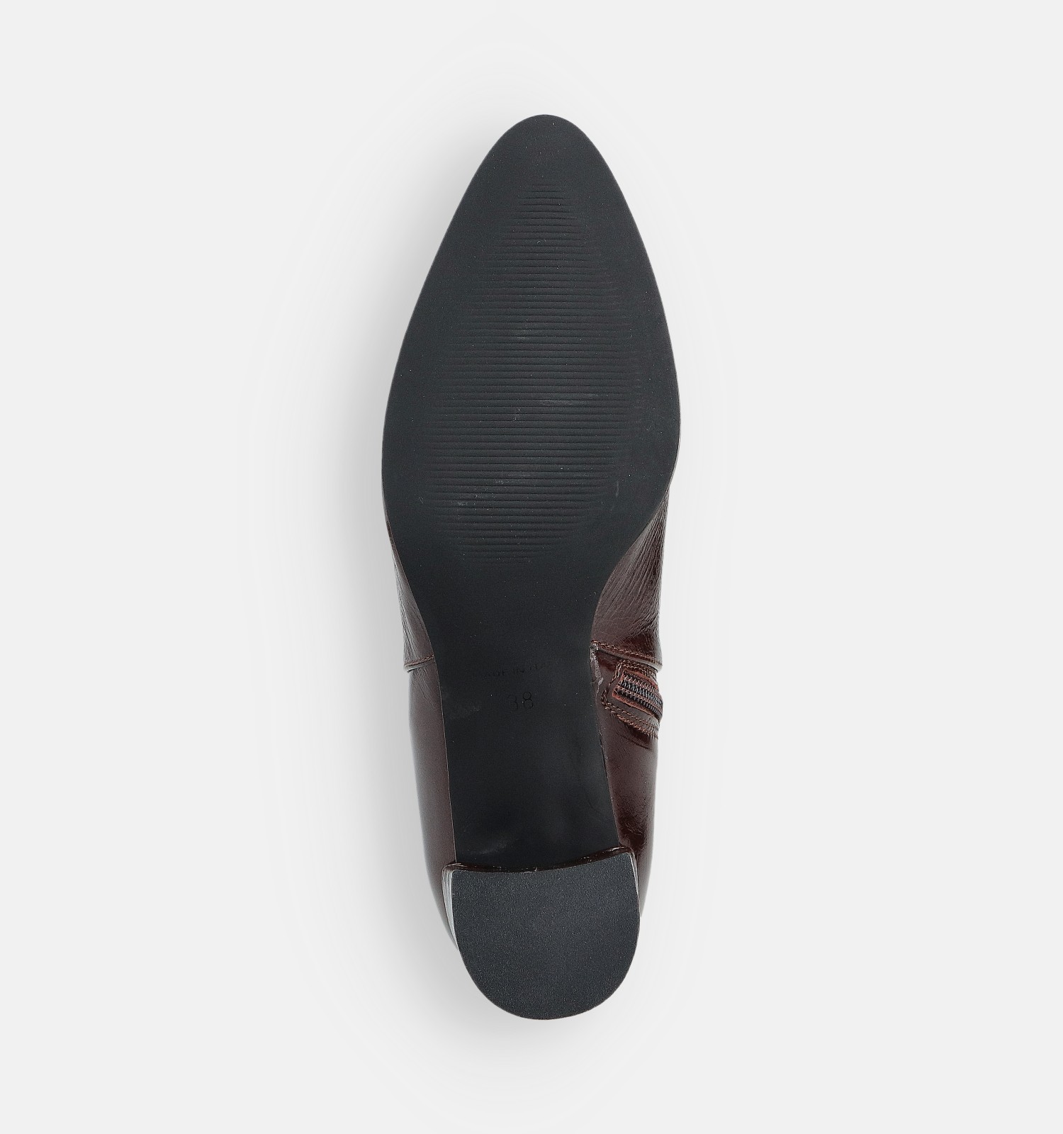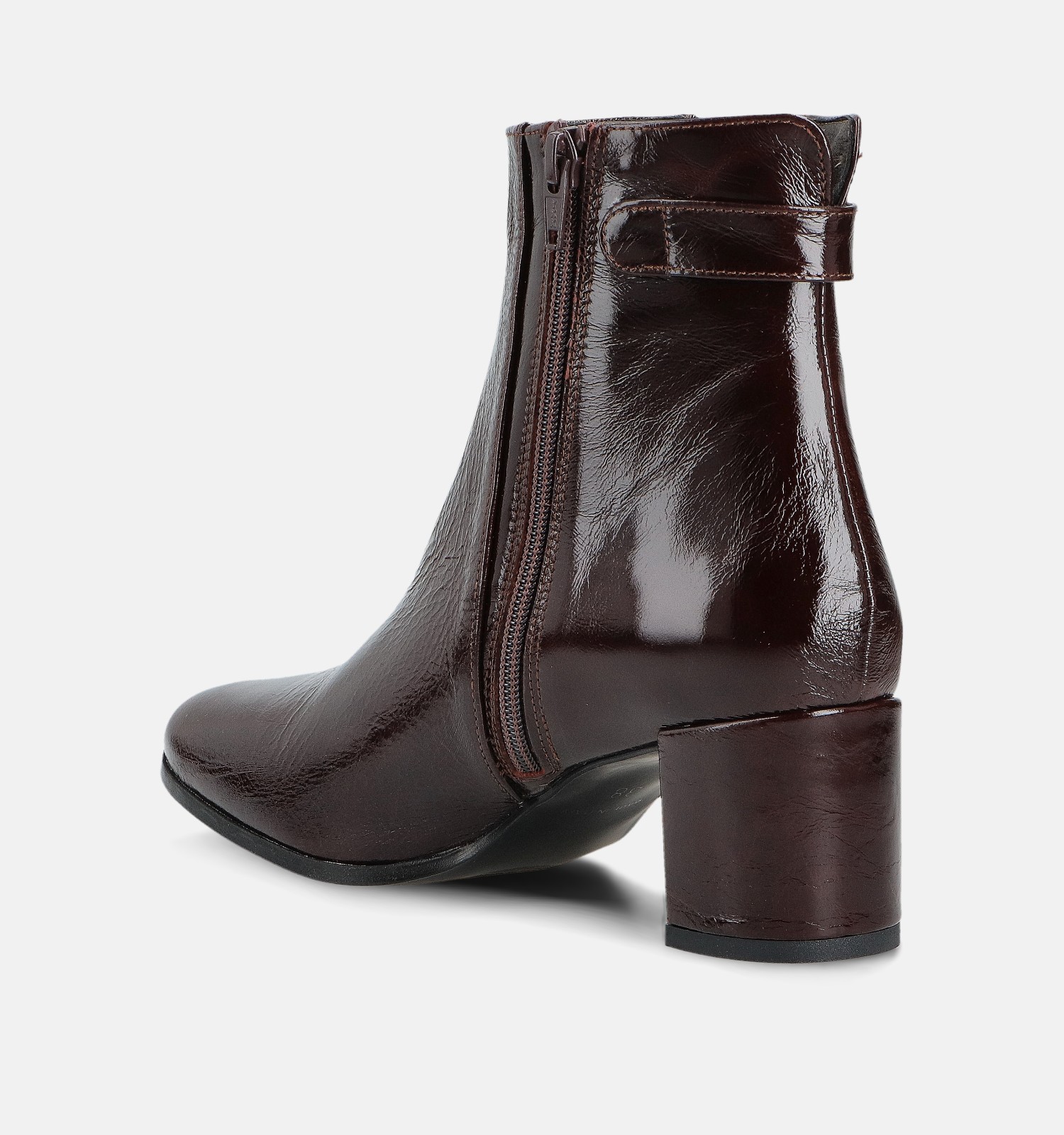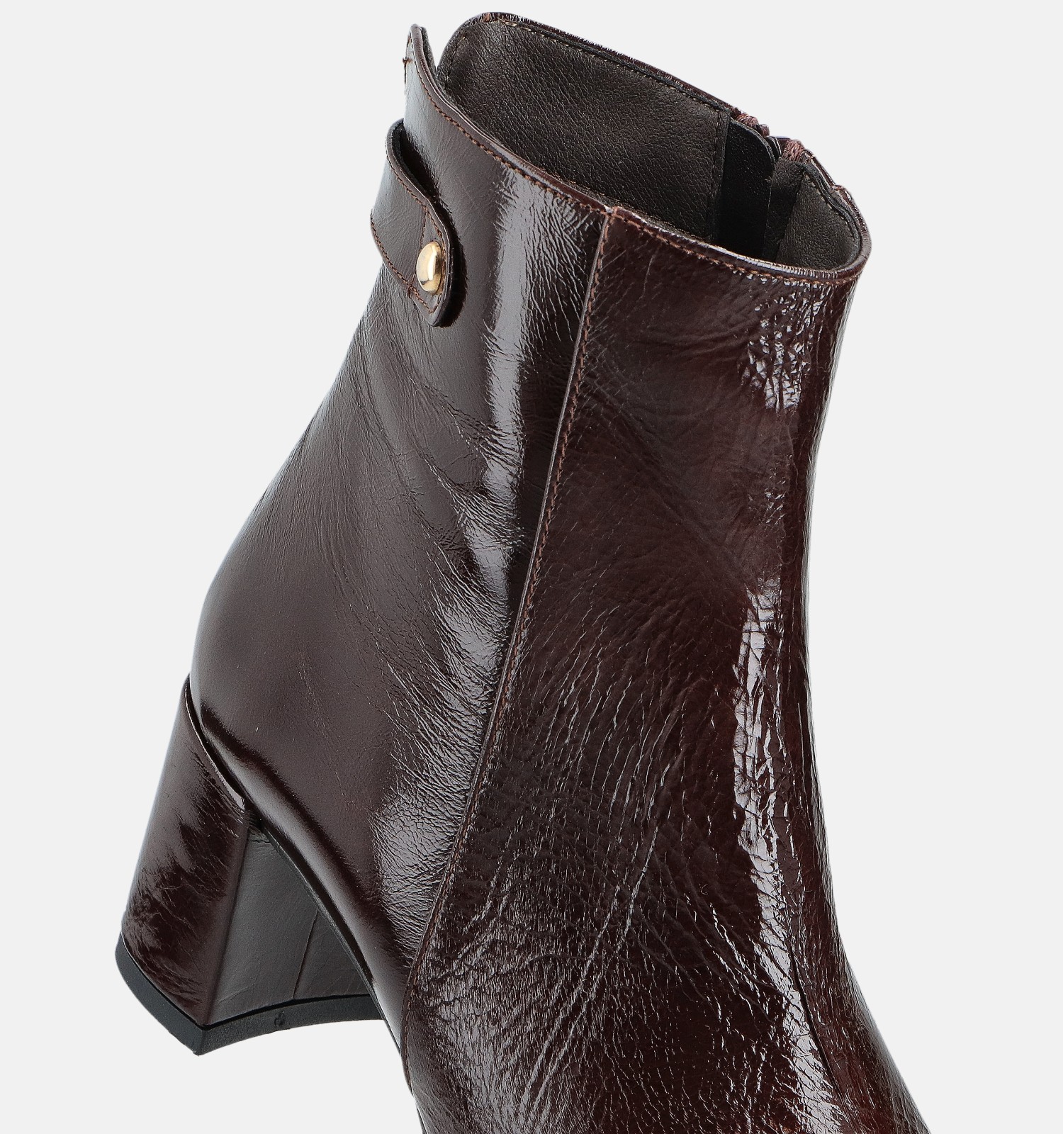 Deze enkellaars van Laurent David is vervaardigd uit lak en binnenin afgewerkt in leer, stof.