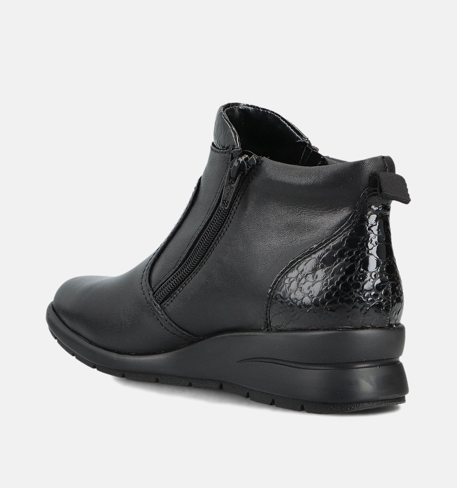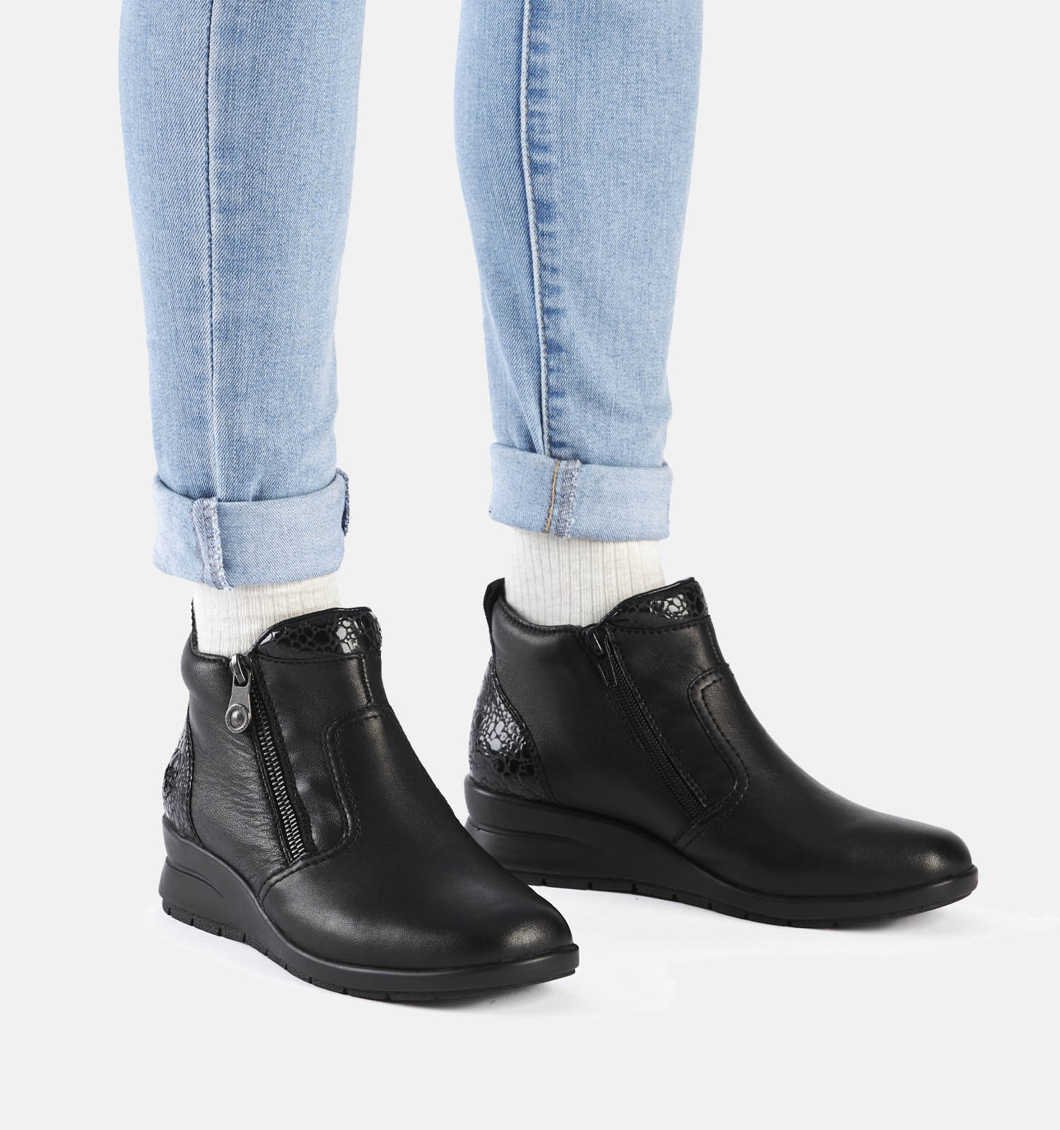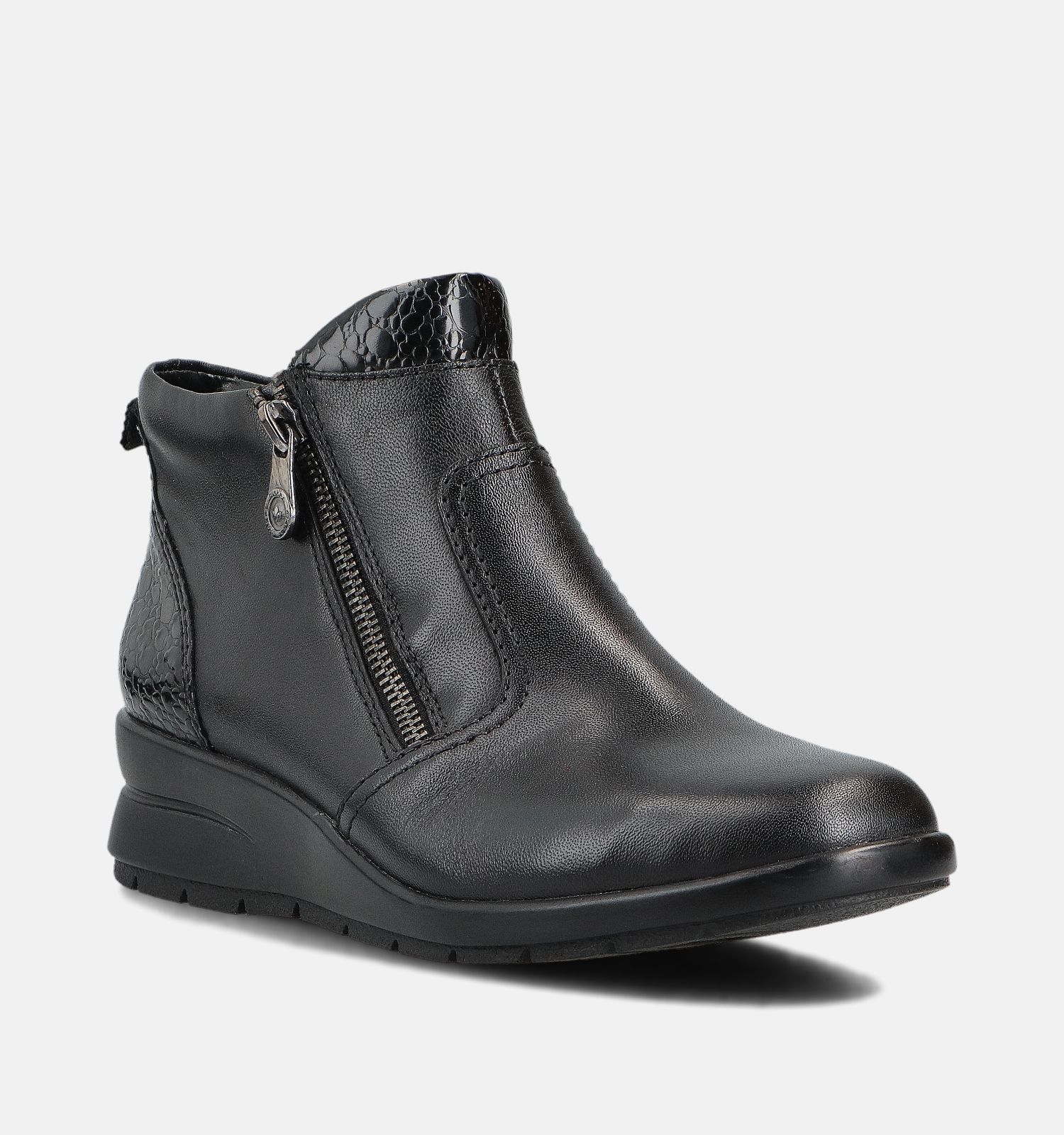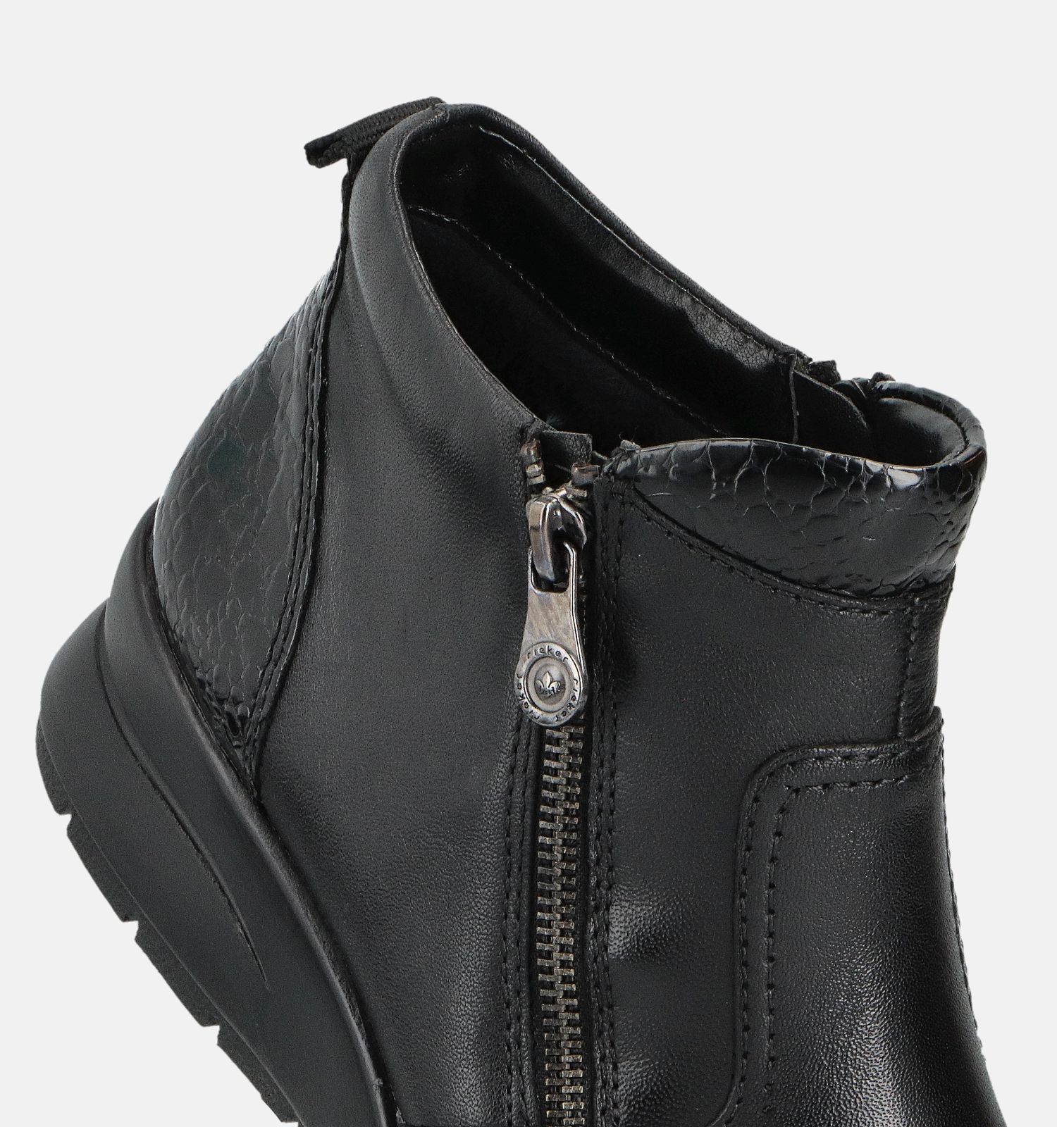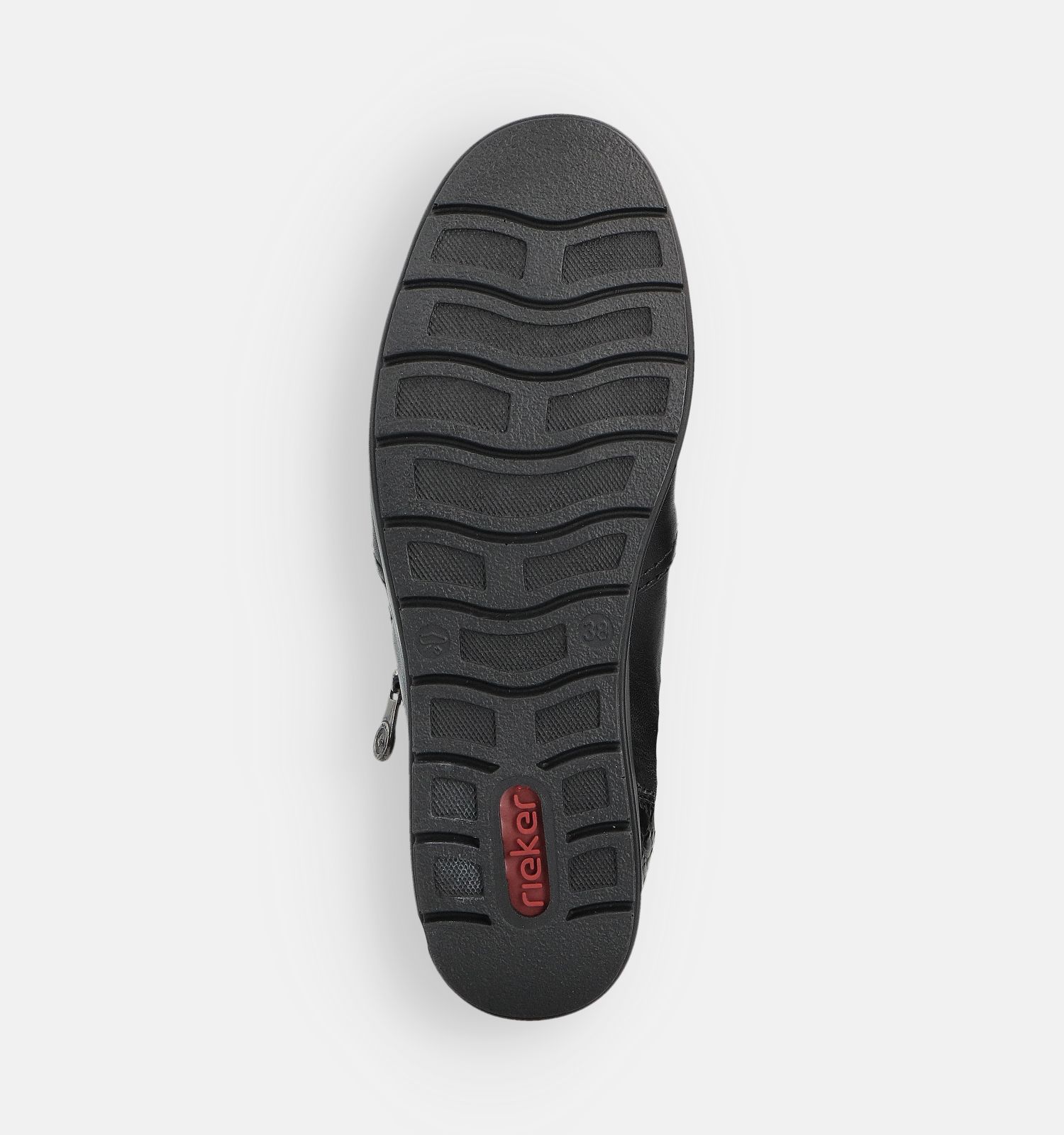 Deze enkellaarsjes in de kleur zwart zijn vervaardigd uit sterk leer, met zacht stof aan de binnenkant. Deze materialen hebben een extra licht gewicht, een antidotum tegen dat herkenbare gevoel dat jouw voeten na een tijd zwaar beginnen aan te voelen. De ergonomische pasvorm van deze Rieker damesenkellaarsjes houdt ook rekening met het feit dat alle voeten licht opzwellen tegen het einde van de dag. Zo ervaar je de hele dag door optimaal comfort! Deze Rieker enkellaarsjes voor dames hebben een ritssluiting.