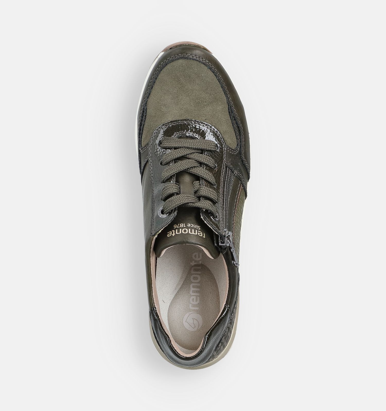 Deze moderne damesschoenen van het merk Remonte zijn geschikt voor voetbreedte H - Extra brede voet. De Remonte schoenen in groene kunstleer zijn een droom voor dames die op een slimme manier tijd willen besparen, zonder in te boeten op présence en comfort.
