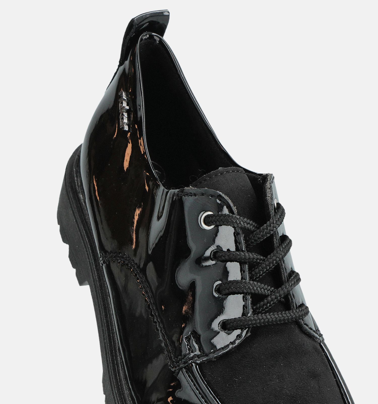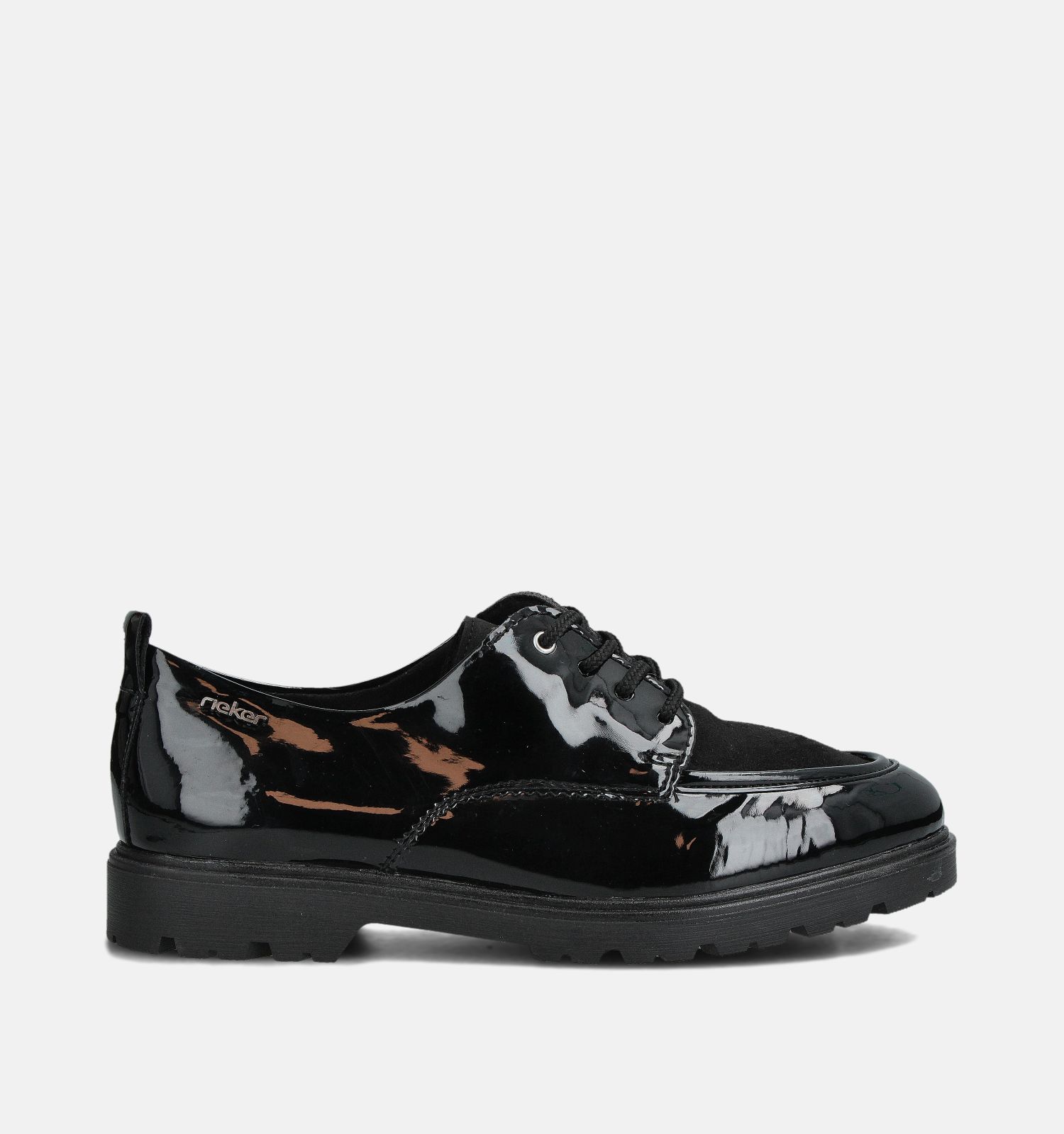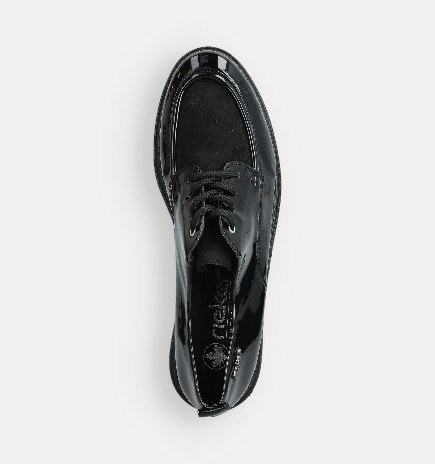 Deze lage schoenen in de kleur zwart zijn vervaardigd uit sterk lak, met zacht stof aan de binnenkant. Deze materialen hebben een extra licht gewicht, een antidotum tegen dat herkenbare gevoel dat jouw voeten na een tijd zwaar beginnen aan te voelen. De ergonomische pasvorm van deze Rieker dameslage schoenen houdt ook rekening met het feit dat alle voeten licht opzwellen tegen het einde van de dag. Zo ervaar je de hele dag door optimaal comfort! Deze Rieker lage schoenen voor dames hebben een vetersluiting.
