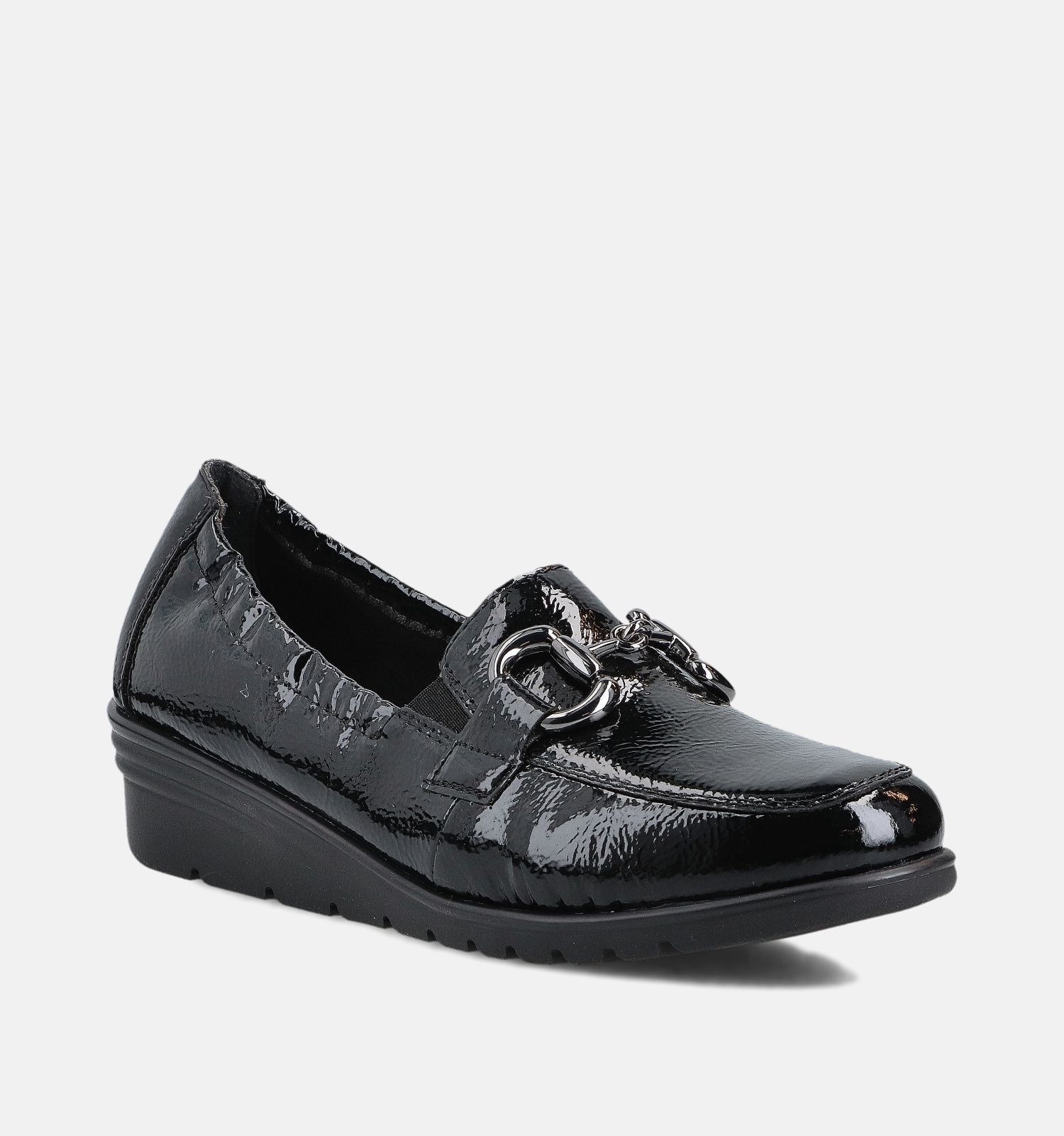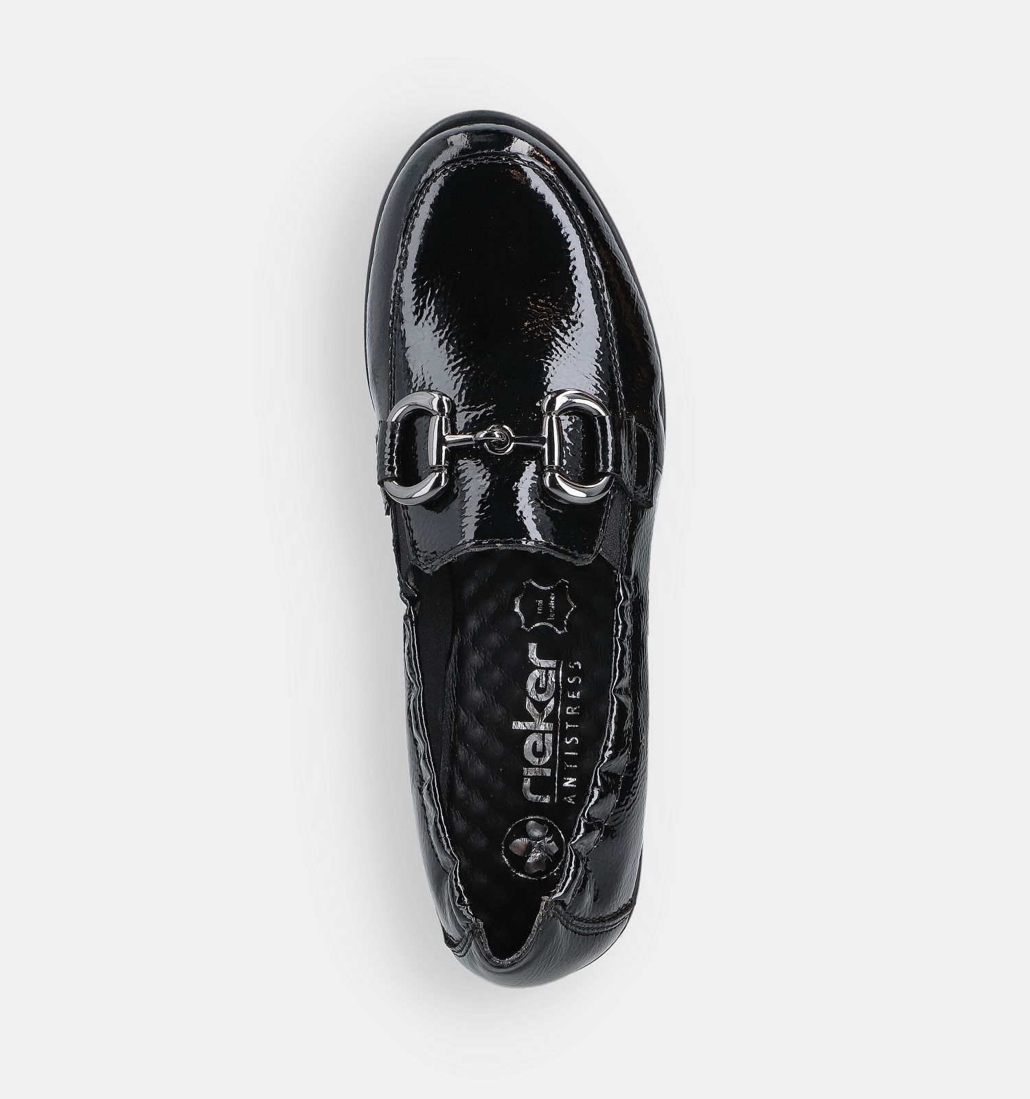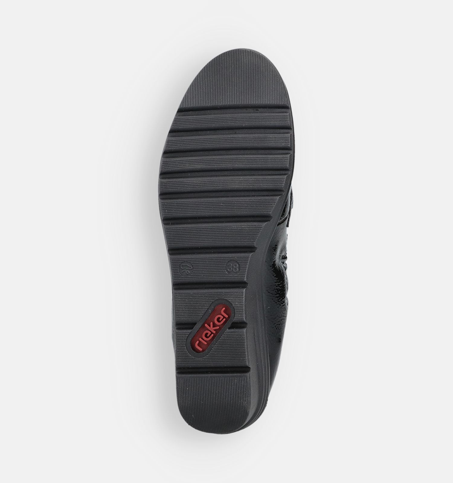 Deze pumps in de kleur zwart zijn vervaardigd uit sterk lak, met zacht leer aan de binnenkant. Deze materialen hebben een extra licht gewicht, een antidotum tegen dat herkenbare gevoel dat jouw voeten na een tijd zwaar beginnen aan te voelen. De ergonomische pasvorm van deze Rieker damespumps houdt ook rekening met het feit dat alle voeten licht opzwellen tegen het einde van de dag. Zo ervaar je de hele dag door optimaal comfort! Deze Rieker pumps voor dames hebben een elastiek, instapsluiting.