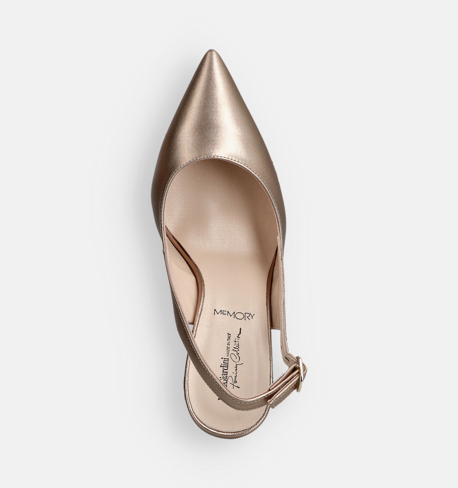 Met deze metallic slingbacks draag je een stukje Parijs aan je voeten. Pumps met open hiel van NeroGiardini bewijzen dat comfort en een haute couture-look perfect hand in hand gaan!