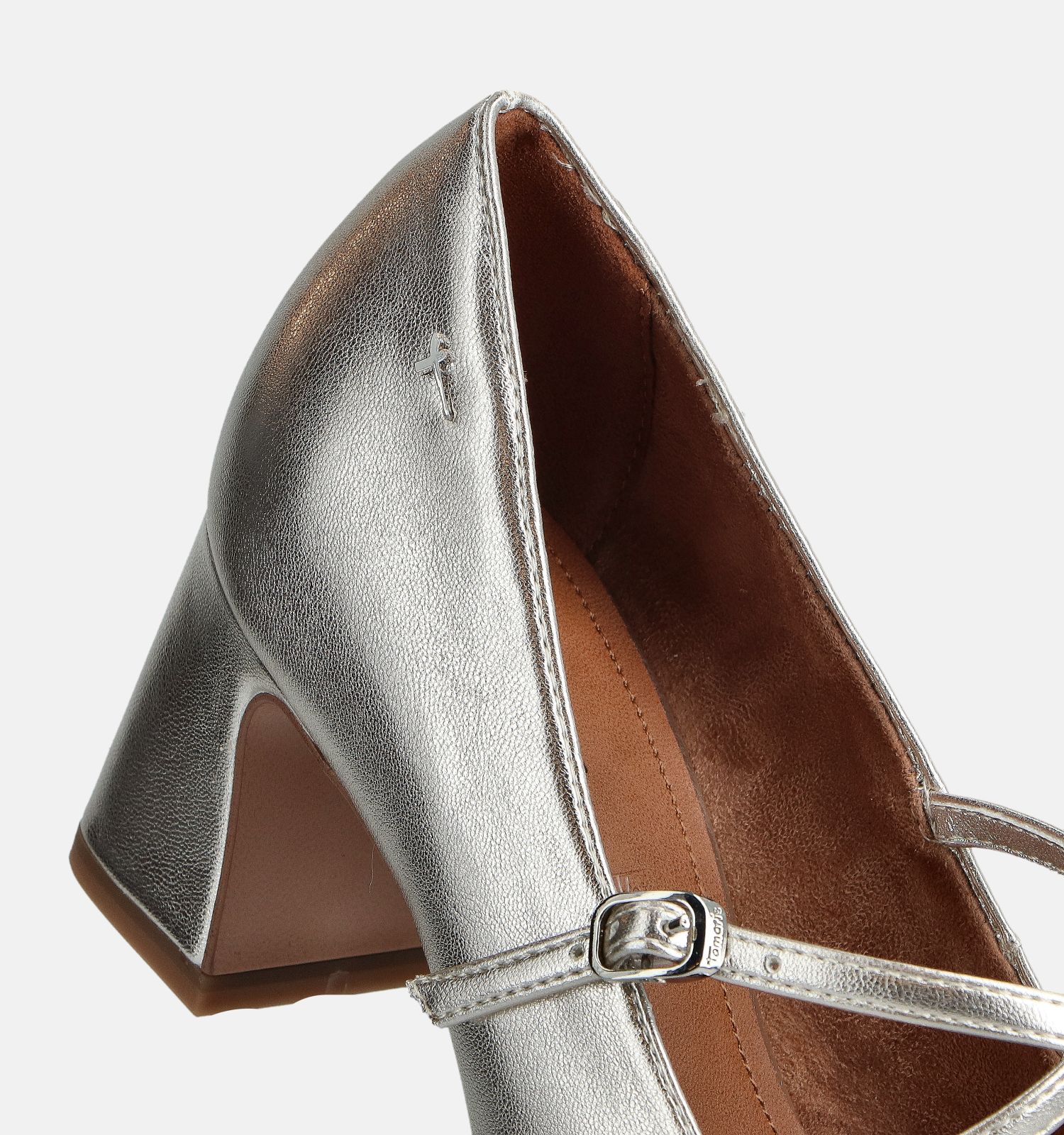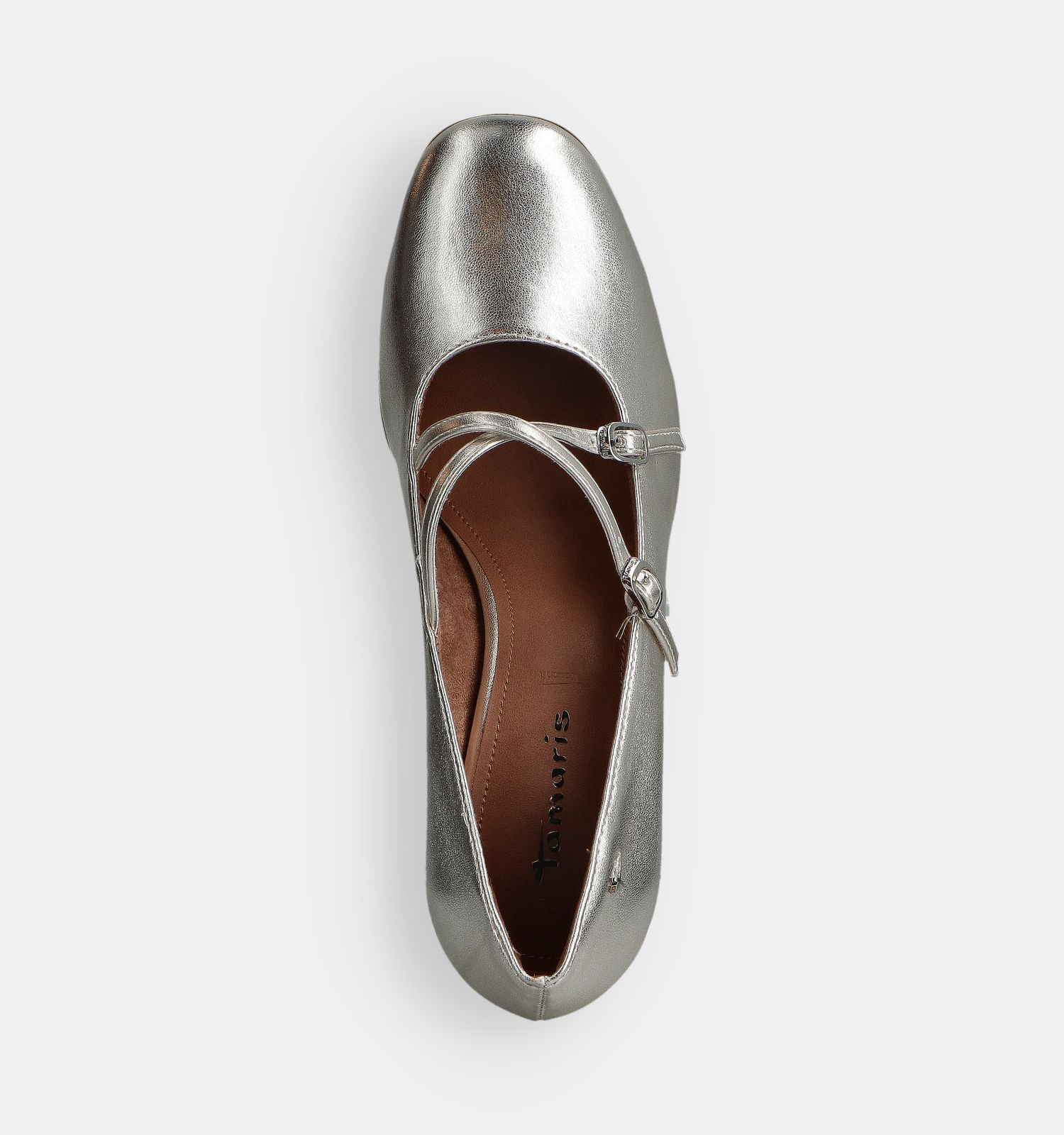 Deze zilveren pumps van het merk Tamaris hebben een extra bandje. Dat oogt elegant en vrouwelijk, maar zorgt ook voor meer stabiliteit tijdens het stappen. Dankzij dat bandje blijven je voeten beter op hun plaats, waardoor je minder wrijving ervaart en de kans op blaren of (uit)schuiven sterk vermindert. Dat betekent: meer zekerheid, zelfvertrouwen én comfort.