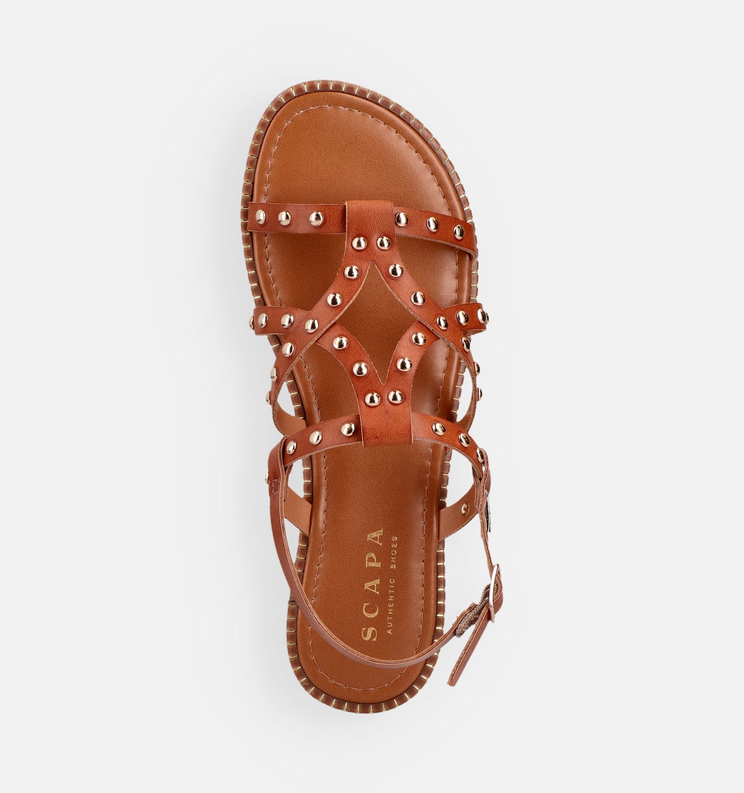 Deze platte sandalen in de kleur cognac zijn vervaardigd uit kwalitatief kunstleer. Het lichte materiaal helpt vermoeide voeten te voorkomen — zorgeloos genieten, dat doe je met Scapa !