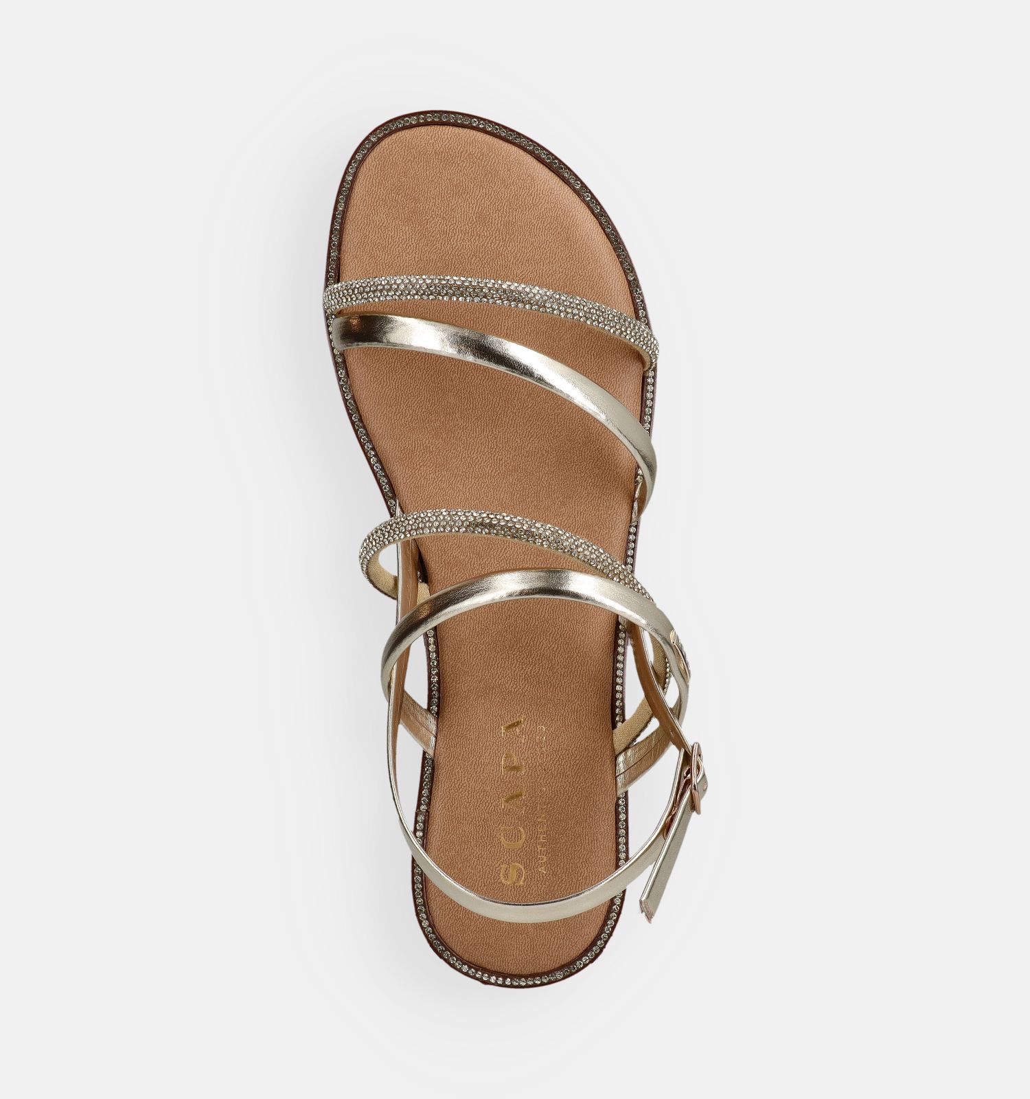 Deze platte sandalen in de kleur goud zijn vervaardigd uit kwalitatief kunstleer. Het lichte materiaal helpt vermoeide voeten te voorkomen — zorgeloos genieten, dat doe je met Scapa !