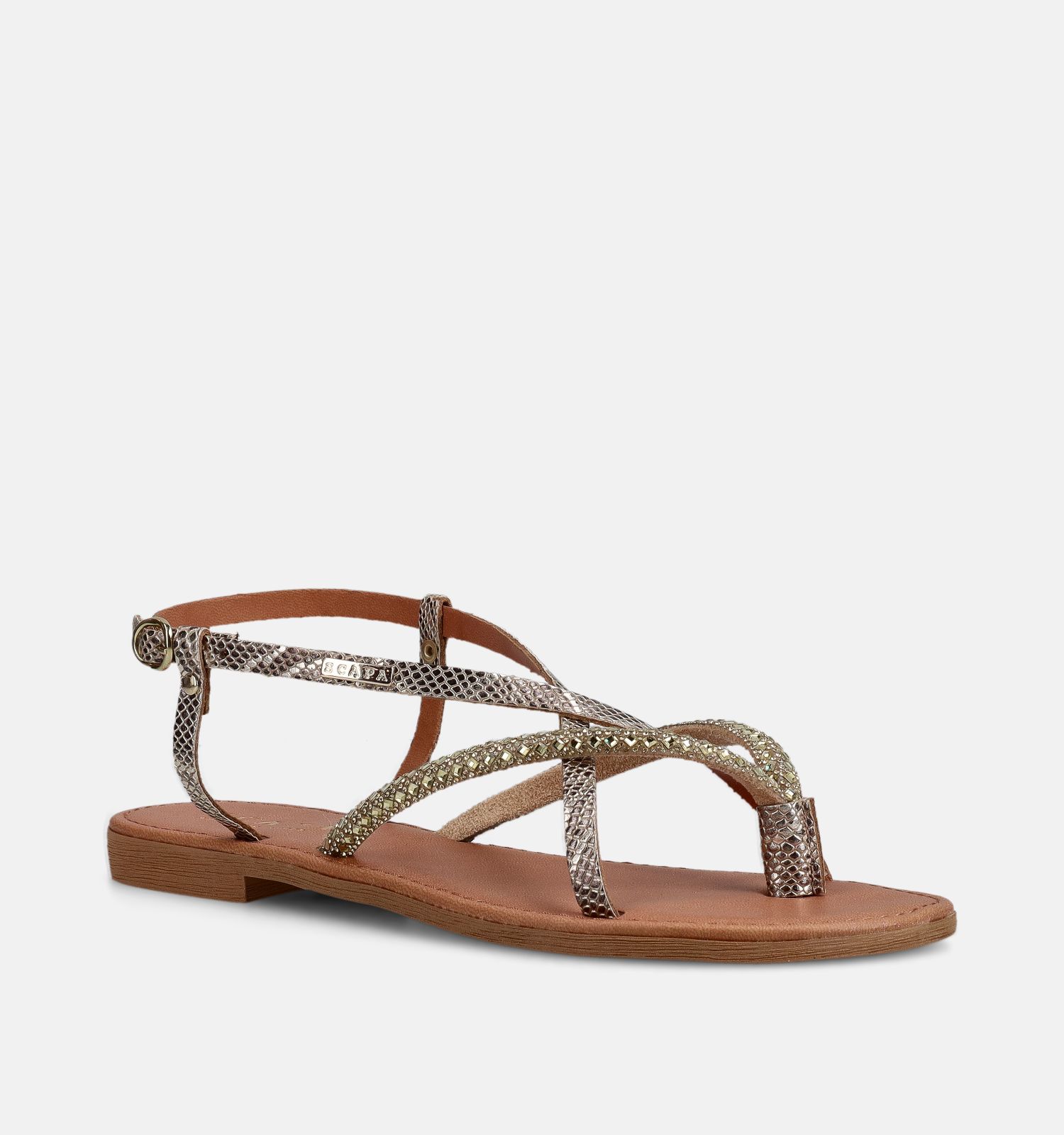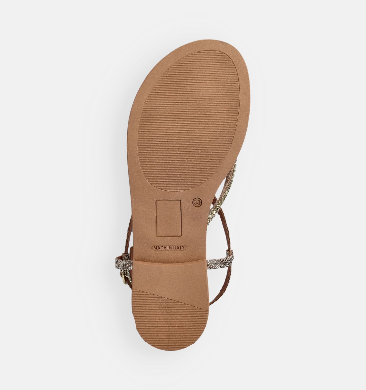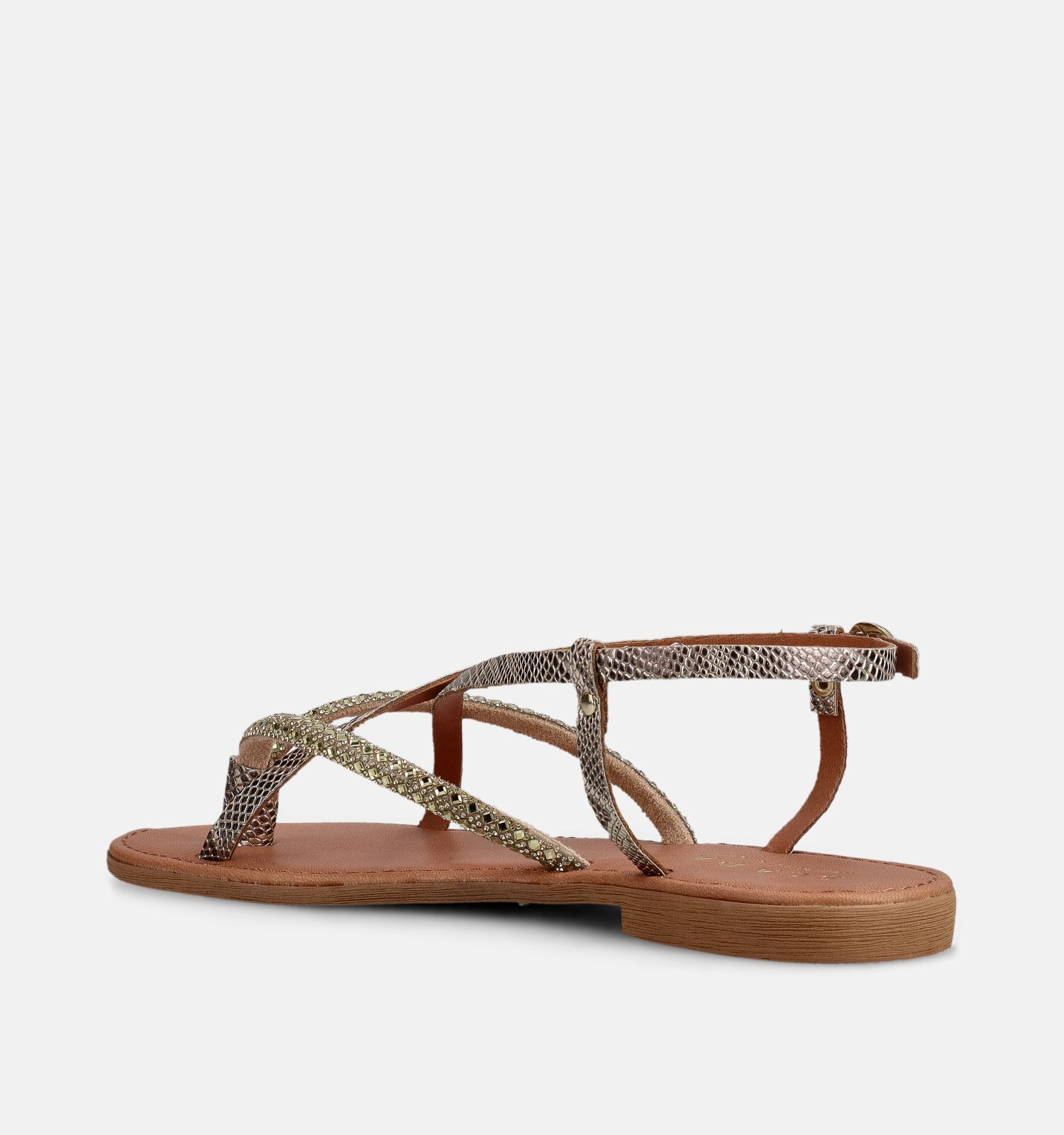 Deze platte sandalen in de kleur goud zijn vervaardigd uit kwalitatief kunstleer. Het lichte materiaal helpt vermoeide voeten te voorkomen — zorgeloos genieten, dat doe je met Scapa !