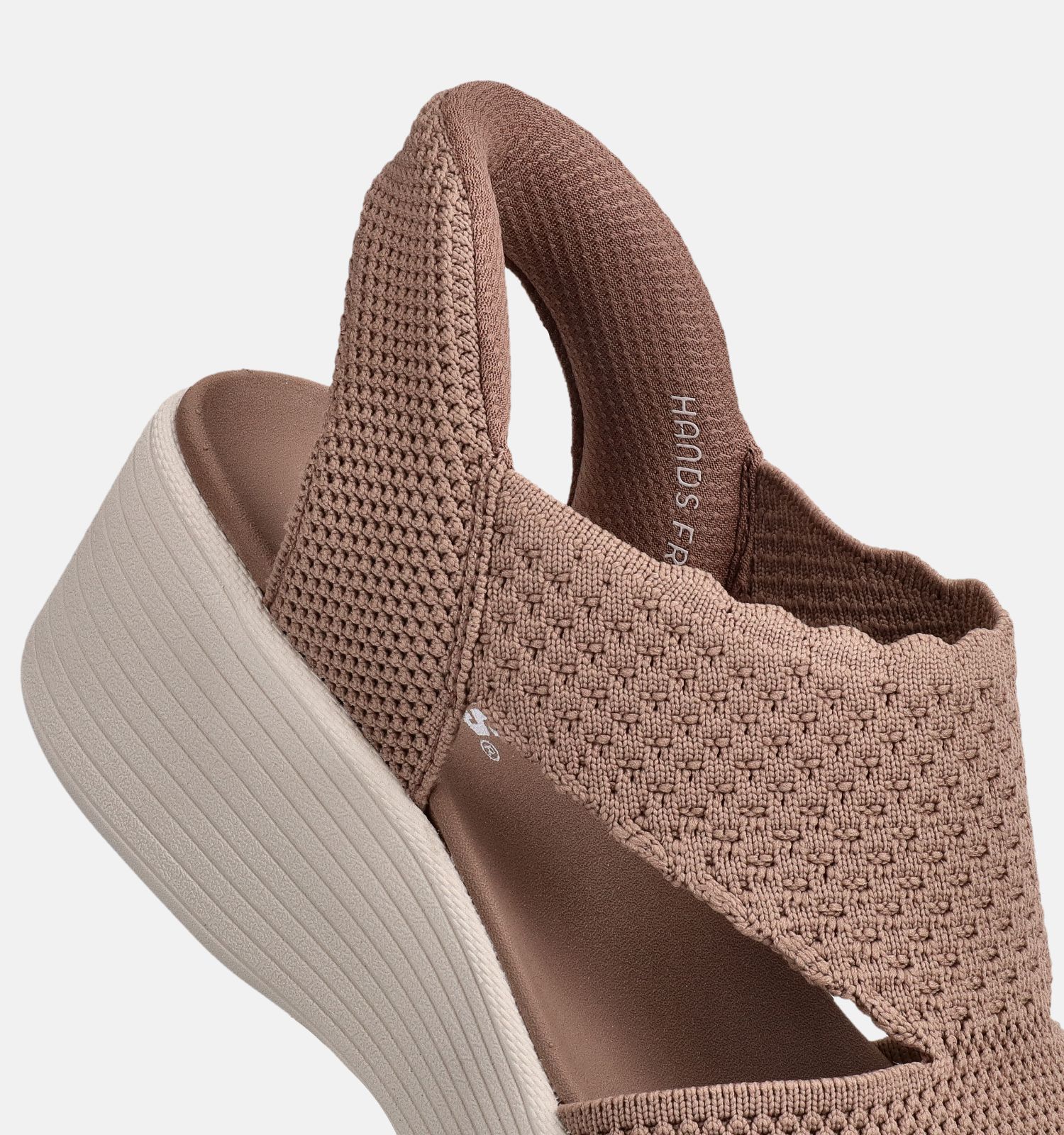 Belangrijk om te weten naar onderhoud toe: deze Skechers sandalen voor dames zijn vervaardigd uit stof binnenin, met versterkt stof aan de buitenkant. Dit bruine exemplaar heeft een elastiek, instapsluiting.