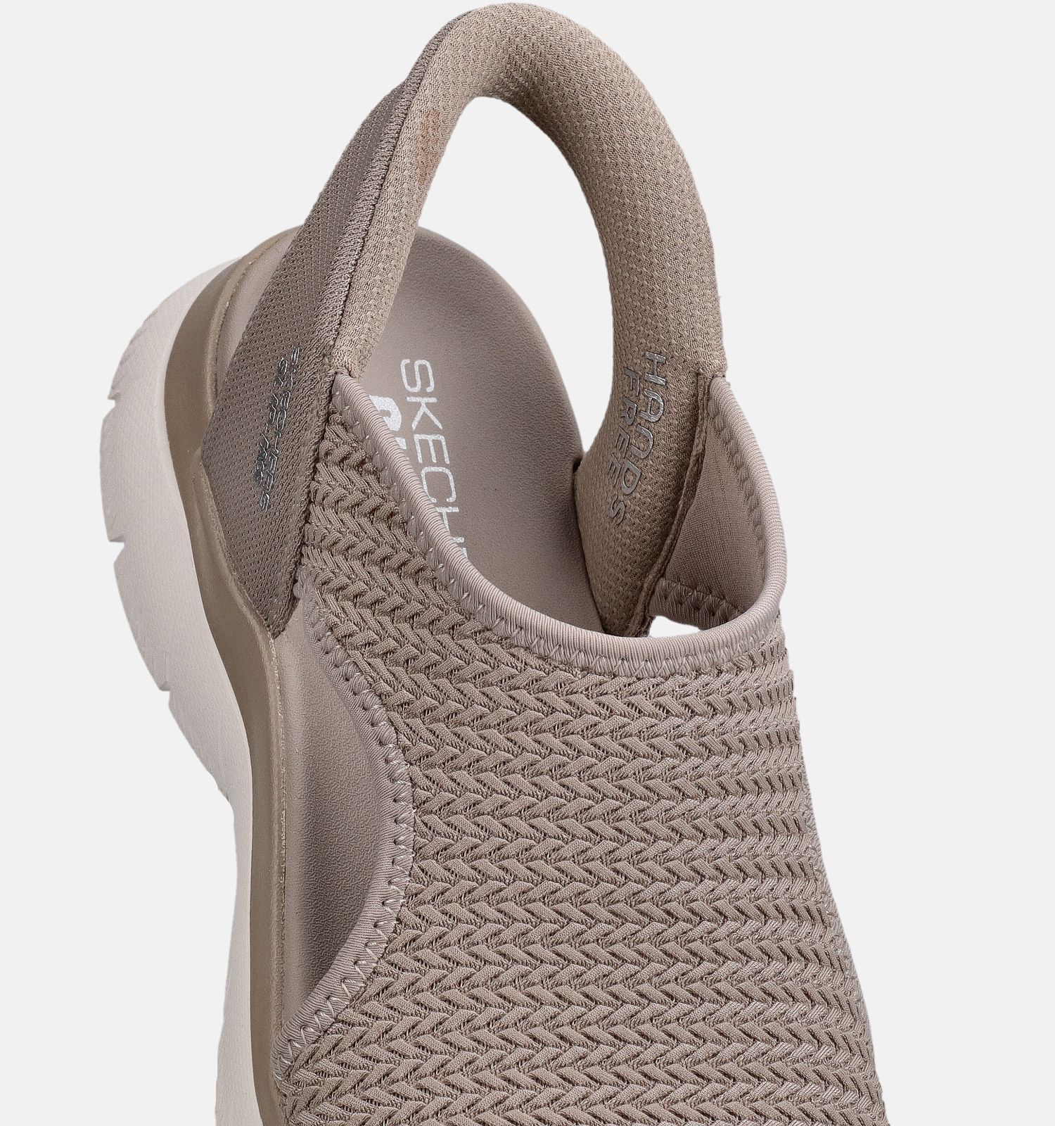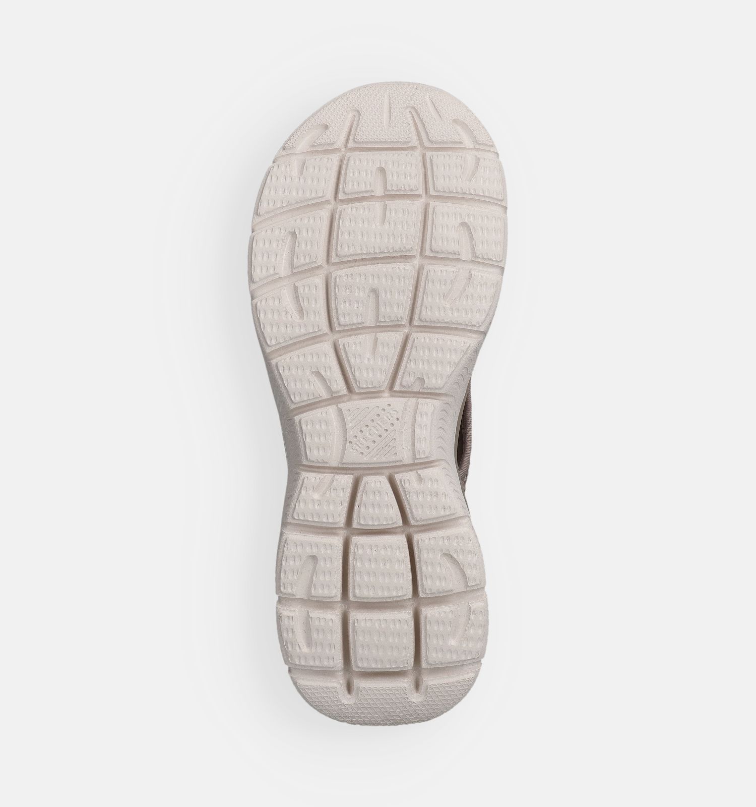 Belangrijk om te weten naar onderhoud toe: deze Skechers sandalen voor dames zijn vervaardigd uit stof binnenin, met versterkt stof aan de buitenkant. Dit taupe exemplaar heeft een elastieksluiting.