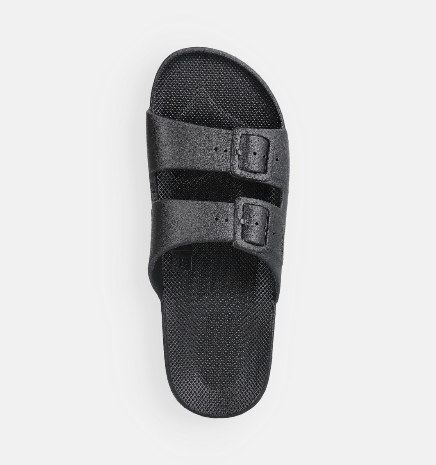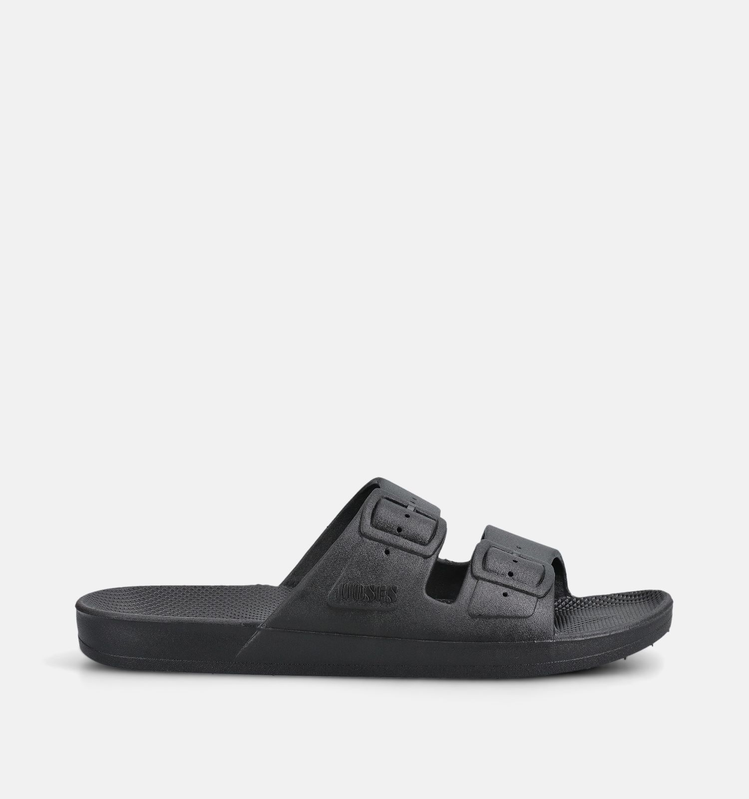 Freedom Moses badslippers zijn een meerwaarde voor elke damesschoenencollectie! Poolslides zijn comfortabel en multifunctioneel. Strandslippers zoals dit zwarte model van Freedom Moses zijn al lang niet meer exclusief voor op het strand.