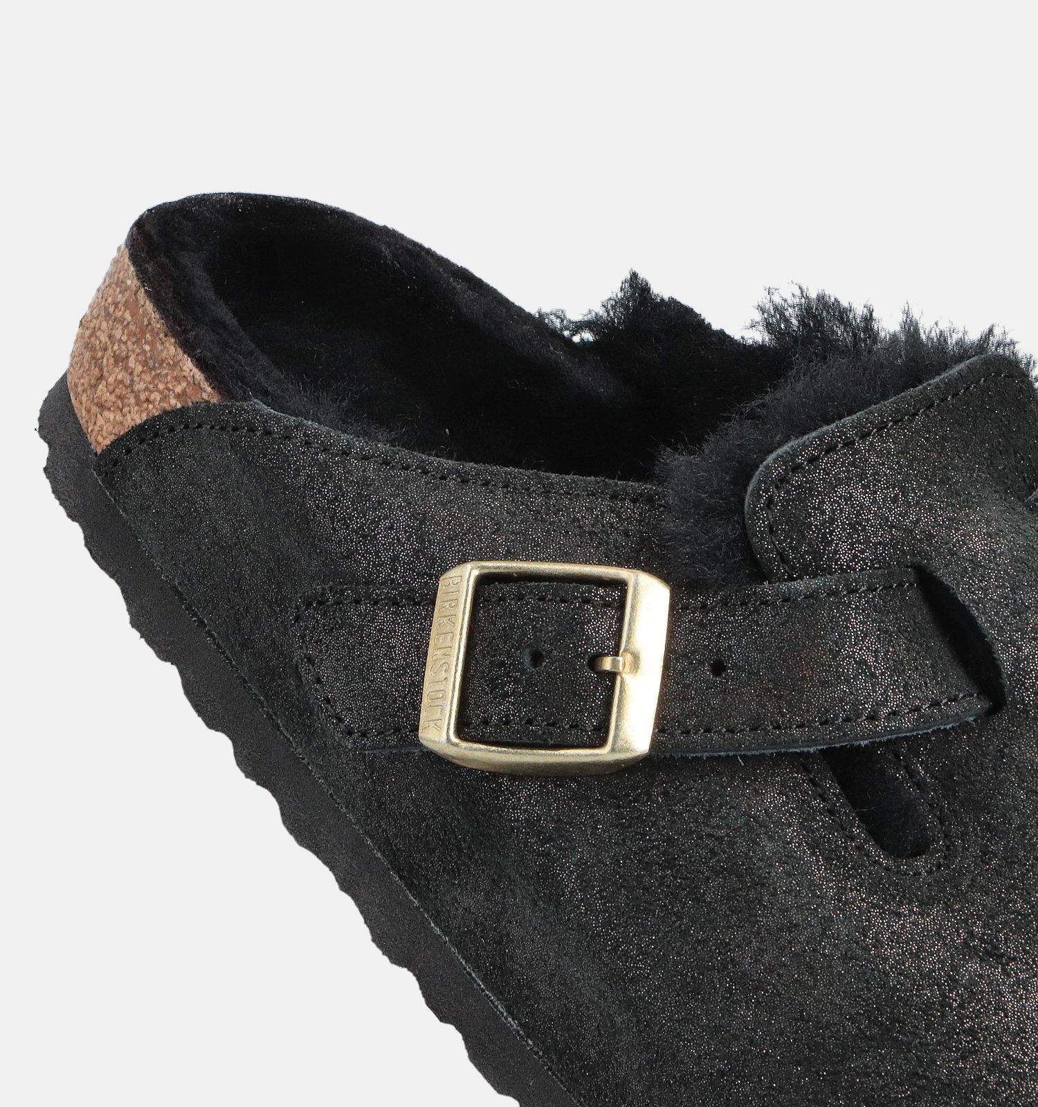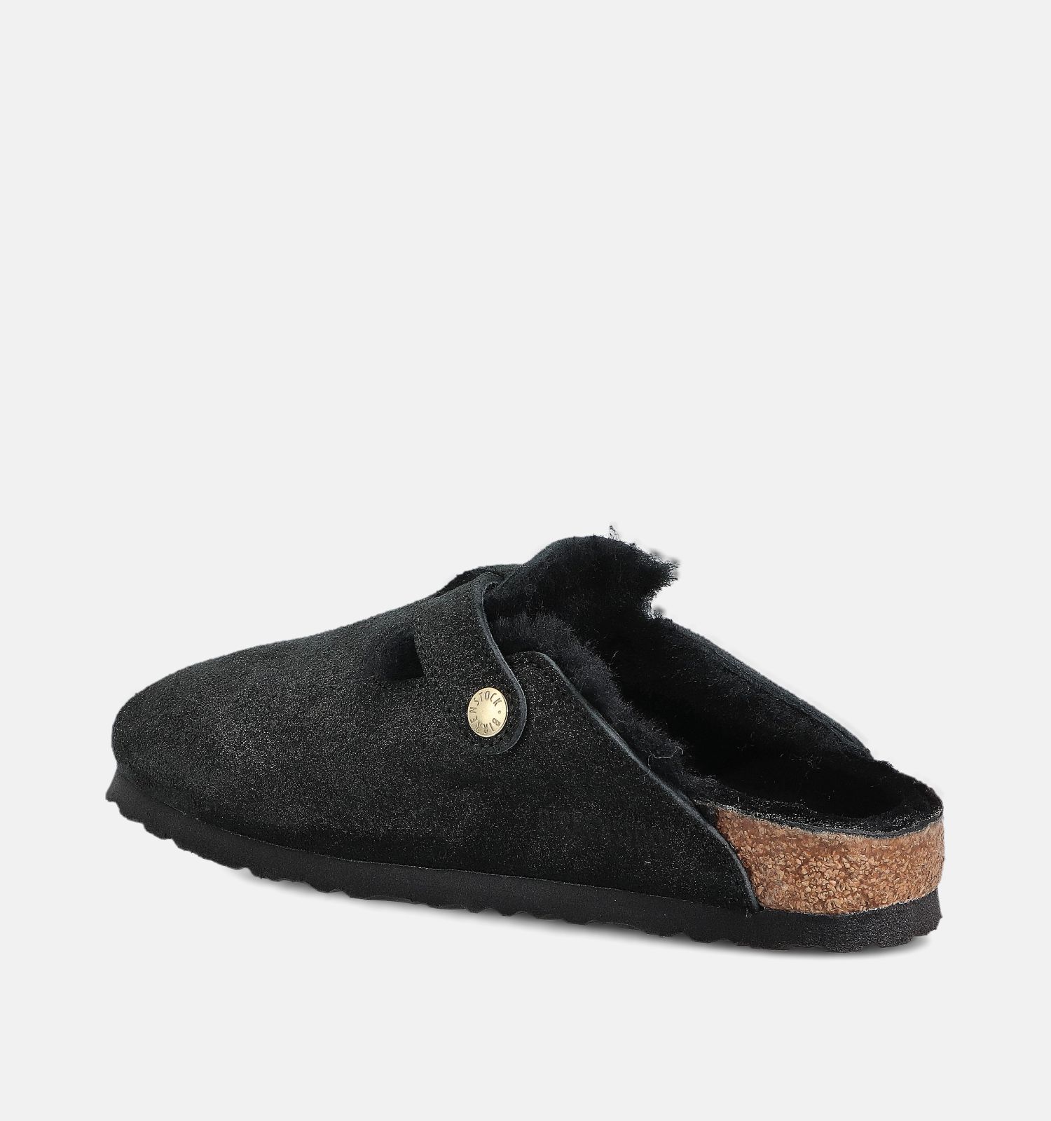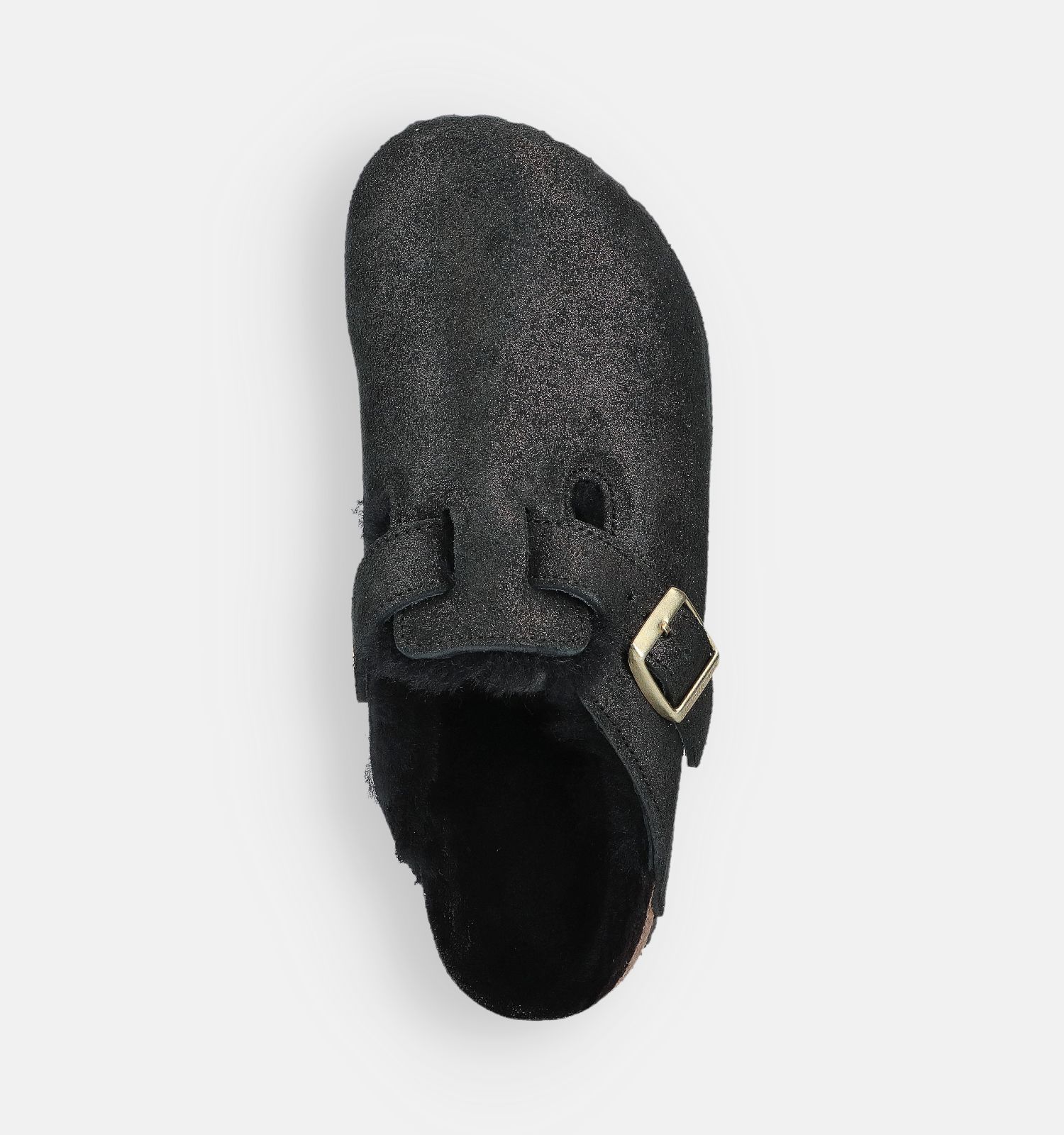 Deze open pantoffels zijn vervaardigd uit kwalitatief suède, met binnen wol. Dit zwarte exemplaar heeft geen sluiting, waardoor ze makkelijk en snel aan- en uit te trekken zijn. Het design van deze open damespantoffels is mooi meegenomen! Zwart blijft gewoon tijdloos. Stap uit jouw schoenen en schuif ultiem comfort aan je voeten, met deze zachte pantoffels van Birkenstock.