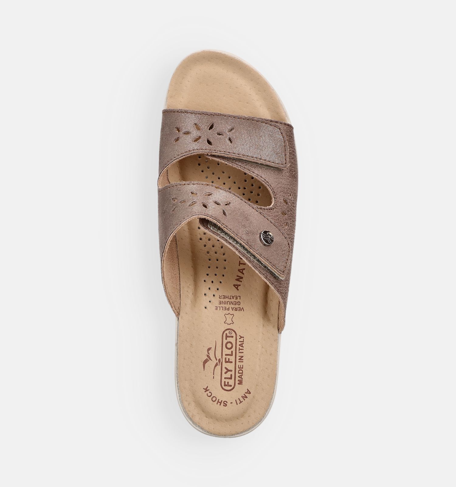 "FLY FLOT comfort made in Italy" is het Italiaanse antwoord op de noodzaak de voeten te ontlasten. De unieke zool, die de voet de "VIER PUNTEN VAN TOTAAL WELZIJN" biedt - schokdempend, anatomisch, zelfvormend, antislip - geeft een staat van intens welzijn aan het hele lichaam.
