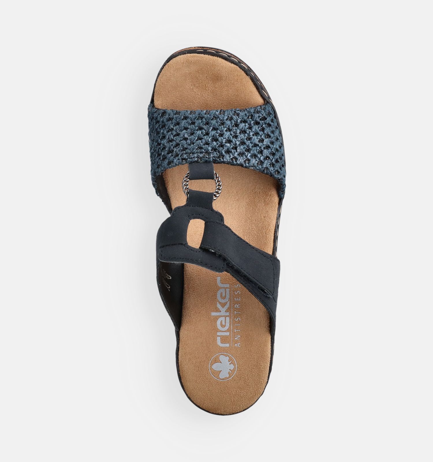 Deze slippers in de kleur blauw zijn vervaardigd uit sterk raffia, stof, met zacht kunstleer, stof aan de binnenkant. Deze materialen hebben een extra licht gewicht, een antidotum tegen dat herkenbare gevoel dat jouw voeten na een tijd zwaar beginnen aan te voelen. De ergonomische pasvorm van deze Rieker damesslippers houdt ook rekening met het feit dat alle voeten licht opzwellen tegen het einde van de dag. Zo ervaar je de hele dag door optimaal comfort! Deze Rieker slippers voor dames hebben een instap, velcrosluiting.