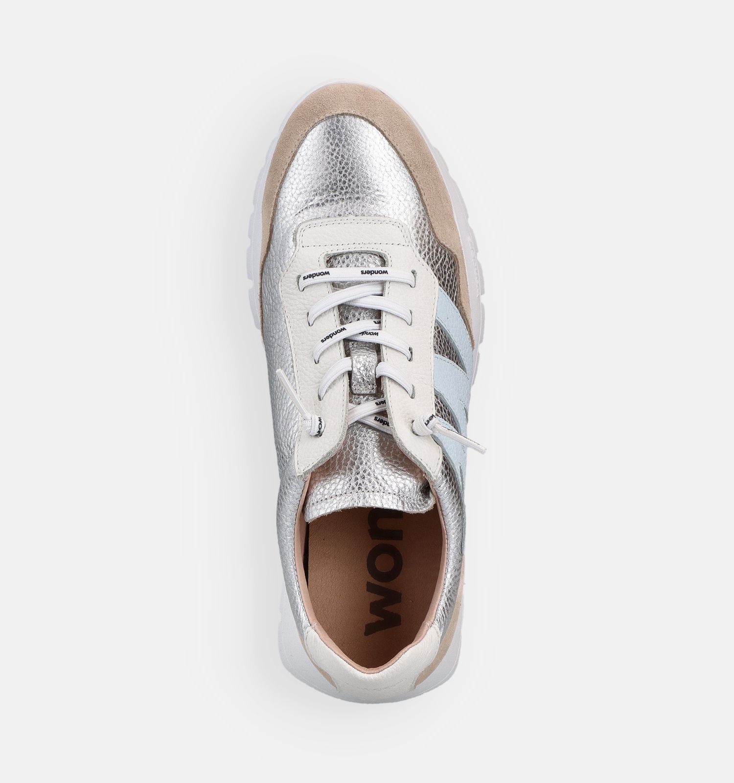 Deze zilveren sneakers hebben een elastieksluiting. Zo blijven de sneakers goed aanzitten tijdens het wandelen! De schoenbreedte van dit Wonders model is F - Normale voet.