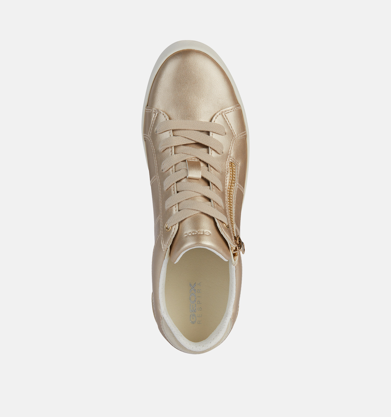 Geox, de schoen die ademt! Deze gouden sneakers maken deel uit van de trendy damescollectie van dat iconische schoenenmerk. Deze sneakers voor dames hebben de gepatenteerde Geox-zolen, waardoor zweet wordt afgevoerd via de microgaatjes in de buitenzolen. Zo blijven de voeten droog, de hele dag lang. Door deze ademende damessneakers van Geox ervaar je ultiem comfort!
