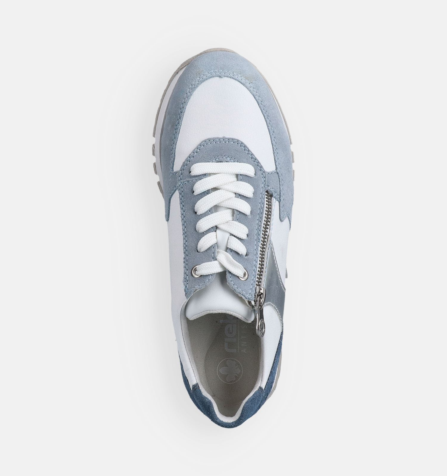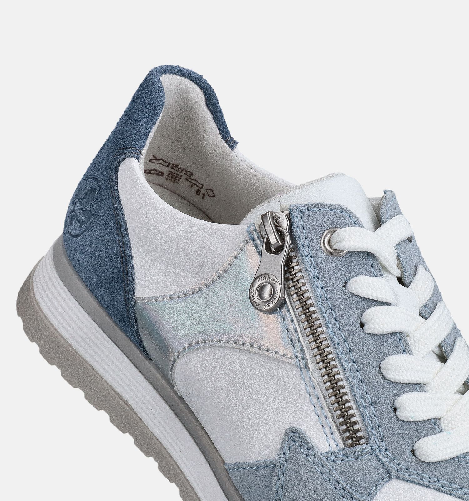 Deze sneakers in de kleur blauw zijn vervaardigd uit sterk leer, met zacht stof aan de binnenkant. Deze materialen hebben een extra licht gewicht, een antidotum tegen dat herkenbare gevoel dat jouw voeten na een tijd zwaar beginnen aan te voelen. De ergonomische pasvorm van deze Rieker damessneakers houdt ook rekening met het feit dat alle voeten licht opzwellen tegen het einde van de dag. Zo ervaar je de hele dag door optimaal comfort! Deze Rieker sneakers voor dames hebben een rits & vetersluiting.