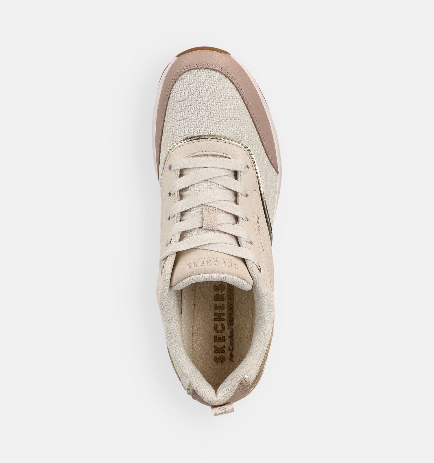 Belangrijk om te weten naar onderhoud toe: deze Skechers sneakers voor dames zijn vervaardigd uit stof binnenin, met versterkt kunstleer aan de buitenkant. Dit beige exemplaar heeft een vetersluiting.
