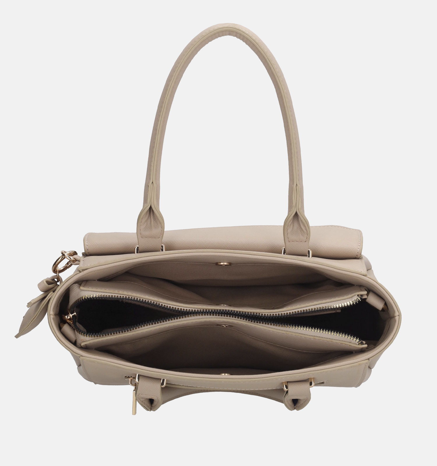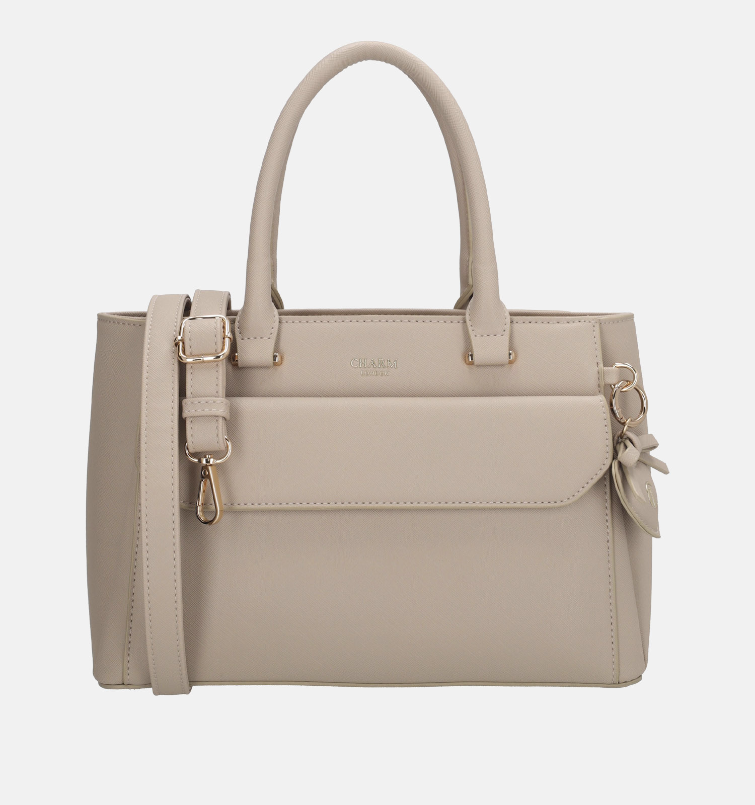 Een handtas moet vooral twee zaken zijn: functioneel en esthetisch mooi. Charm London toont jou graag dit schoolvoorbeeld. Deze taupe handtas is, door de grootte van 30 cm op 12 cm op 21 cm, een eerder ruim exemplaar. Perfect voor iedereen die graag goed voorbereid de deur uit gaat! Er is plek voor alle extraatjes die je maar wil meenemen, zoals bv. een zonnebril, wat snacks en/of een kleine paraplu.