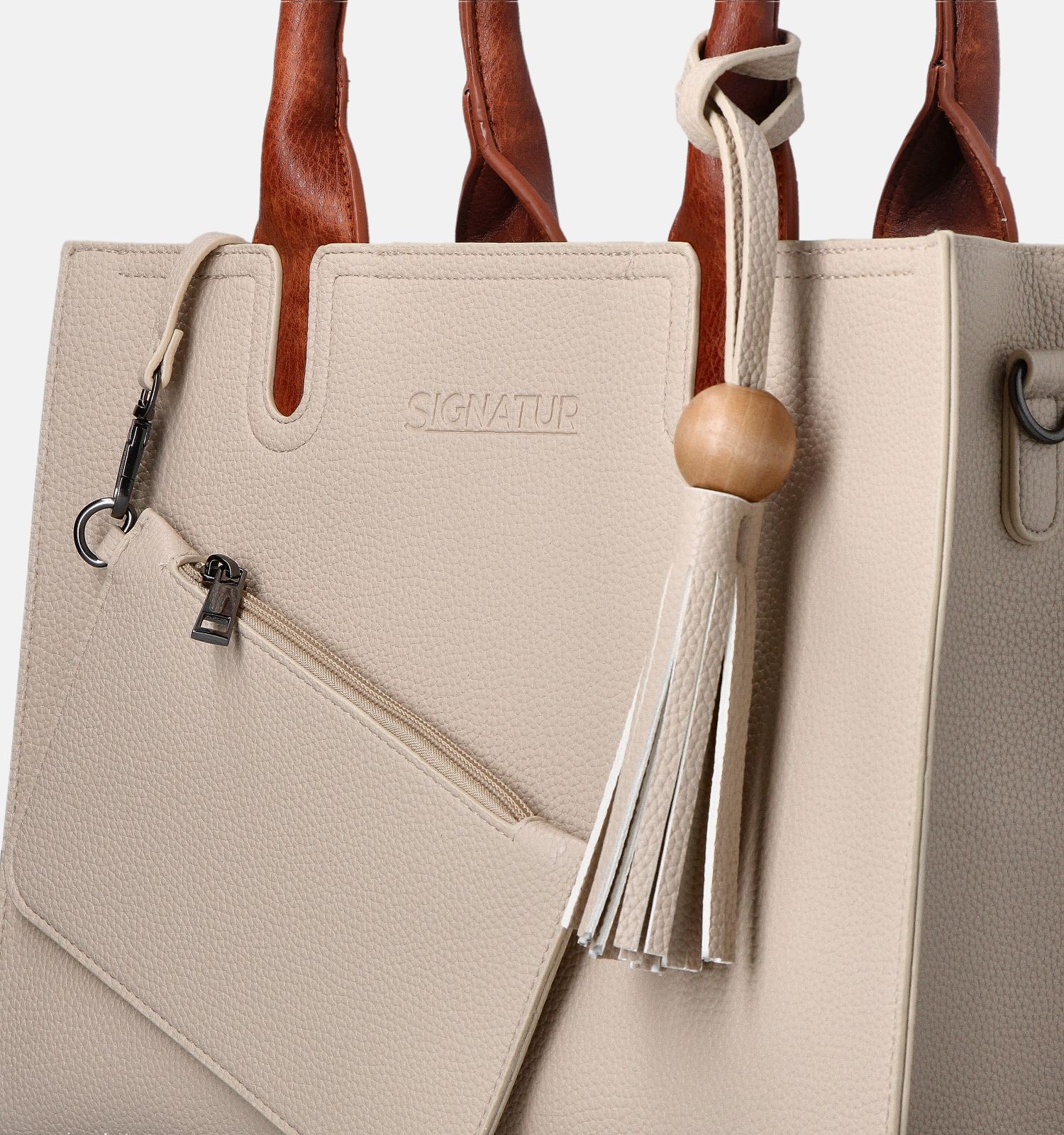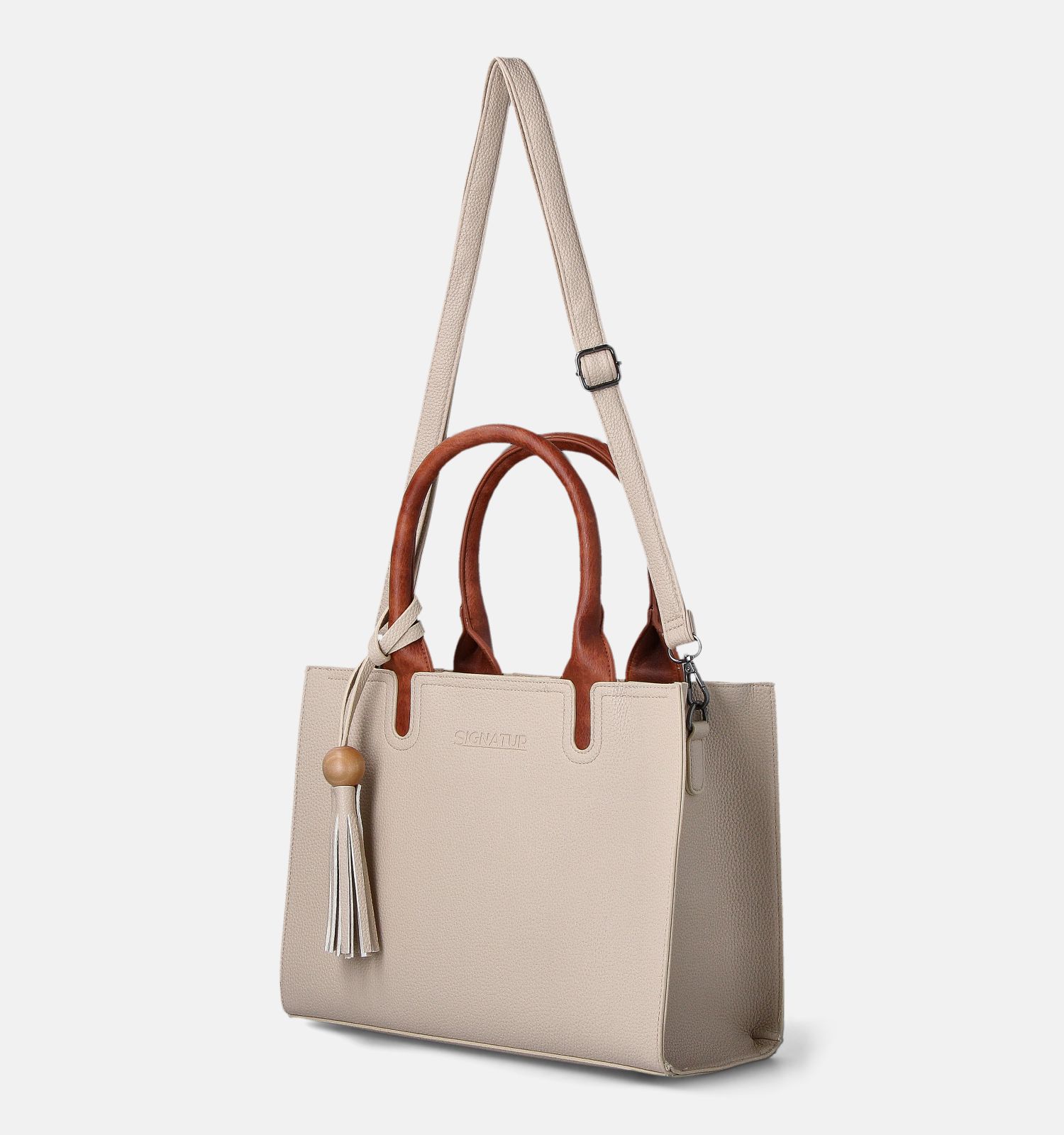 Een handtas moet vooral twee zaken zijn: functioneel en esthetisch mooi. Signatur toont jou graag dit schoolvoorbeeld. Deze witte handtas is, door de grootte van 32 cm op 11 cm op 24 cm, een eerder ruim exemplaar. Perfect voor iedereen die graag goed voorbereid de deur uit gaat! Er is plek voor alle extraatjes die je maar wil meenemen, zoals bv. een zonnebril, wat snacks en/of een kleine paraplu.