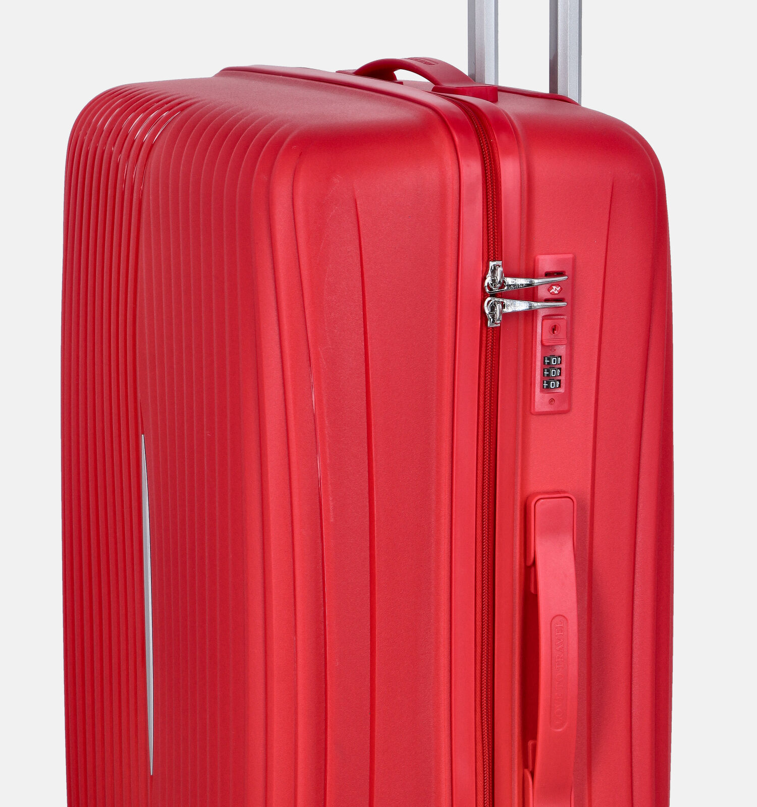 Deze rode Love To Travel valies is gemaakt van polypropyleen: een sterk materiaal dat licht van gewicht is. Het is bovendien weerbestendig, onderhoudsvriendelijk en bestand tegen stoten en schokken.