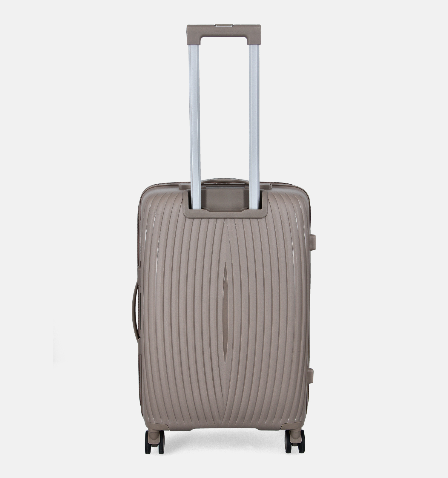 Deze taupe reiskoffer is ideaal voor reizen tot tien dagen of voor wie gewoon graag wat extra bagage meeneemt. De afmetingen van deze Love To Travel koffer zijn 64 cm x 42 cm x 25 cm. Dit taupe exemplaar is sterk genoeg om tot 23 kg veilig mee te nemen.