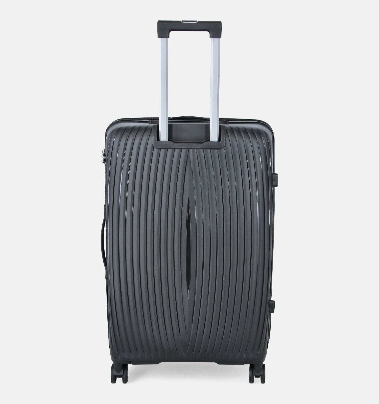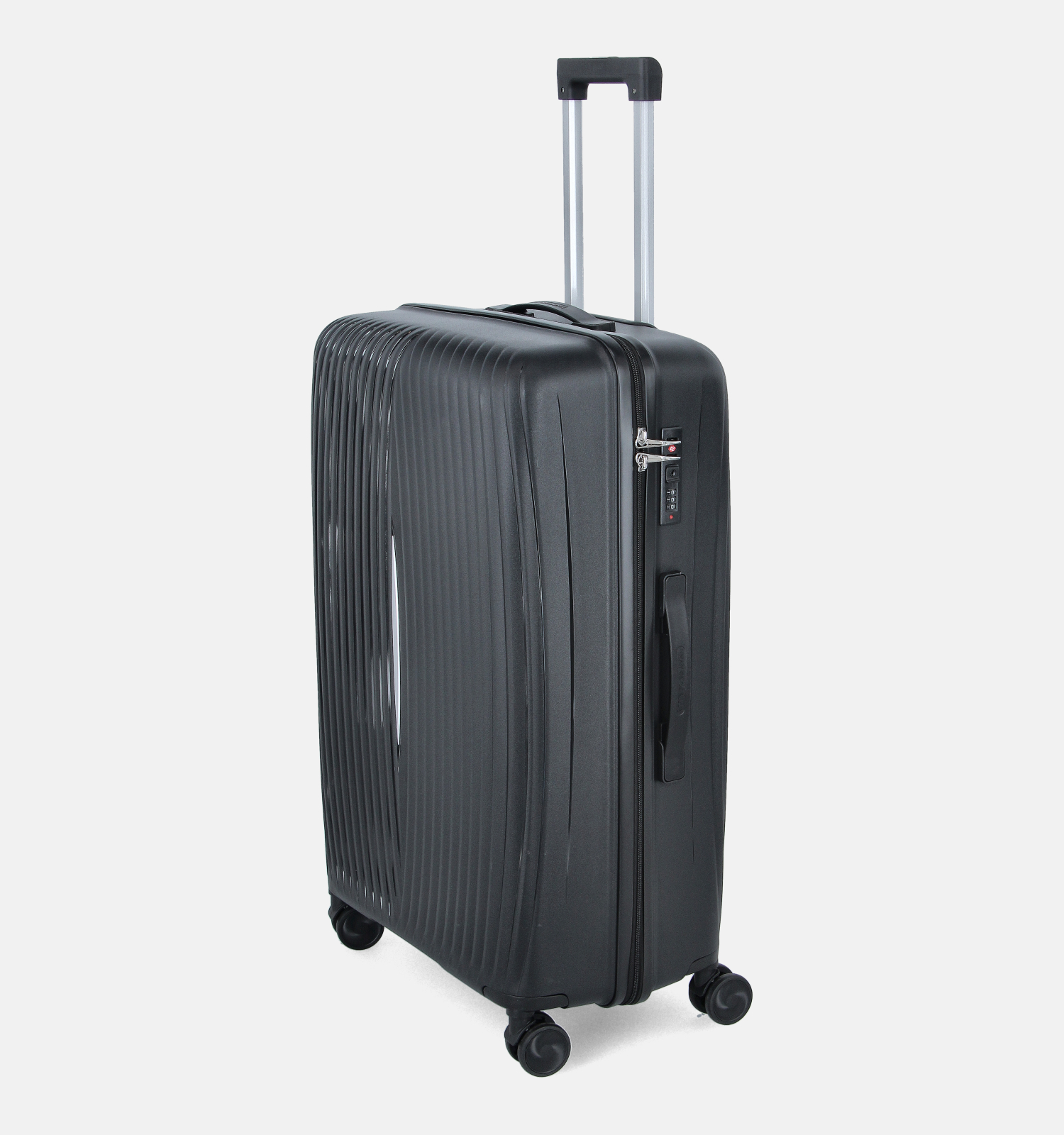 Deze large koffer is voorzien van vier versterkte wielen, een ritssluiting, een vast handvat en een telescopische handgreep die in- en uitschuifbaar is.