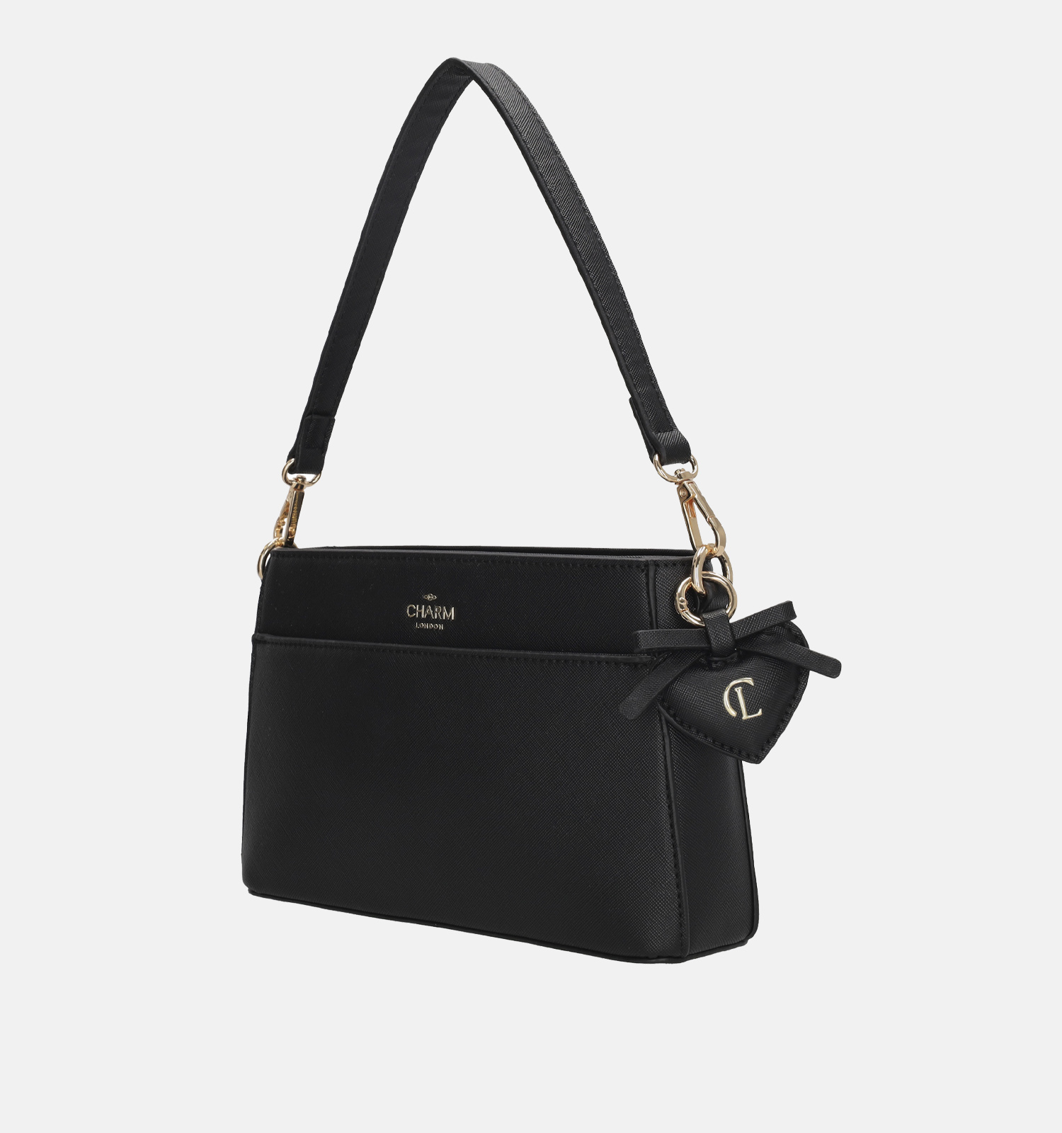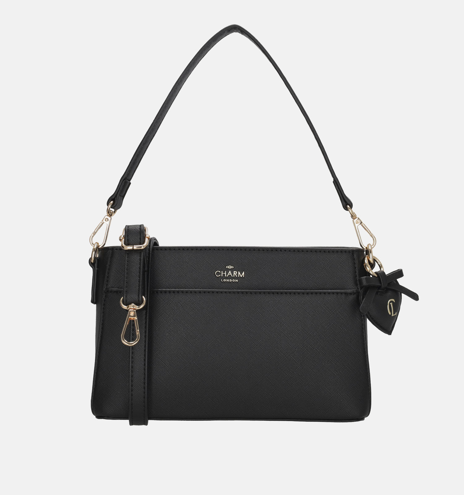 Deze zwarte schoudertas van Charm London is vervaardigd uit stevige materialen (zoals ) zodat de inhoud van de tas veilig opgeborgen blijft. Met als afmetingen 25 cm x 6 cm x 15 cm heeft deze tas bovendien de perfecte middelmaat!