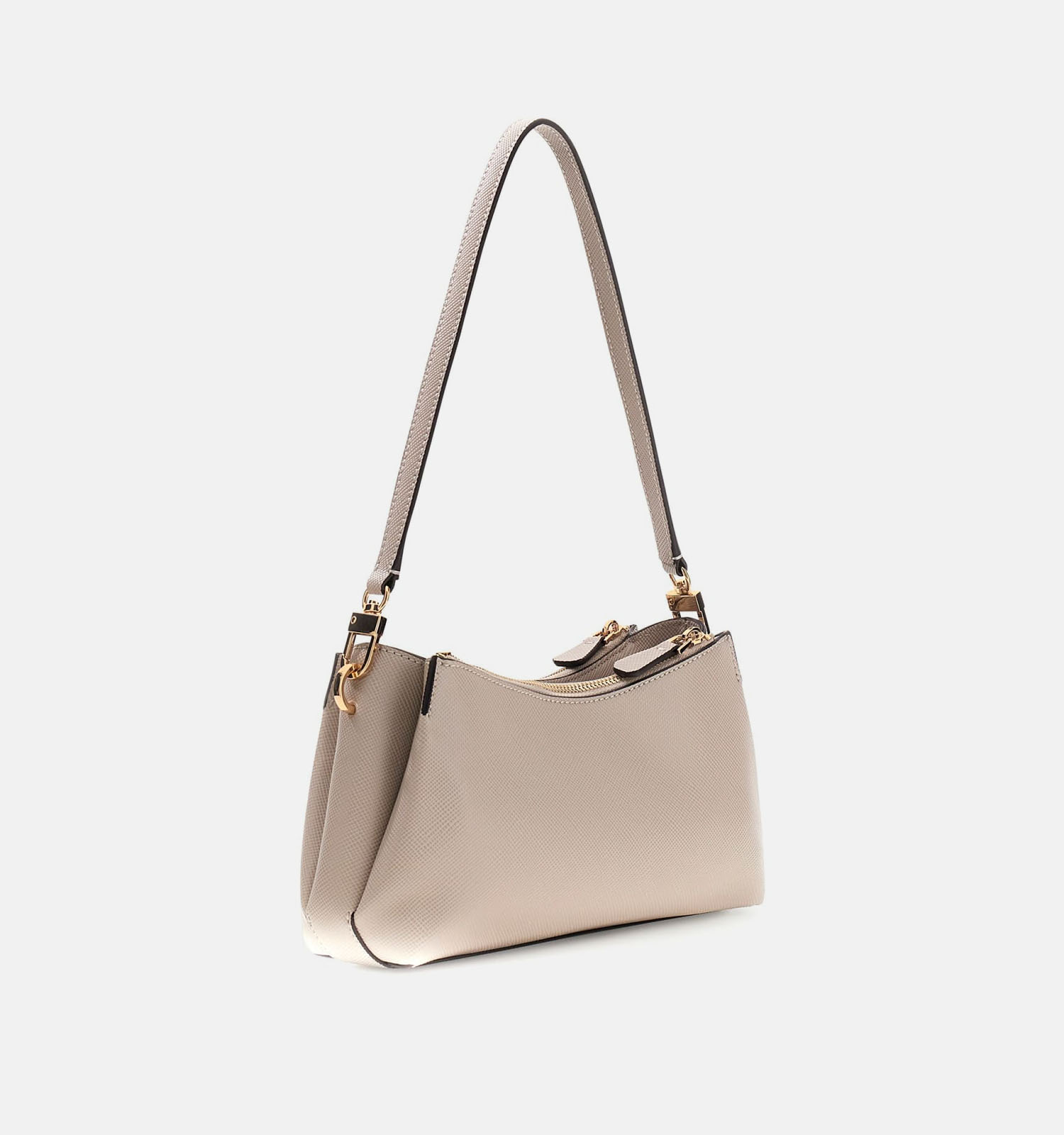 Deze schoudertas van het merk Guess is vervaardigd uit stevige, kwaliteitsvolle materialen zoals kunstleer. Dat is natuurlijk mooi, maar het garandeert ook dat jouw spullen veilig opgeborgen zitten en jouw nieuwe tas lang zal meegaan. Match deze Guess schoudertas met accessoires in dezelfde, beige kleur (zoals bv. een broeksriem) voor een mooie, afgewerkte look.