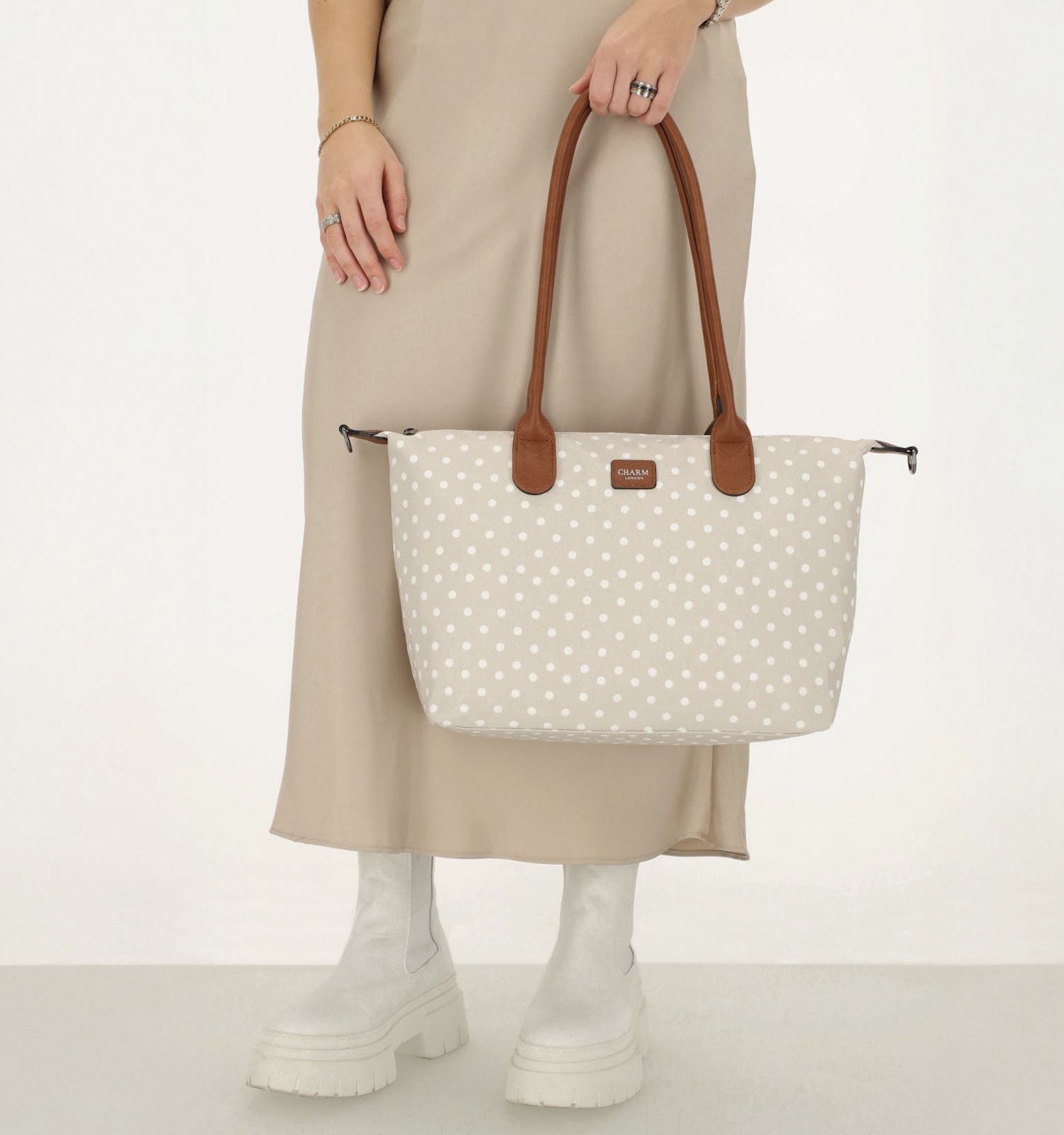 Charm London staat in de modewereld bekend om het gebruik van de meest kwalitatieve materialen, nauwkeurige afwerkingen en trendy designs. Dit materiaal (stof) zal, mits juist onderhoud, lang mooi blijven! Deze Charm London shopper in de kleur beige is afgewerkt met een stevige rits. Dat is nodig, want zo blijft inhoud van jouw tas altijd veilig en beschermd.