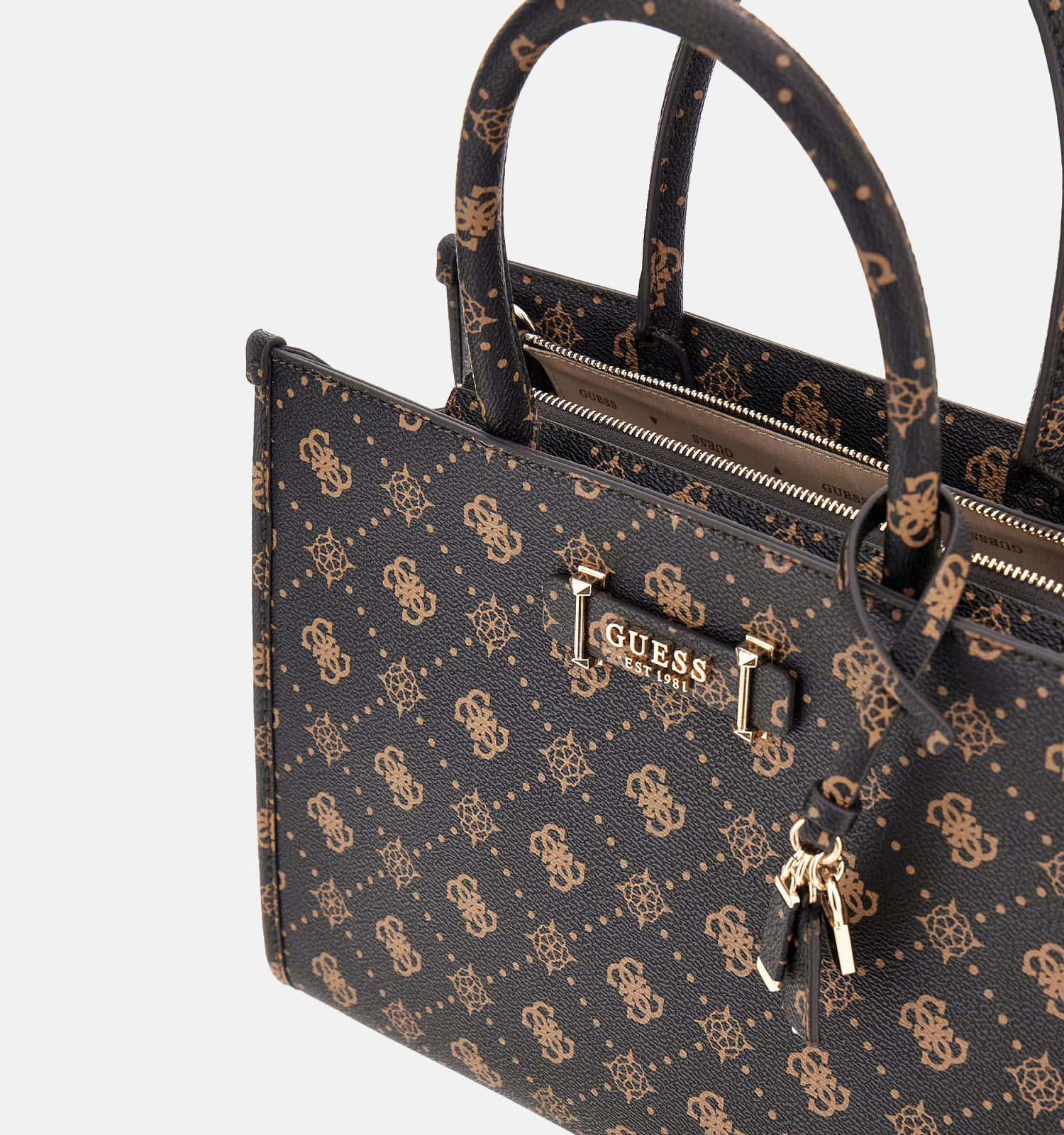 Een handtas moet vooral twee zaken zijn: functioneel en esthetisch mooi. Guess toont jou graag dit schoolvoorbeeld. Deze bruine handtas is, door de grootte van 34 cm op 13 cm op 26 cm, een eerder ruim exemplaar. Perfect voor iedereen die graag goed voorbereid de deur uit gaat! Er is plek voor alle extraatjes die je maar wil meenemen, zoals bv. een zonnebril, wat snacks en/of een kleine paraplu.