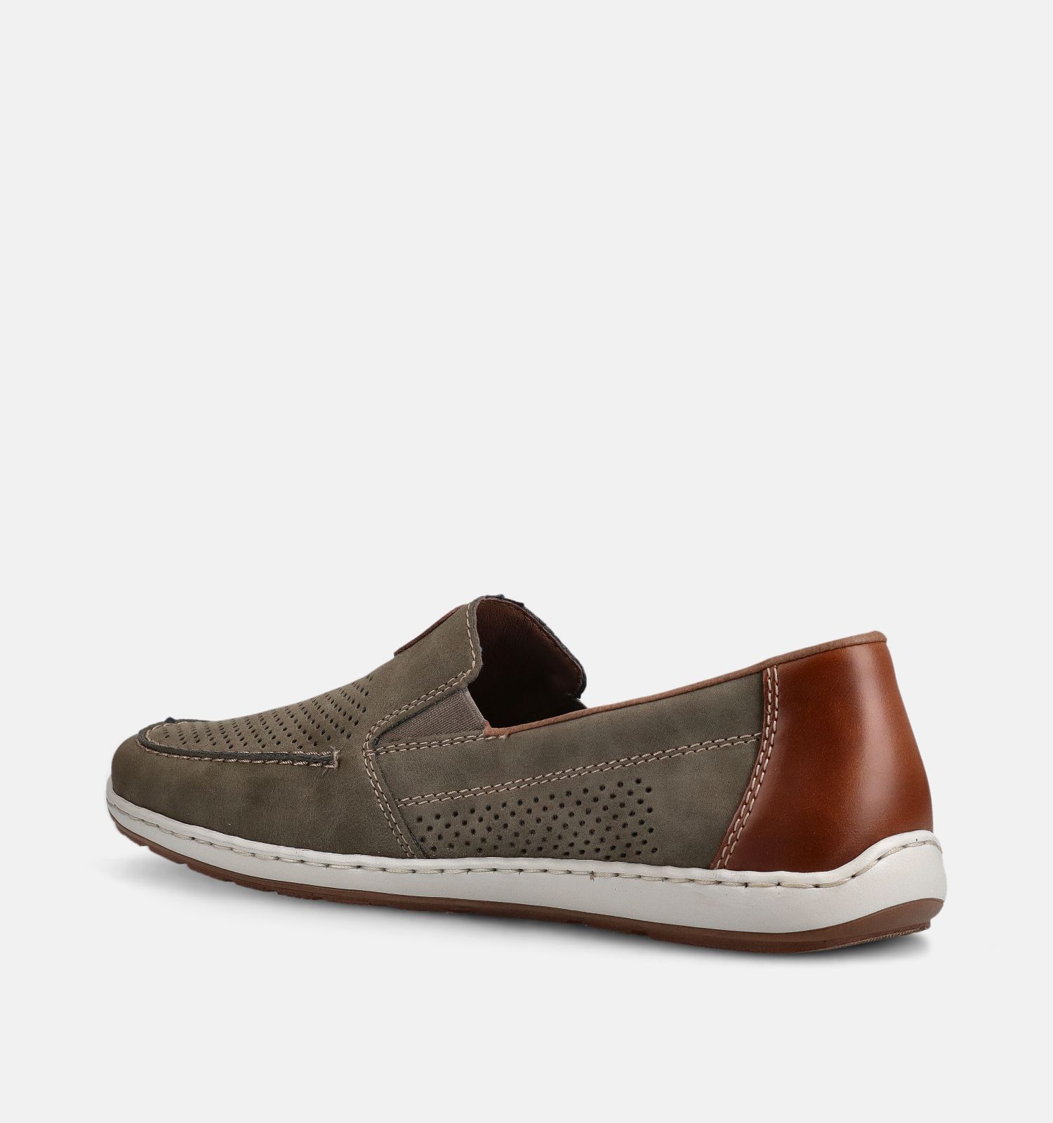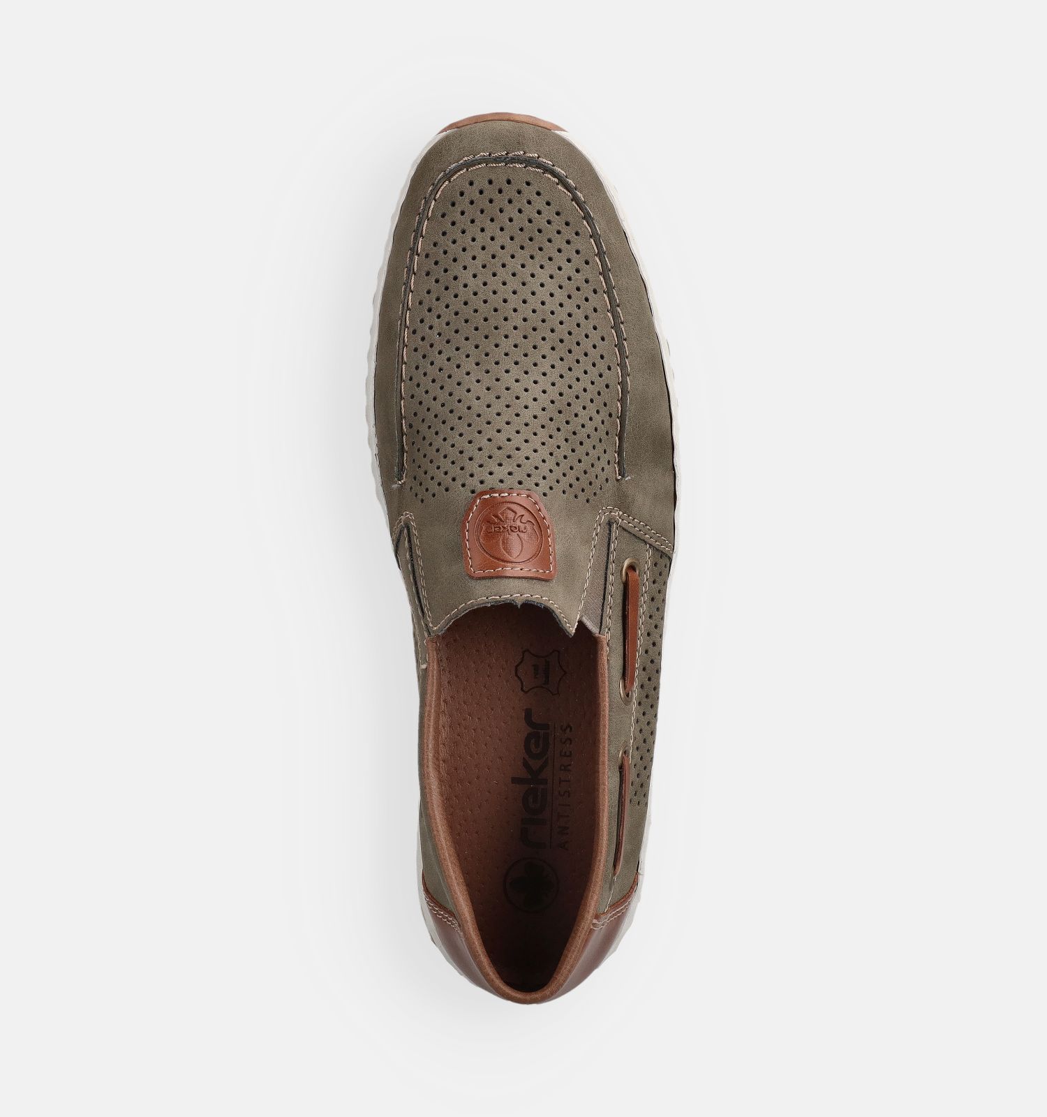 Deze lage schoenen voor heren zijn vervaardigd uit extra sterk kunstleer, met comfortabel kunstleer aan de binnenkant. Deze kwalitatieve materialen zijn licht qua gewicht, een antidotum tegen dat herkenbare gevoel dat jouw voeten na een tijd zwaar beginnen aan te voelen. Deze groene heren lage schoenen van Rieker hebben een instapsluiting.