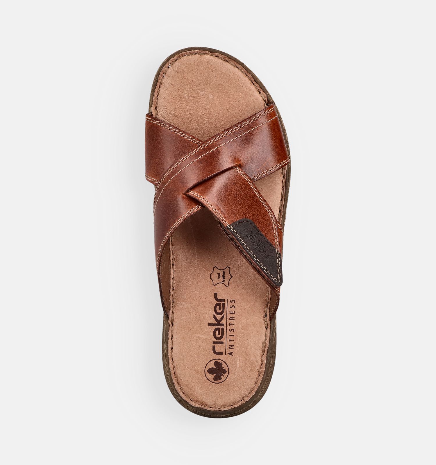 Comfortmerk Rieker maakt anti-stress herenschoenen die de wandelimpact op jouw lichaam sterk vermindert en de hele dag door optimaal comfort geven. Dit komt o.a. door de schokdempende schoenenzolen van deze herenslippers in de kleur cognac. Deze zolen absorberen de wandelschokken en verspreiden vervolgens de druk over de hele zool heen. De pasvorm van deze cognac slippers is ergonomisch en houdt rekening met het feit dat alle voeten licht opzwellen tegen het einde van de dag.