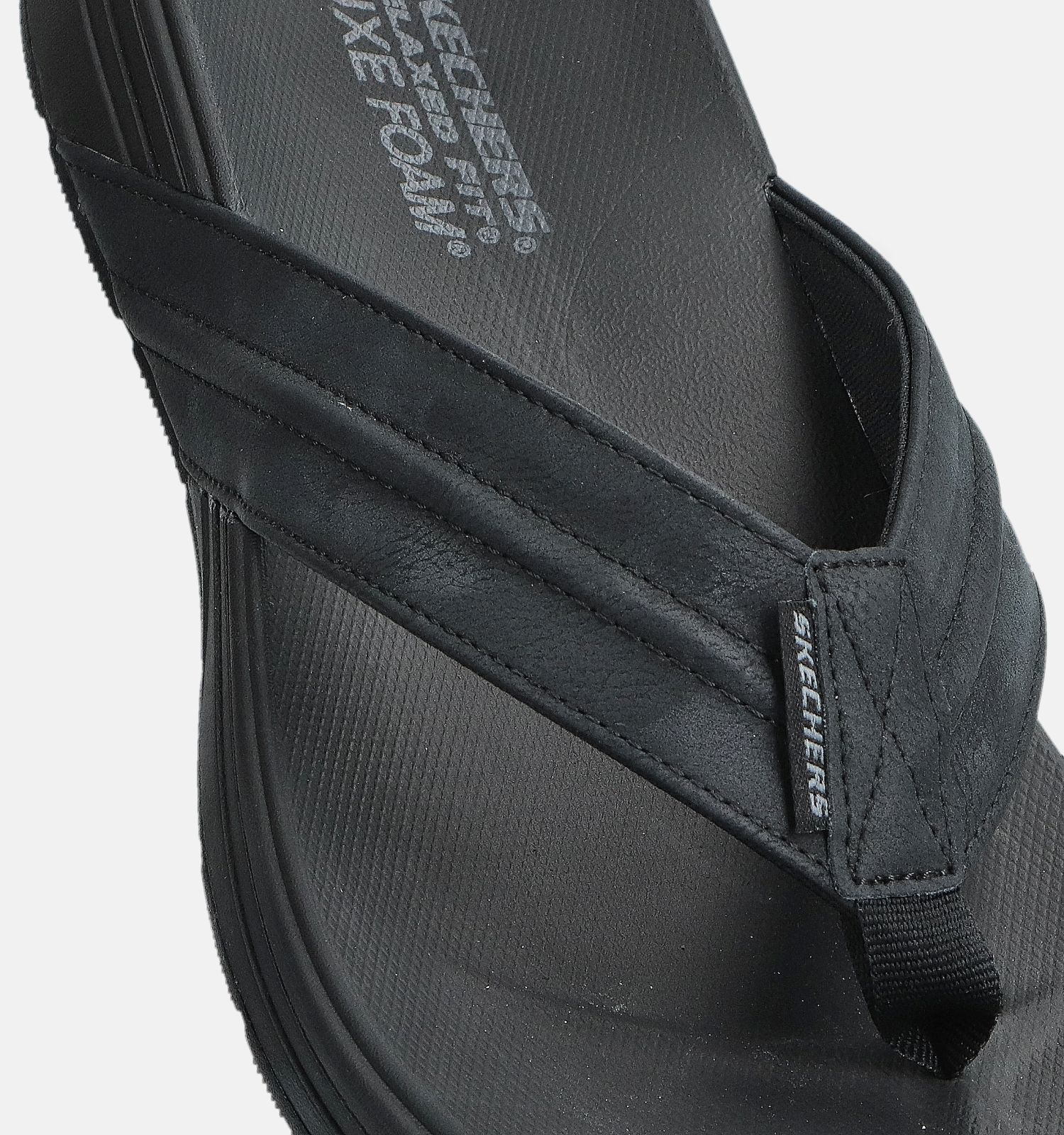 Deze herenslippers hebben anti-shockeigenschappen, ideaal voor vermoeide en zelfs pijnlijke voeten. Ook de semi-flexibele zolen van dit zwarte exemplaar, die meebuigen tijdens bewegingen, verlichten de wandelimpact. Goed om te weten naar onderhoud toe: deze zwarte Skechers slippers hebben een zachte binnenkant van stof. Het extra stevige buitenmateriaal is vervaardigd uit kunstleer.
