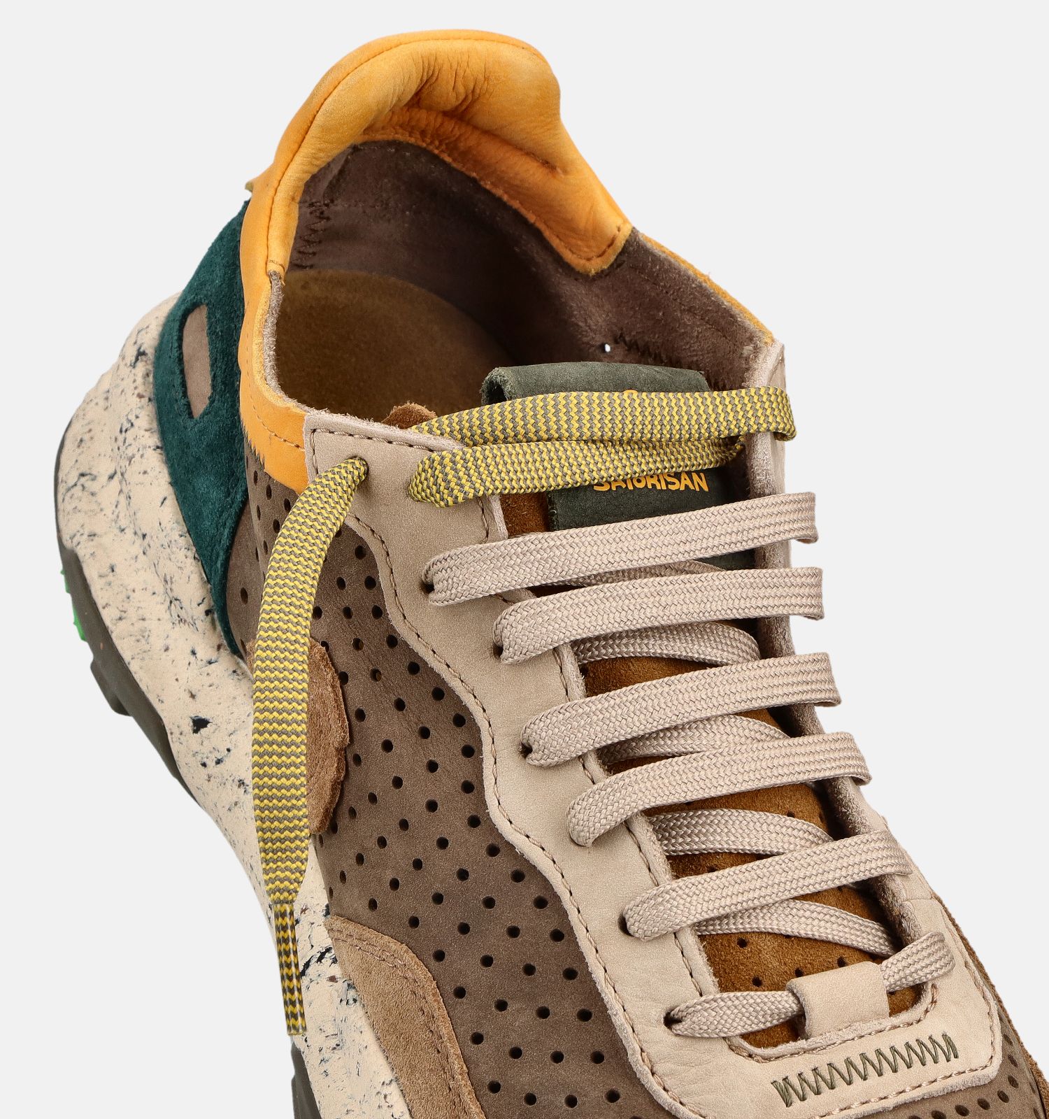 Een tip: pas deze bruine Satorisan sneakers op het einde van de dag. Herenvoeten zwellen namelijk in de loop van de dag. Als deze Satorisan herensneakers 's avonds perfect passen, dan ben je honderd procent zeker dat je de juiste schoenmaat gekozen hebt!