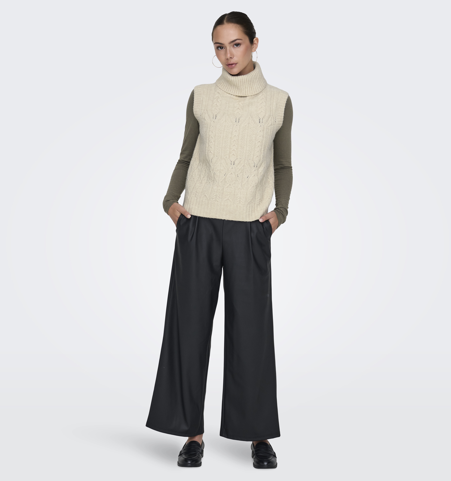 Een andere trendy combinatie is deze trui over een jurk. Trek jouw favoriet kleedje aan en doe vervolgens een fijne broeksriem op de hoogte waar jij deze JDY trui wil laten eindigen. Dat is een kwestie van smaak: dat kan in jouw taille zijn, net boven de heupen of ergens daartussen. De onderkant van de JDY trui (ver)stop je vervolgens achter de riem, en de bovenkant blouse je zo op. Het resultaat? Jij ziet er extra stylish uit!
