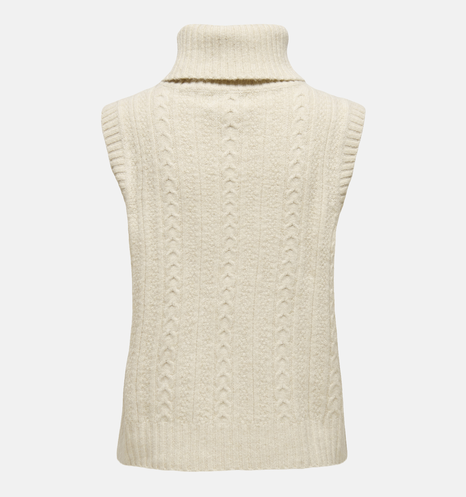 Deze damestrui in de kleur beige heeft een rolkraag, en geen mouwen. De truilengte is cm bij maat .