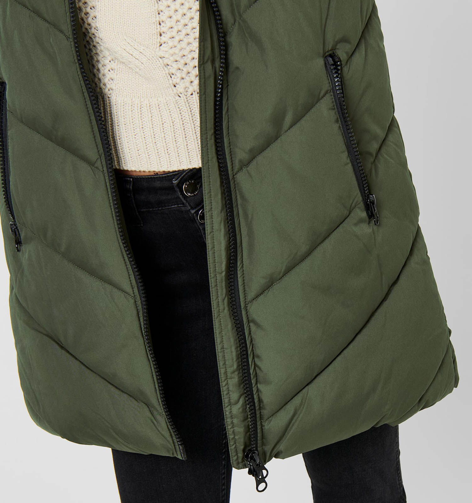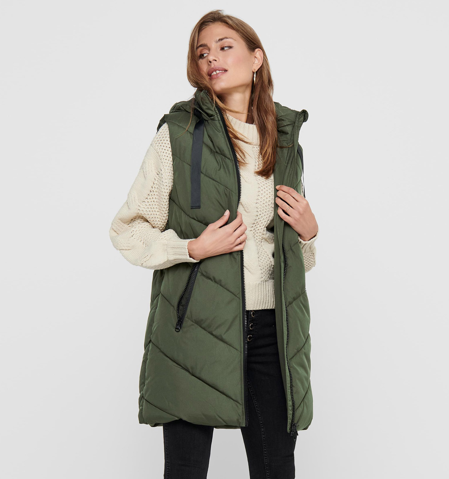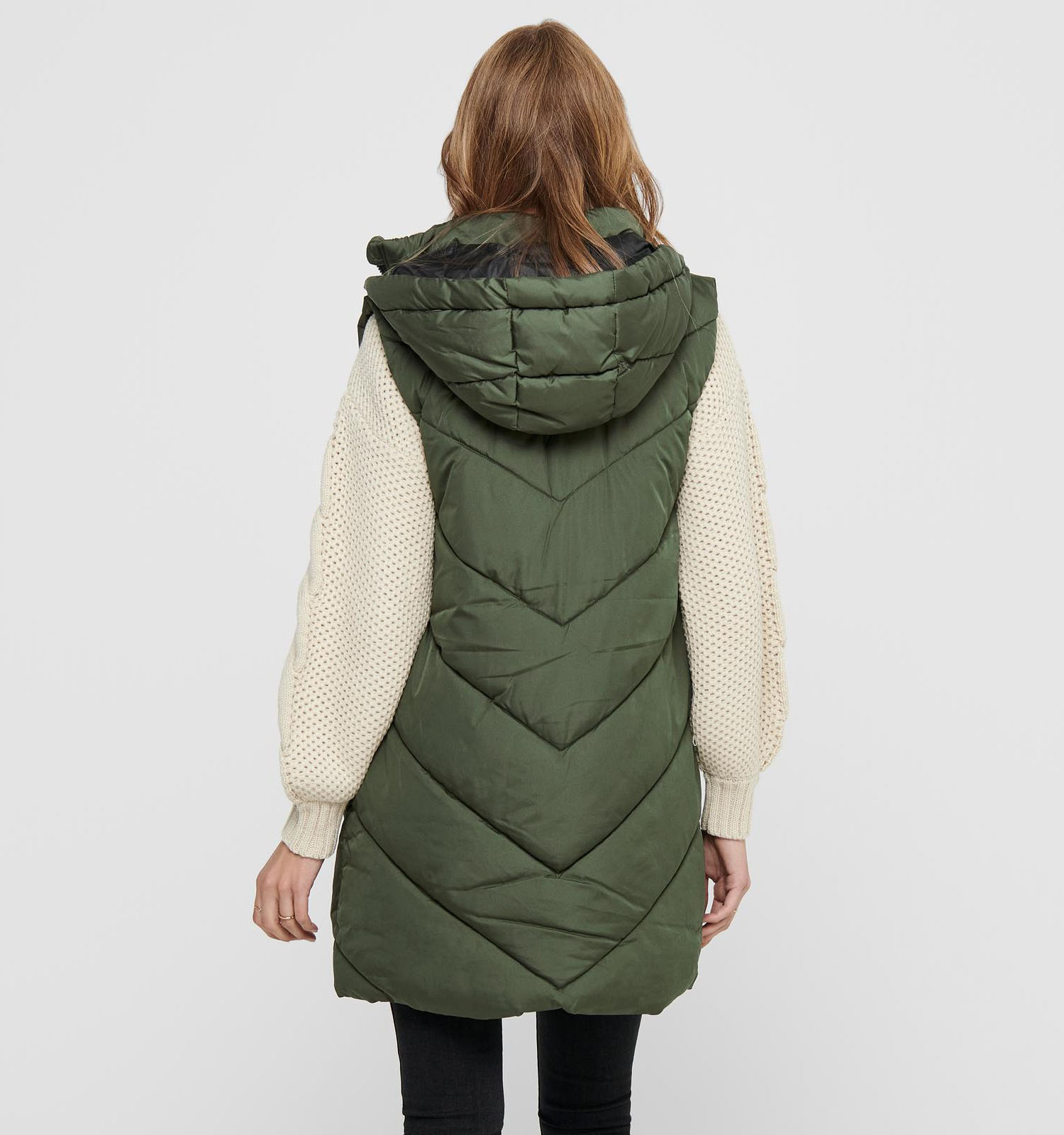 Deze leuke JDY jas heeft geen mouwen. Deze mouwen kan je eventueel een slag oprollen. Een hippe sjaal, eventueel eentje waar diezelfde groene kleur in terugkomt, kan het geheel afwerken!