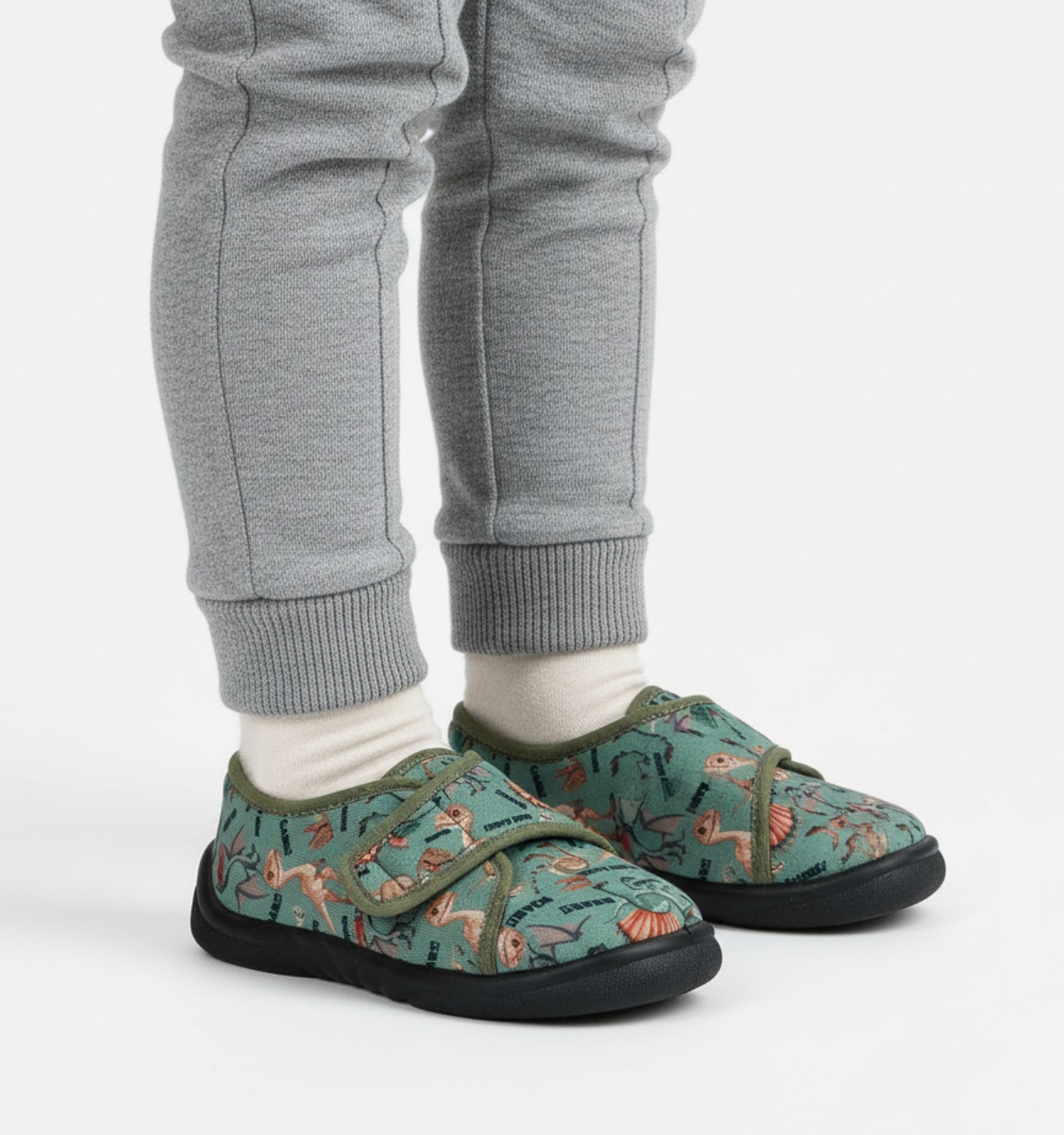 Deze groene jongenspantoffels hebben een ritssluiting, zodat jongens deze makkelijk kunnen aan- en uittrekken.
