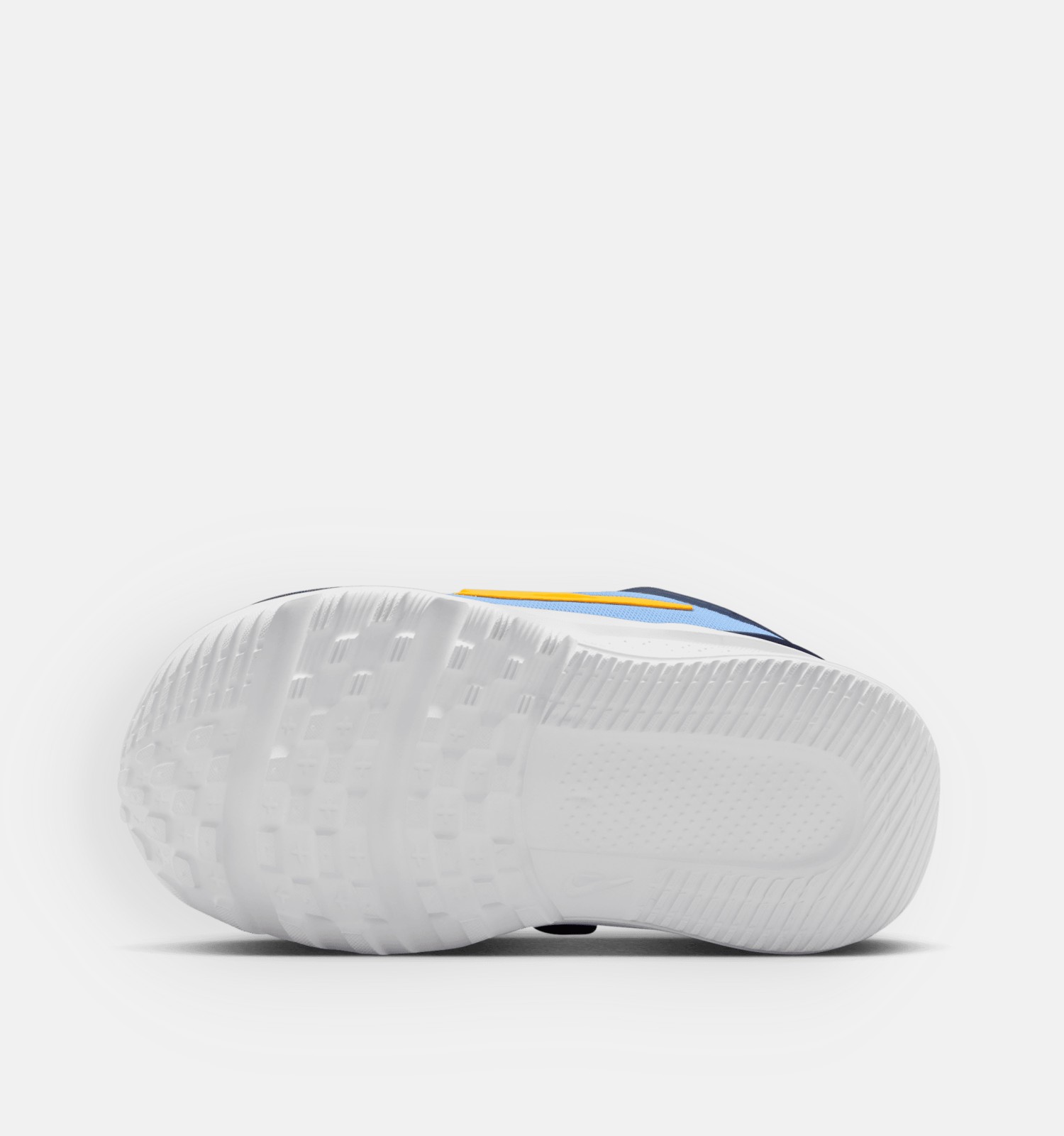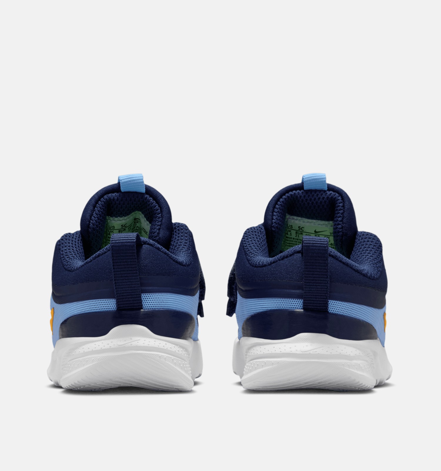 Deze Nike Star Runner sneakers hebben een ademende binnenkant van stof, met aan de buitenkant sterk kunstleer, stof. Het is belangrijk dat deze Nikes goed aanpassen: kies dus de schoenmaat waar de tenen nog genoeg beweegruimte hebben. Dit check je het best door te voelen ter hoogte van de schoenneus als het kind deze blauwe Nike Star Runner sneakers aanheeft.