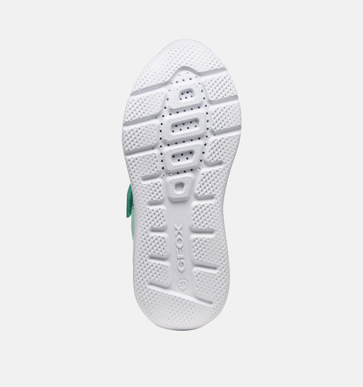 Deze coole sneakers voor meisjes zien er niet alleen keileuk uit, ze hebben ook nog eens een hoog comfortlevel! Deze groene meisjessneakers hebben de gepatenteerde Geox-zolen, waardoor zweet wordt afgevoerd via microgaatjes in de buitenzolen. Zo blijven kindervoeten de hele dag lang droog, zelfs tijdens het rennen, klimmen, spelen en springen! Door het comfort van deze ademende kindersneakers voor meisjes is geen avontuur te gek meer. Je zal voelen dat de hiel van deze Geox sneakers licht verstevigd is. Dat houdt de voeten waar ze horen, en vermindert de kans op het omslagen van de voeten.