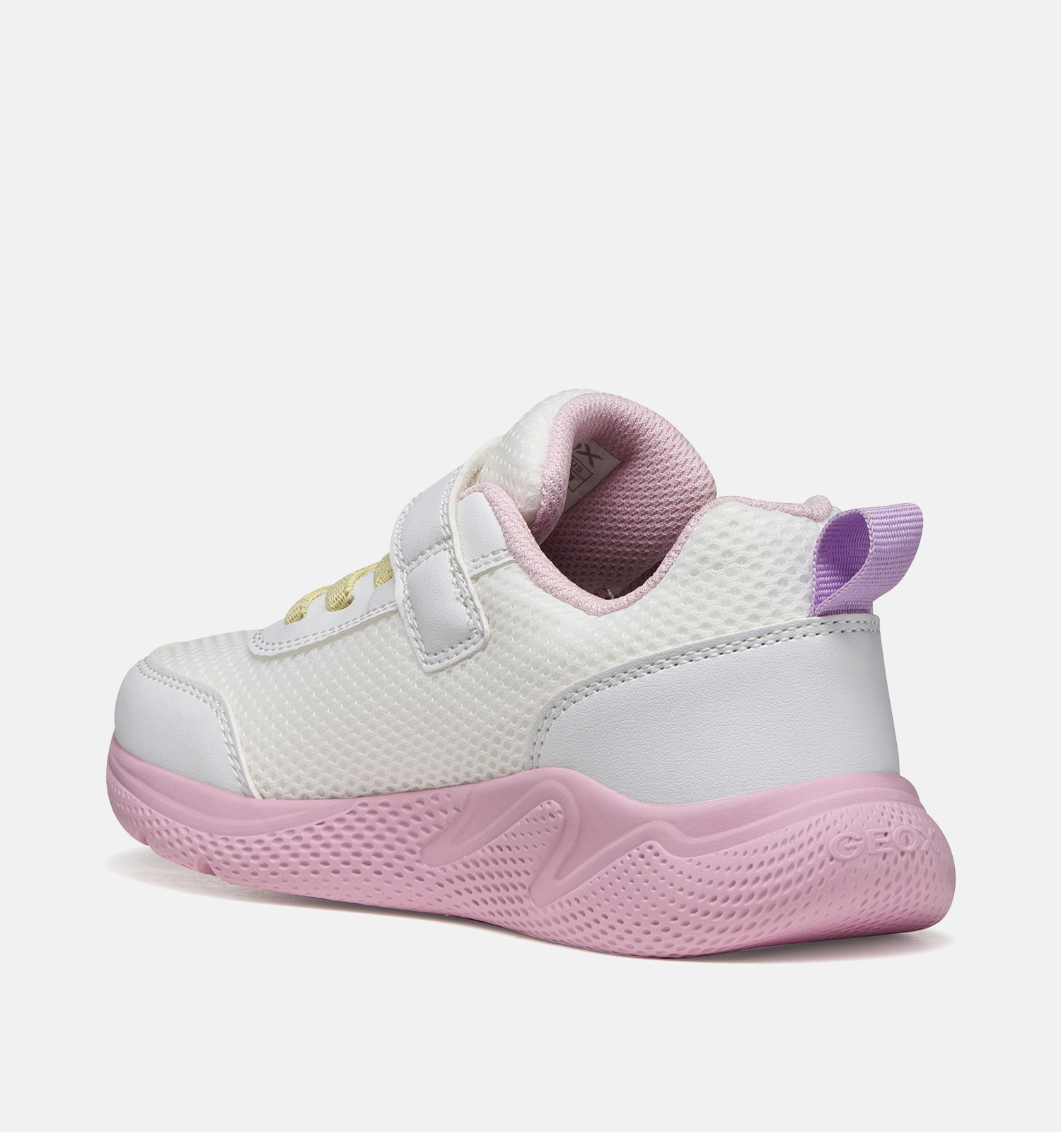 Deze coole sneakers voor meisjes zien er niet alleen keileuk uit, ze hebben ook nog eens een hoog comfortlevel! Deze witte meisjessneakers hebben de gepatenteerde Geox-zolen, waardoor zweet wordt afgevoerd via microgaatjes in de buitenzolen. Zo blijven kindervoeten de hele dag lang droog, zelfs tijdens het rennen, klimmen, spelen en springen! Door het comfort van deze ademende kindersneakers voor meisjes is geen avontuur te gek meer. Je zal voelen dat de hiel van deze Geox sneakers licht verstevigd is. Dat houdt de voeten waar ze horen, en vermindert de kans op het omslagen van de voeten.