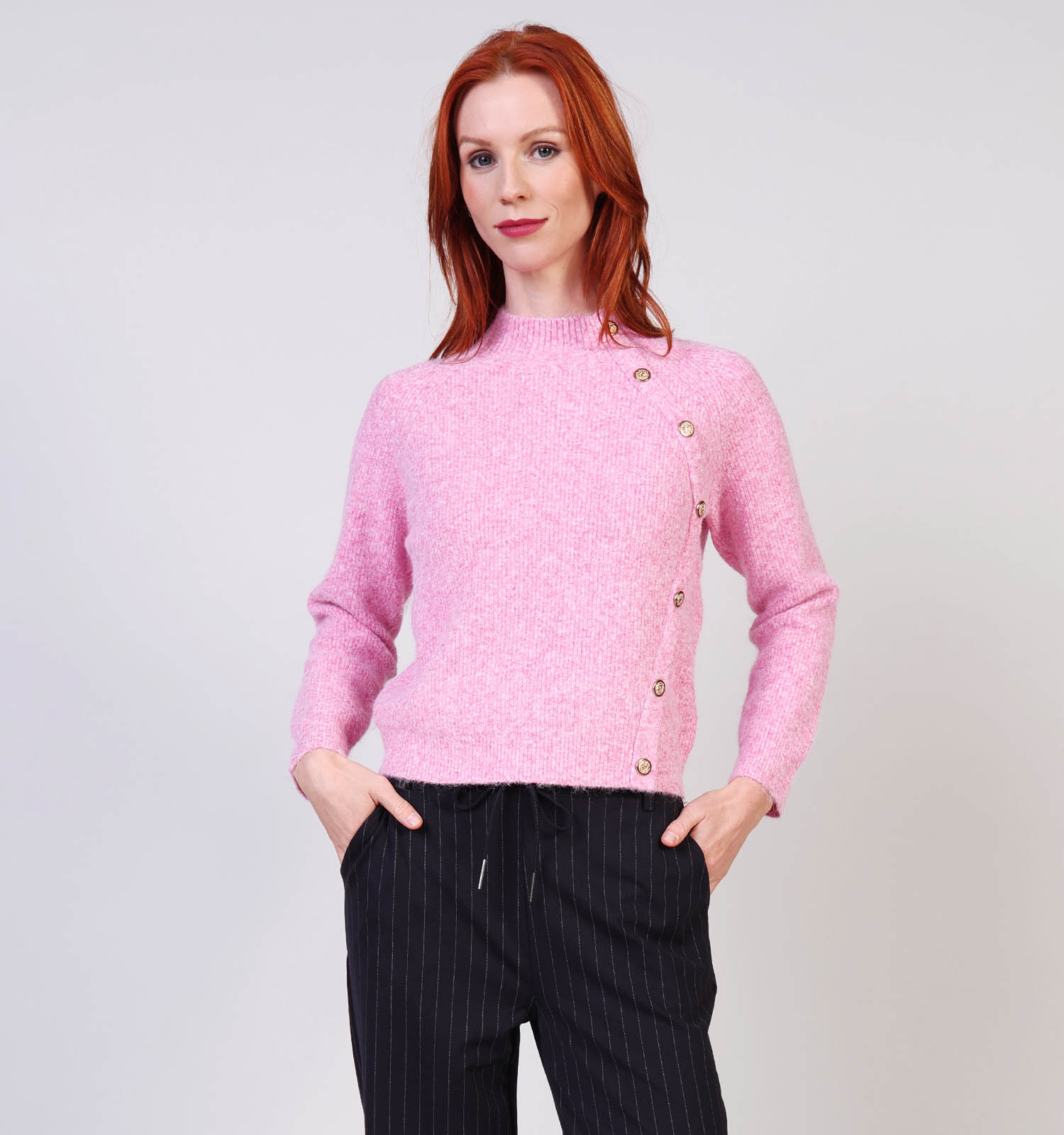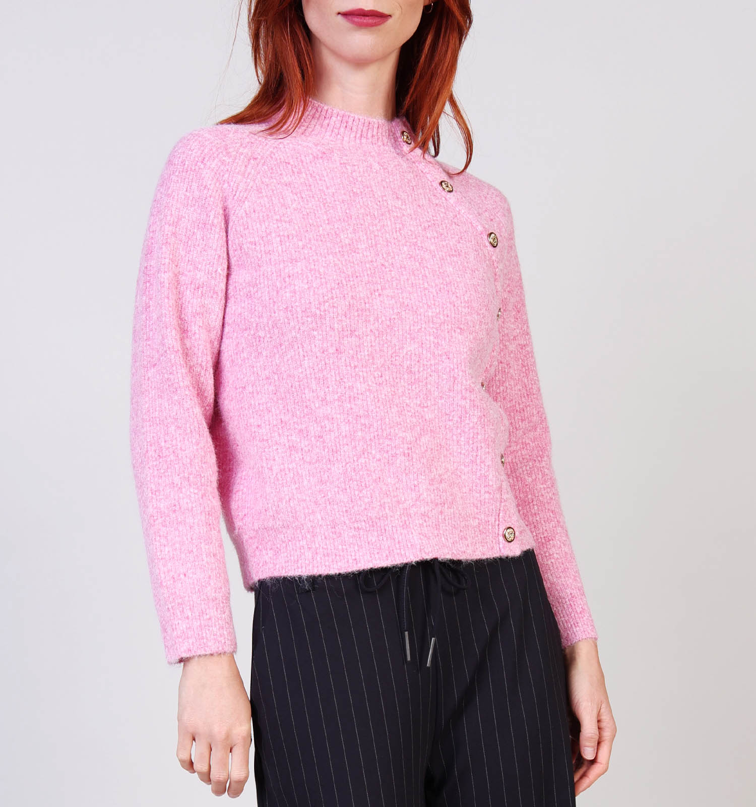 Deze damestrui in de kleur roze heeft een opstaande kraag en lange mouwen.