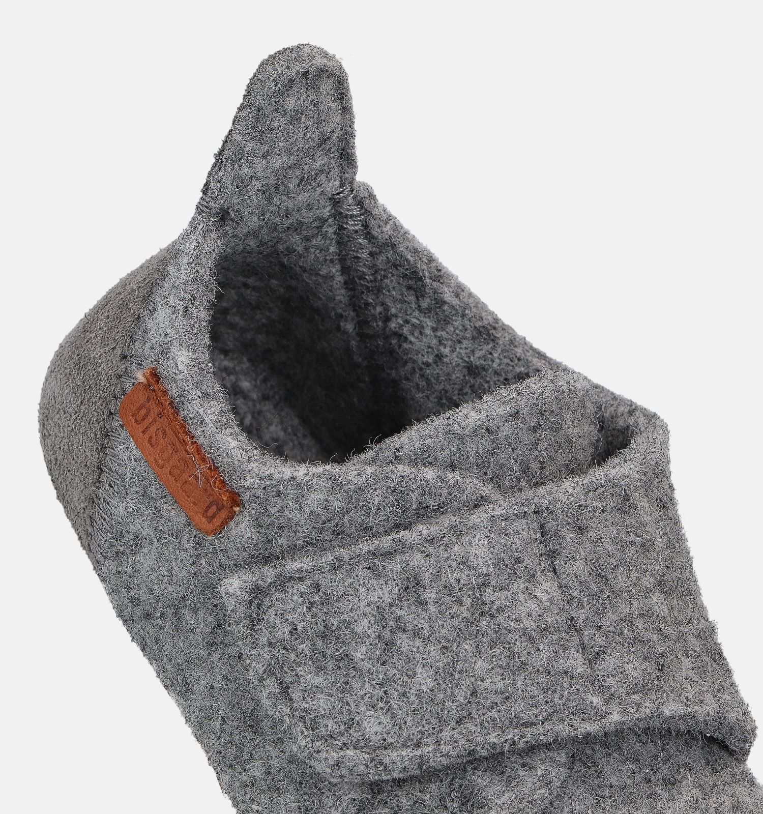 Deze grijze jongenspantoffels hebben een velcrosluiting, zodat jongens deze makkelijk kunnen aan- en uittrekken.